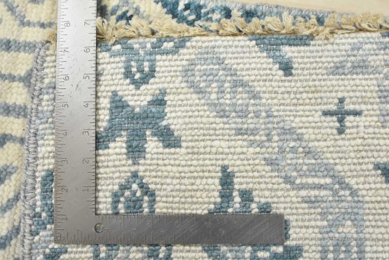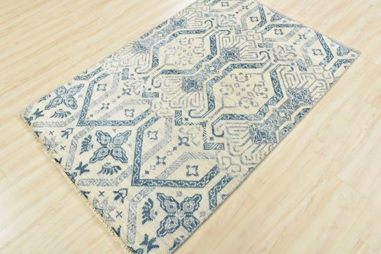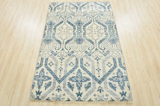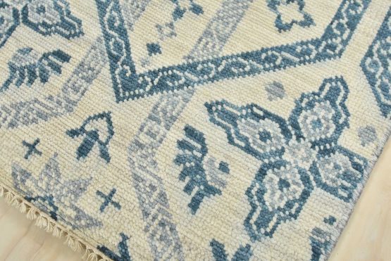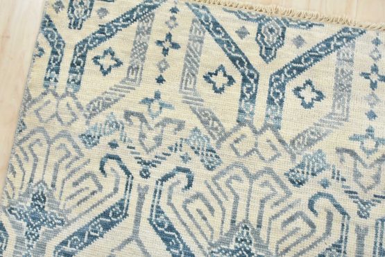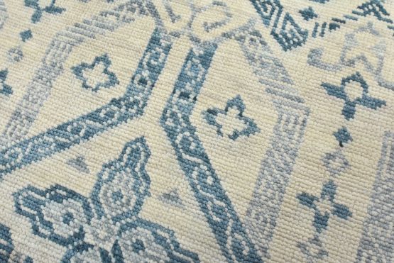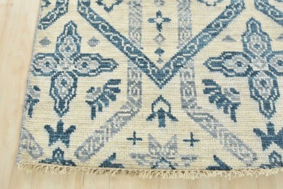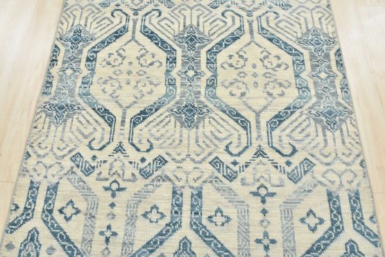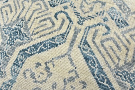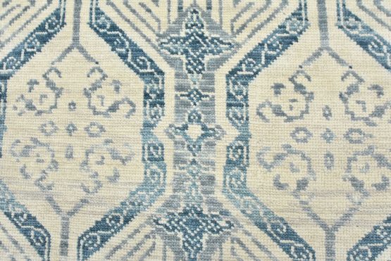 A modern Oriental rug hand-knotted with an all-wool pile on a cotton foundation. This area rug features a geometric design set against an ivory background. It is new and in excellent condition.