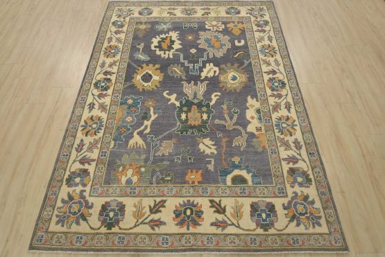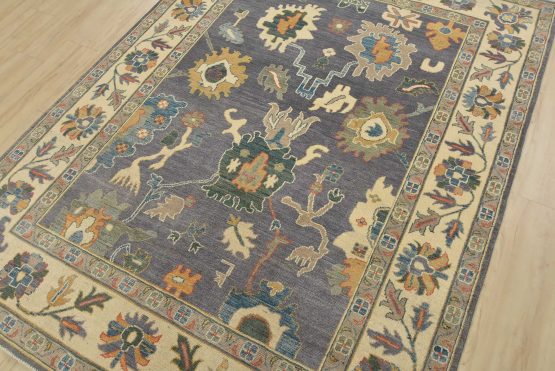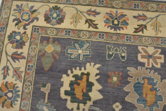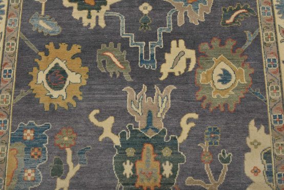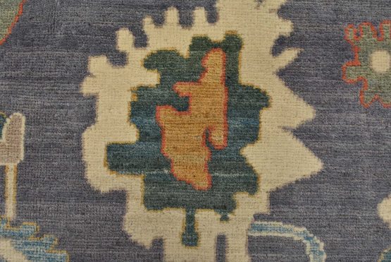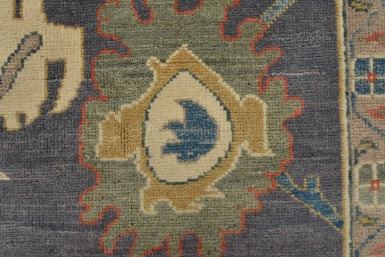 A traditional Anatolia rug hand-knotted with an all-wool pile on a cotton foundation. This finely woven oriental rug features an all-over botanical design set against a purple background. It is new and in excellent condition.