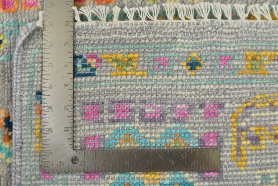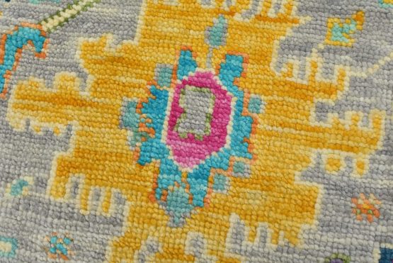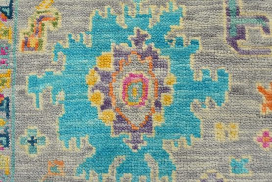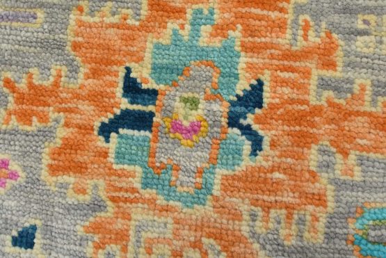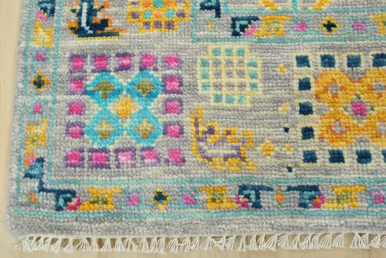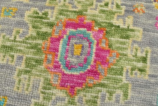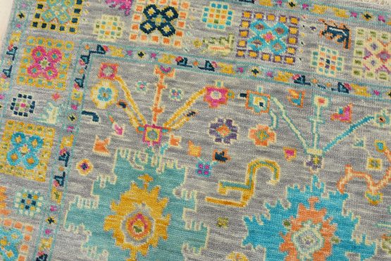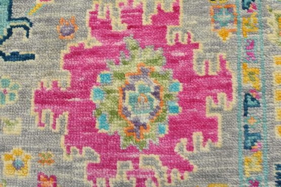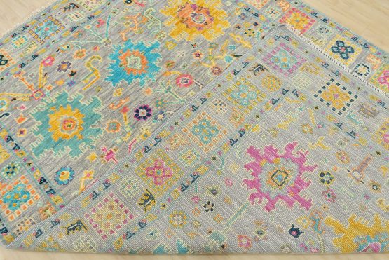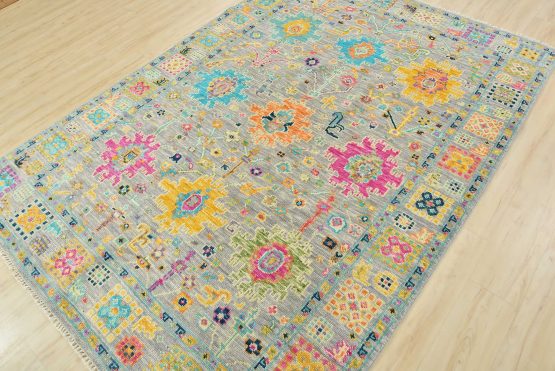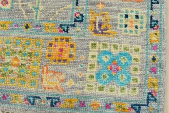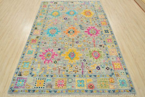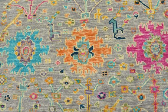 A modern traditional Anatolia rug hand-knotted with an all-wool pile on a cotton foundation. This oriental rug features a botanical design in vibrant colors set against a gray background. It is new and in excellent condition.