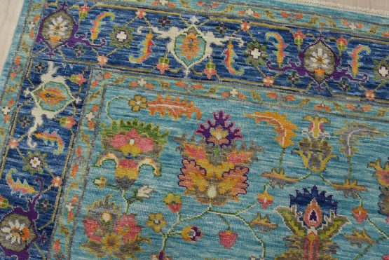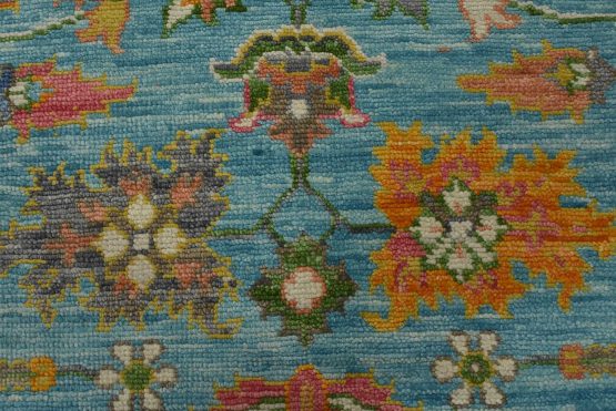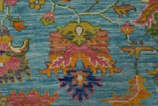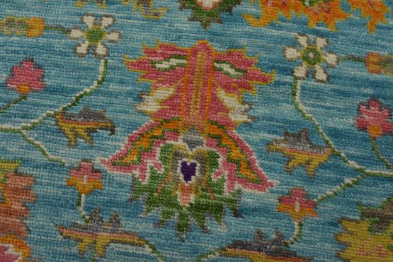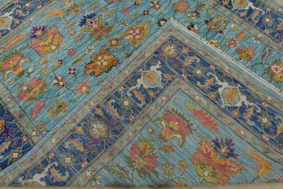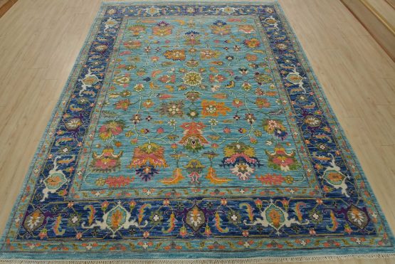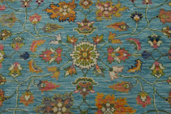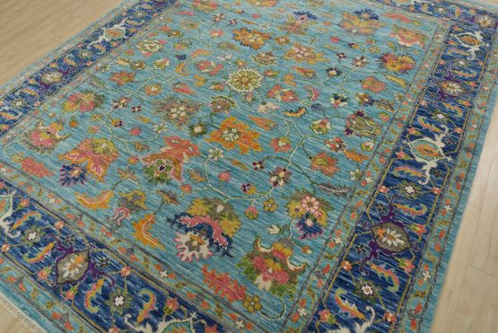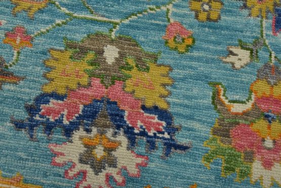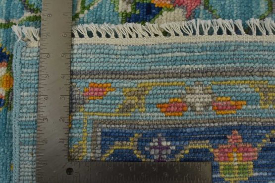 A modern traditional Anatolia rug hand-knotted with an all-wool pile on a cotton foundation. This oriental rug features an all-over botanical design set against a light blue background. It is new and in excellent condition.