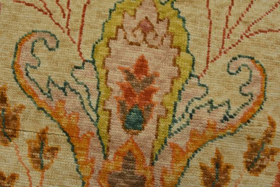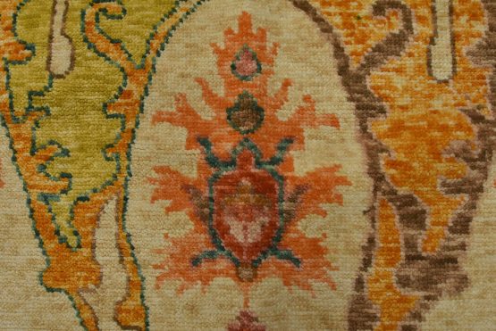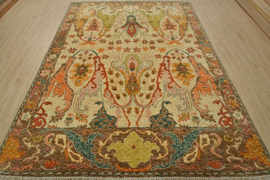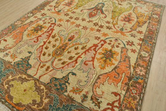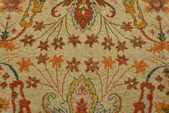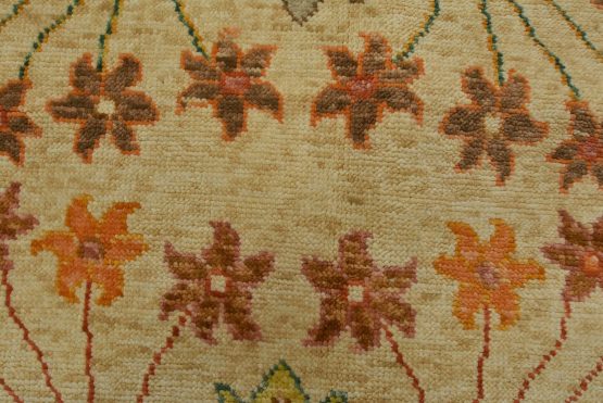 A traditional Anatolia rug hand-knotted with an all-wool pile on a cotton foundation. This oriental rug features an all-over botanical design set against a beige background. It is new and in excellent condition.