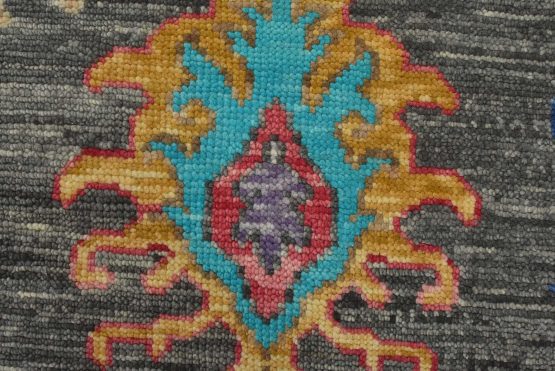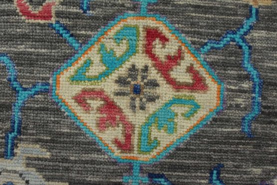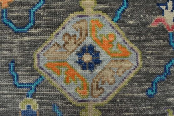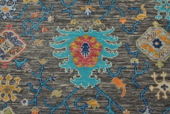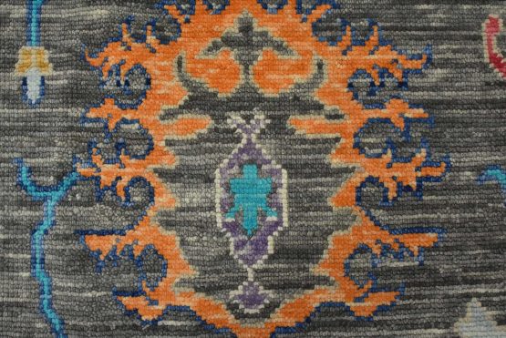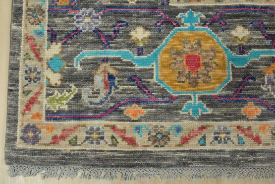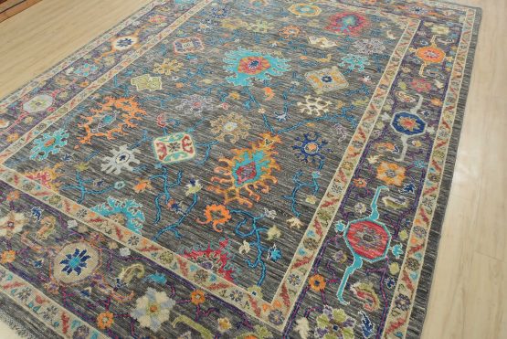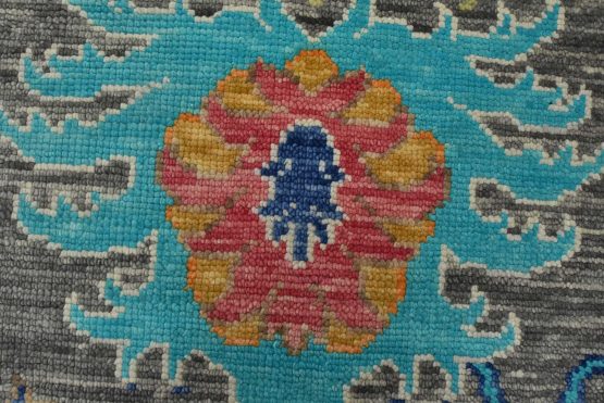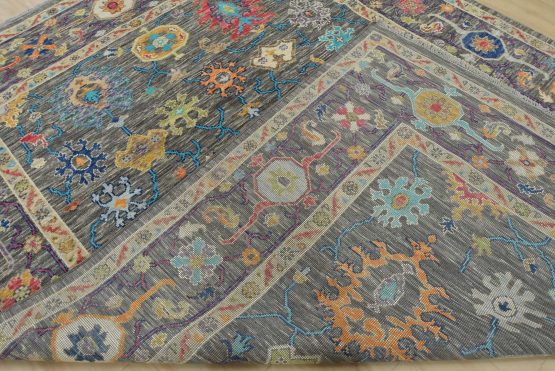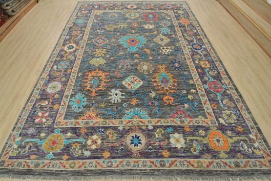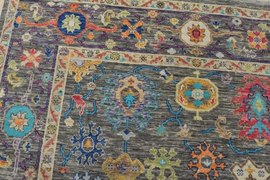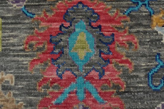 A modern traditional Anatolia rug hand-knotted with an all-wool pile on a cotton foundation. This oriental rug features a vibrant all-over botanical design set against a gray background. It is new and in excellent condition.