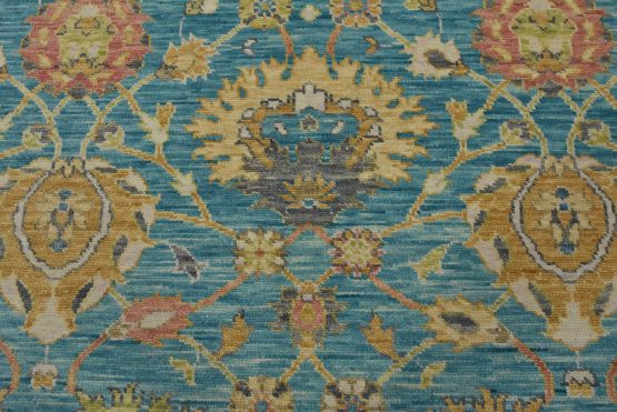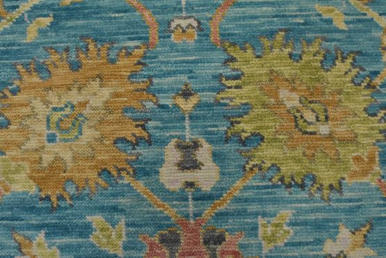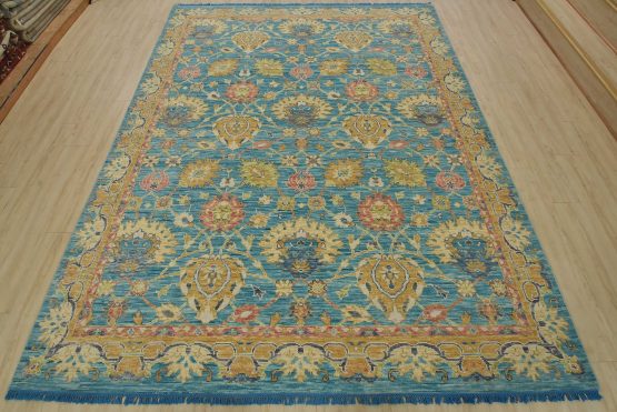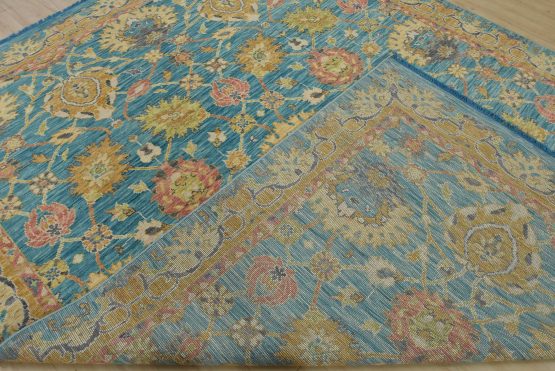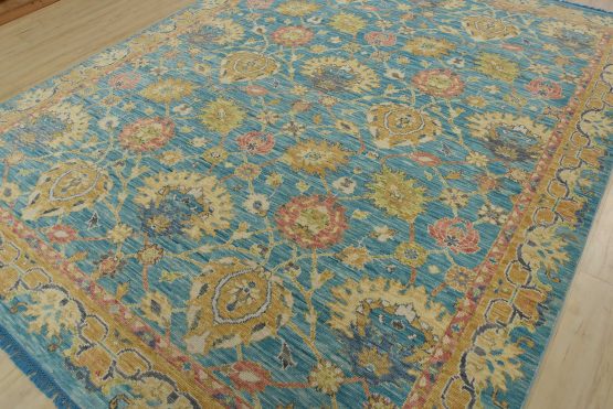 A modern traditional Anatolia rug hand-knotted with an all-wool pile on a cotton foundation. This oriental rug features an all-over botanical design set against a blue background. It is new and in excellent condition.