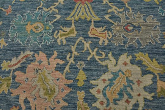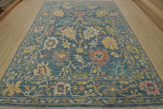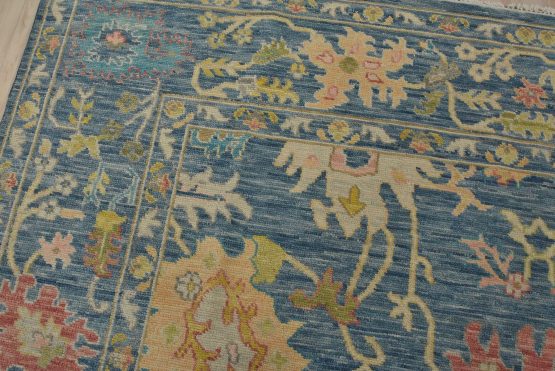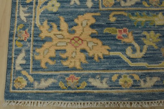 A modern traditional Anatolia rug hand-knotted with an all-wool pile on a cotton foundation. This oriental rug features an all-over botanical design set against a blue background. It is new and in excellent condition.