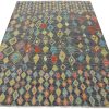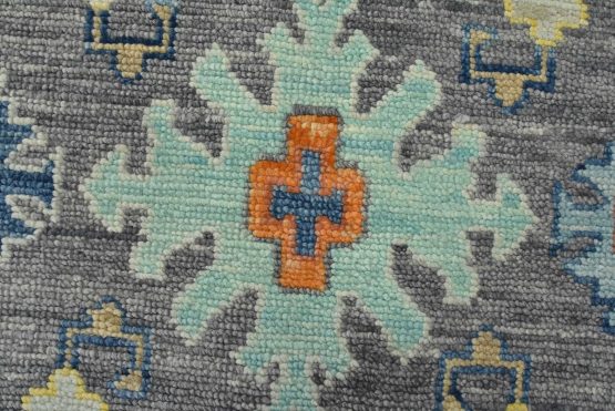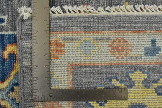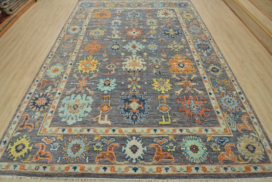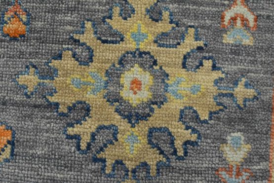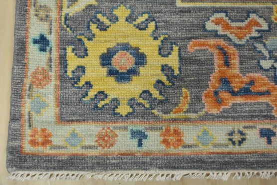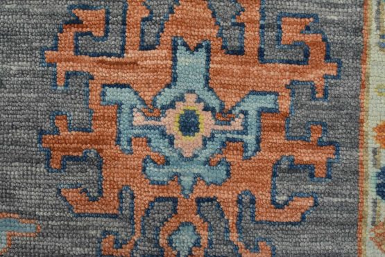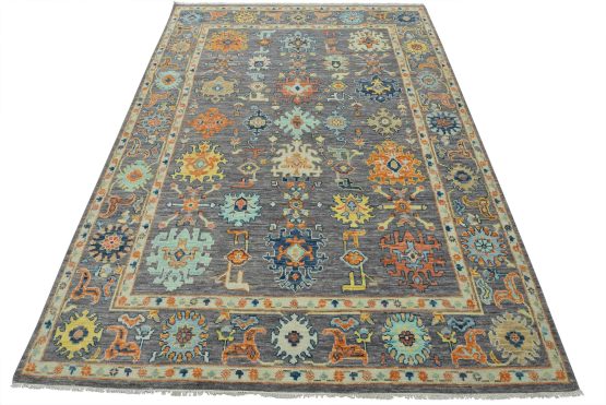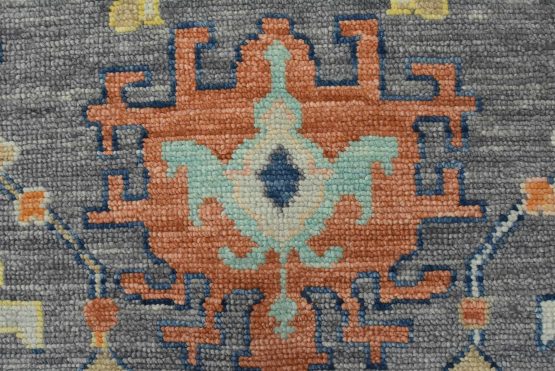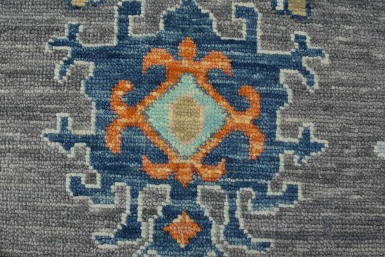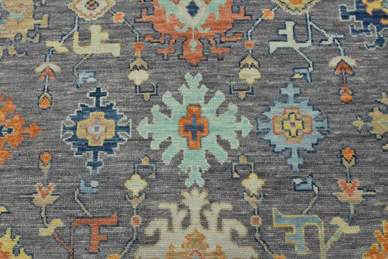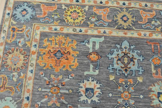 A modern traditional Anatolia rug hand-knotted with an all-wool pile on a cotton foundation. This oriental rug features rows of geometric botanical motifs set against a gray background. It is new and in excellent condition.