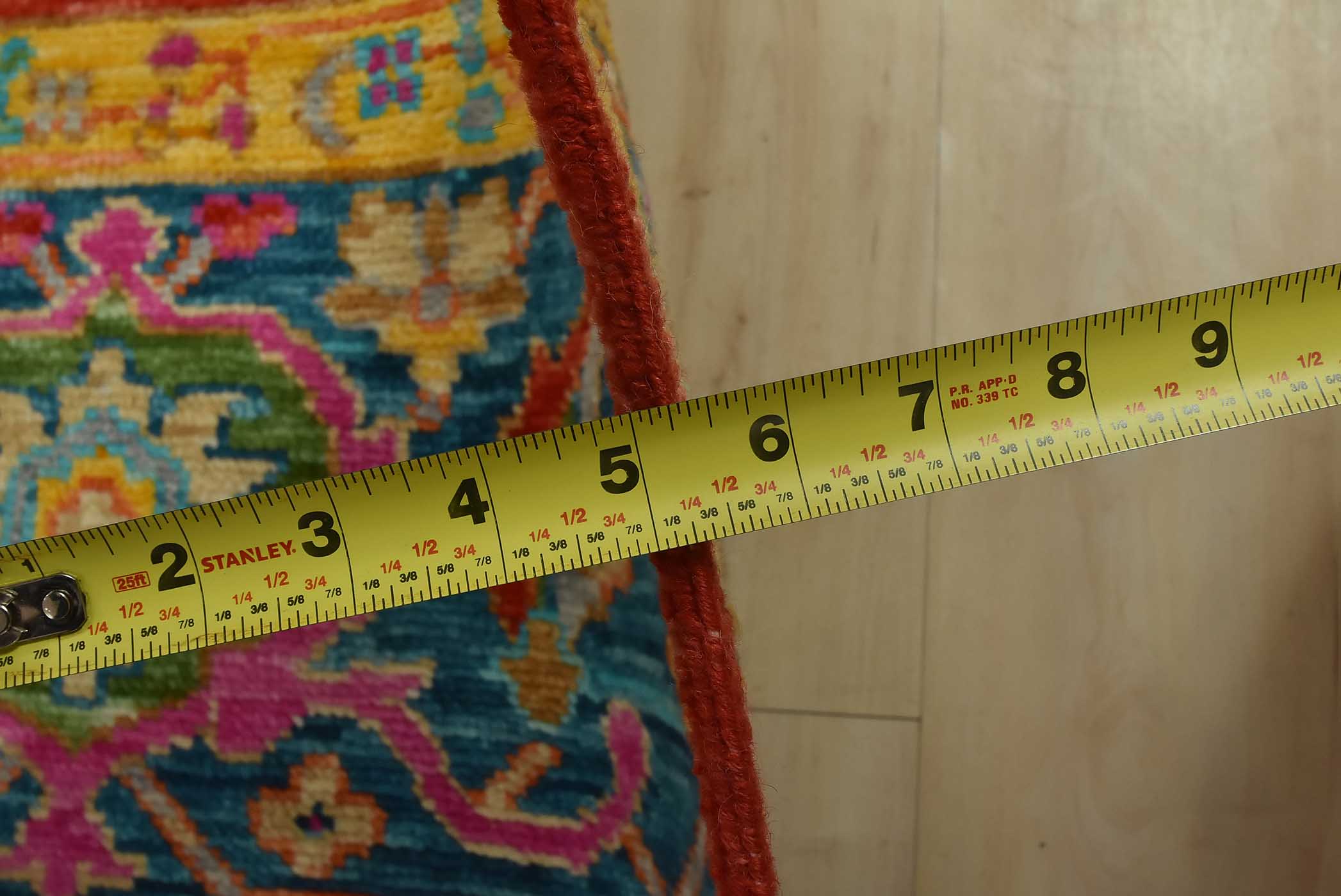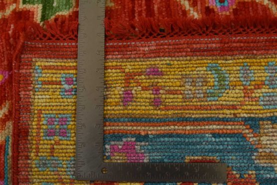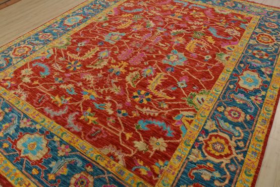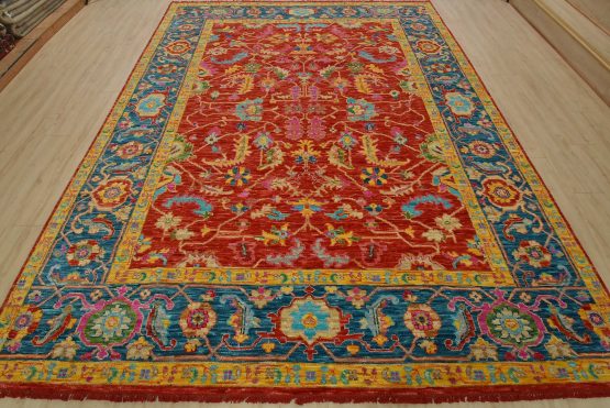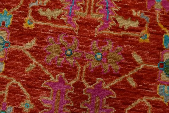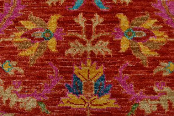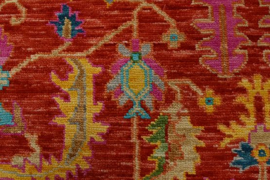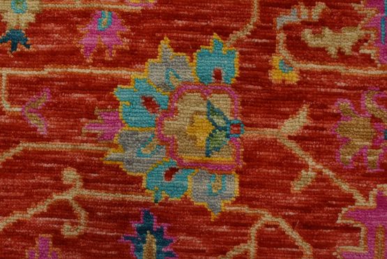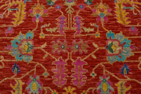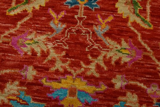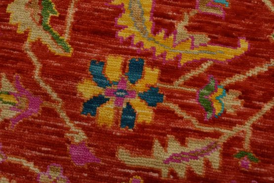 A modern traditional Anatolia rug hand-knotted with an all-wool pile on a cotton foundation. This oriental rug features an all-over botanical design set against a red background. It is new and in excellent condition.