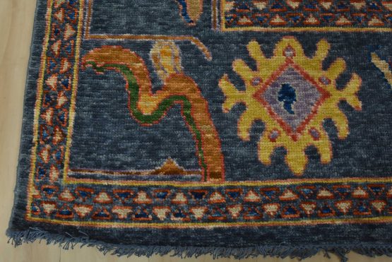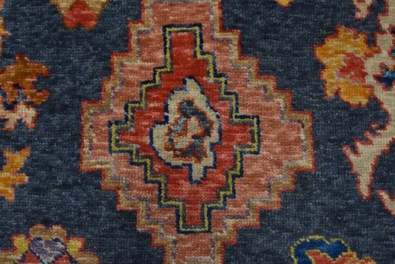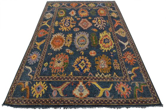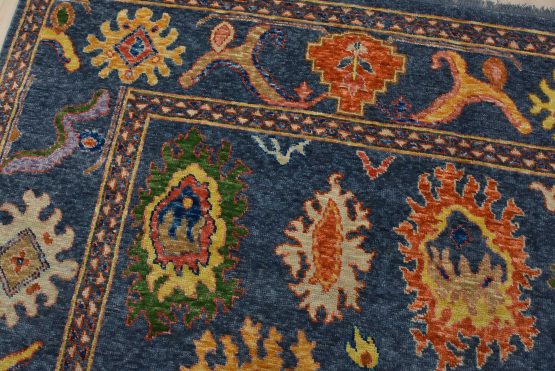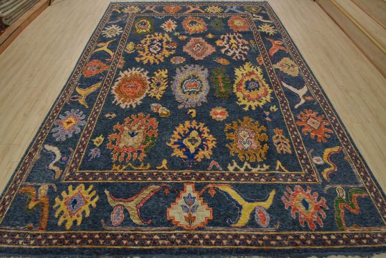 A modern traditional Anatolia rug hand-knotted with an all-wool pile on a cotton foundation. This oriental rug features large botanical motifs set against a blue background. It is new and in excellent condition.