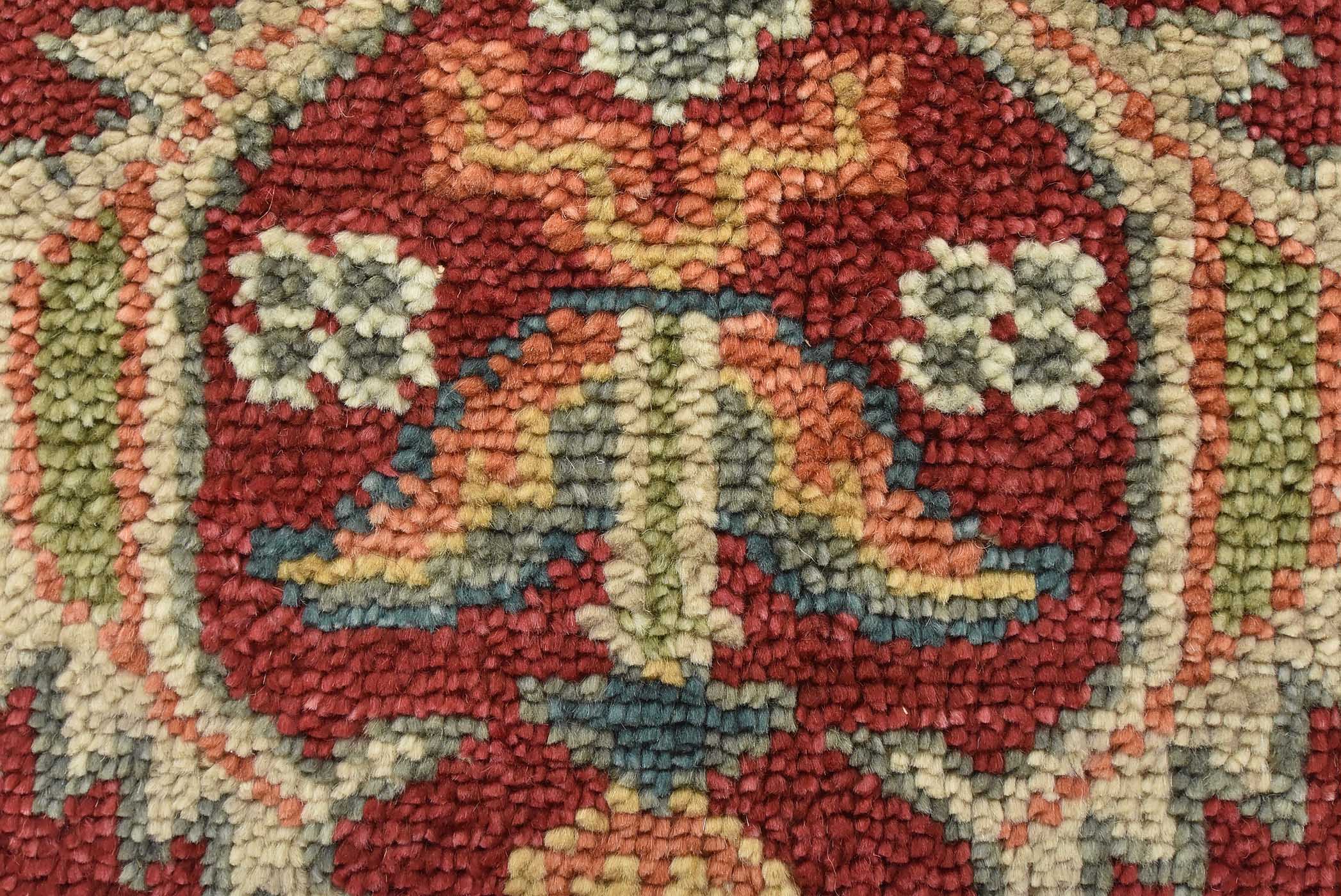 A traditional Anatolian rug hand-knotted with an all-wool pile on a cotton foundation. This oriental rug features repeating geometric botanical motifs set against a red background. It is new and in excellent condition.