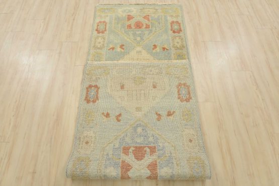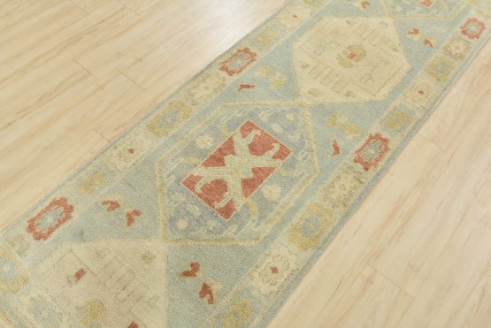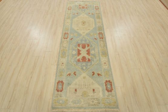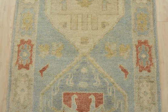 A tribal Anatolia runner hand-knotted with an all-wool pile on a cotton foundation. This oriental rug features geometric medallions set against a light blue background. It is new and in excellent condition.
