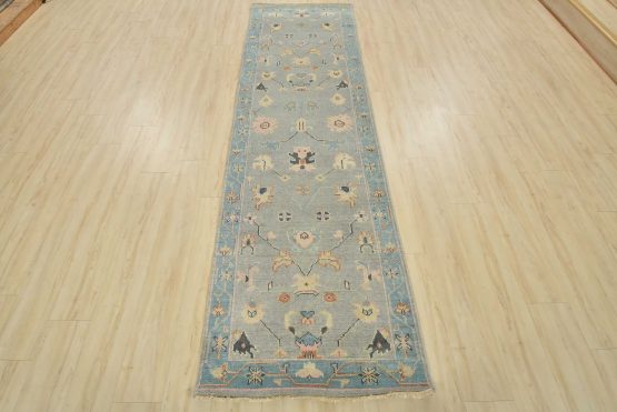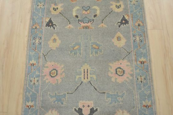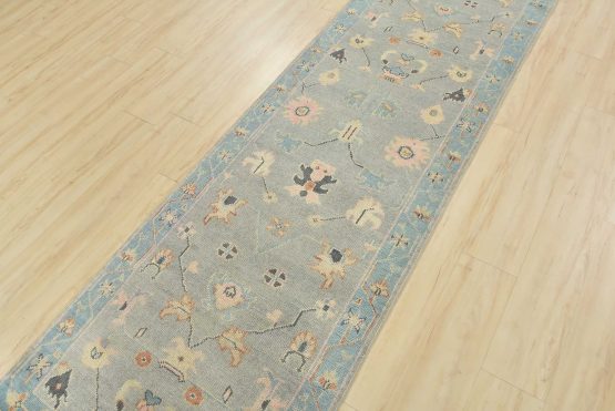 A modern traditional Anatolia runner hand-knotted with an all-wool pile on a cotton foundation. This oriental rug features a botanical design set against a gray background. It is new and in excellent condition.