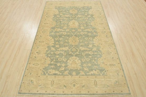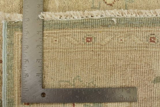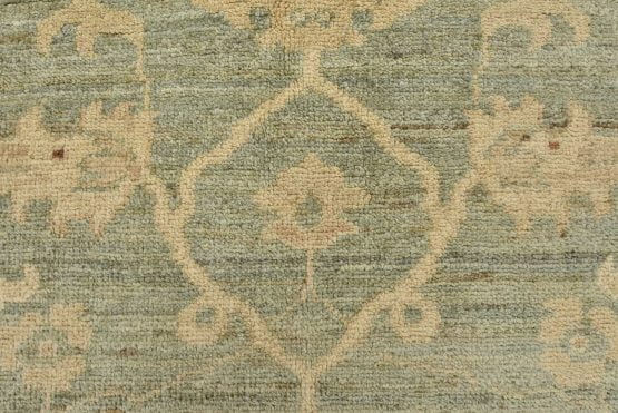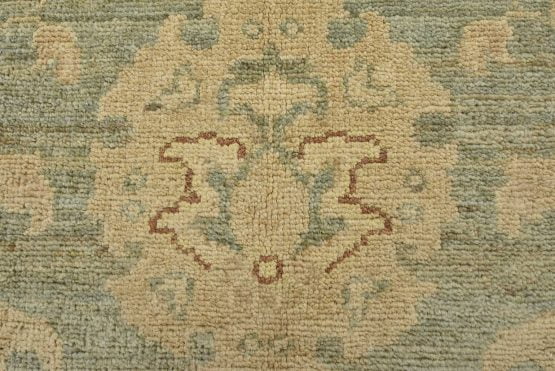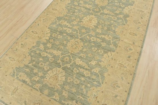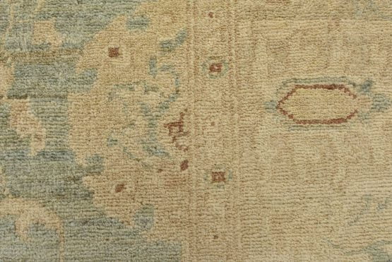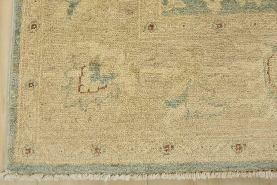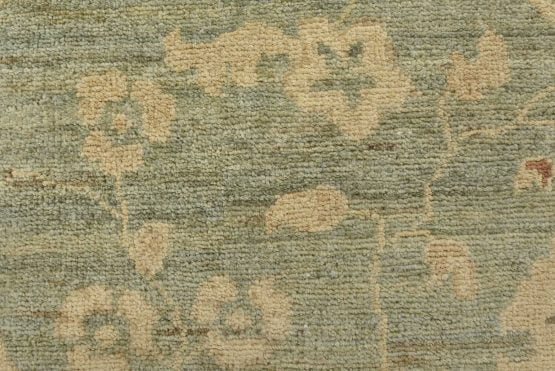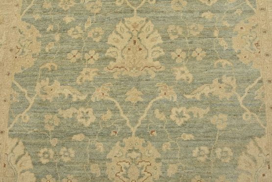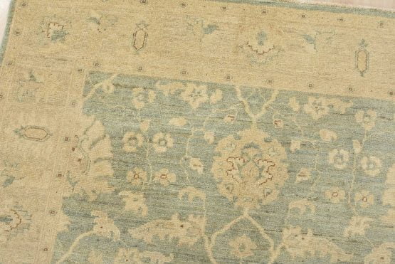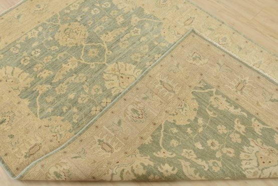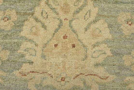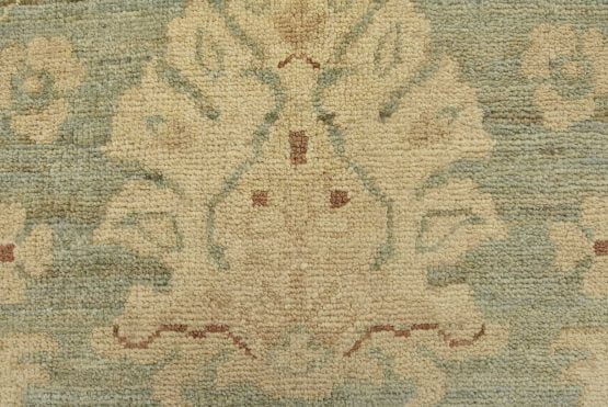 A traditional Ziegler rug hand-knotted with an all-wool pile on a cotton foundation. This oriental rug features a subtle all-over floral design set against a light green background. It is new and in excellent condition.