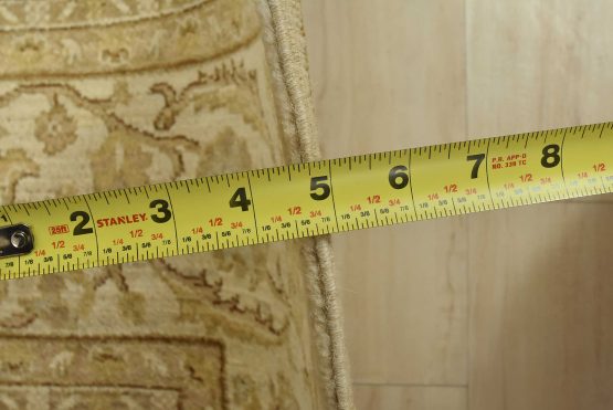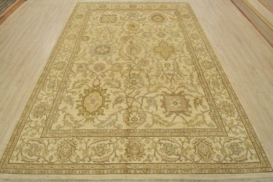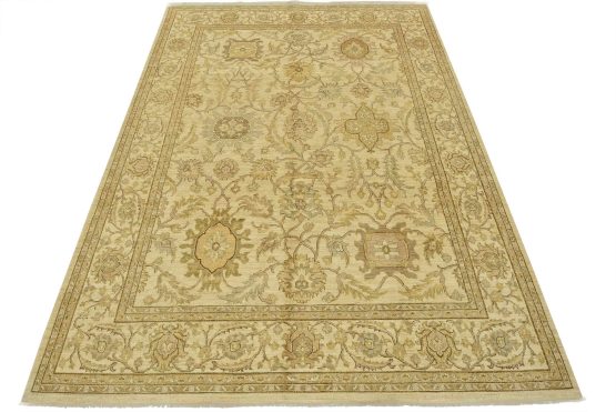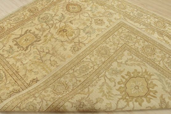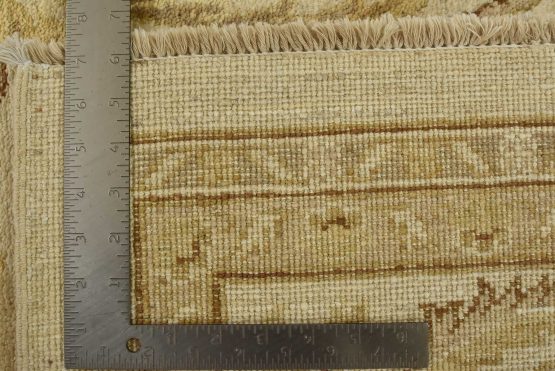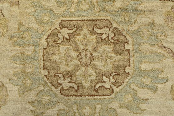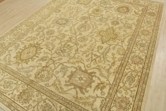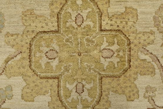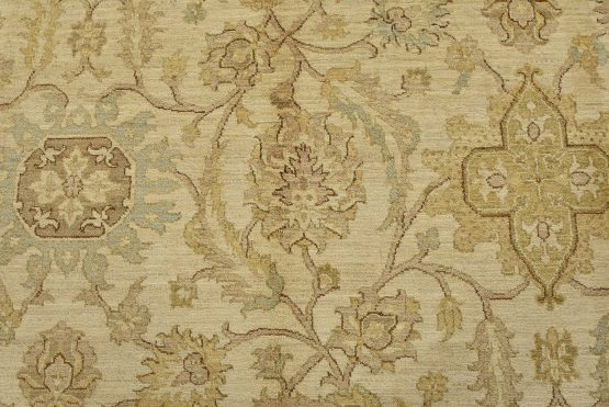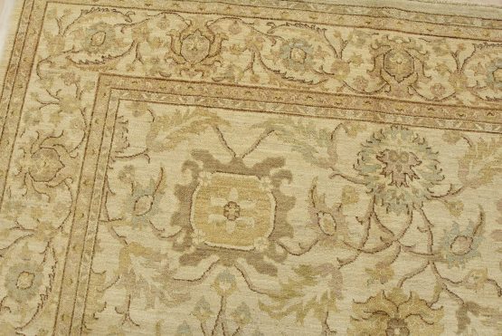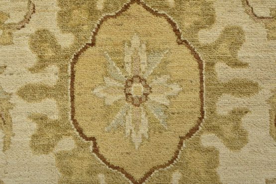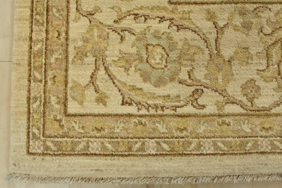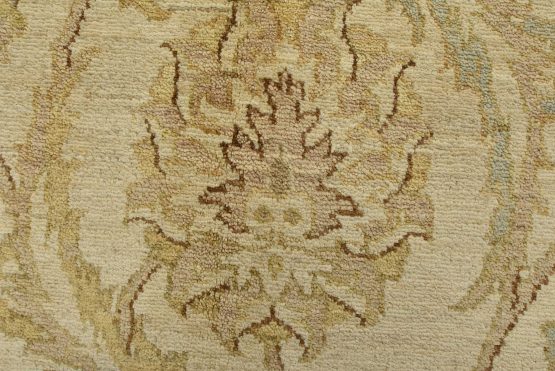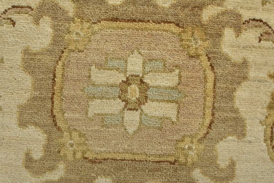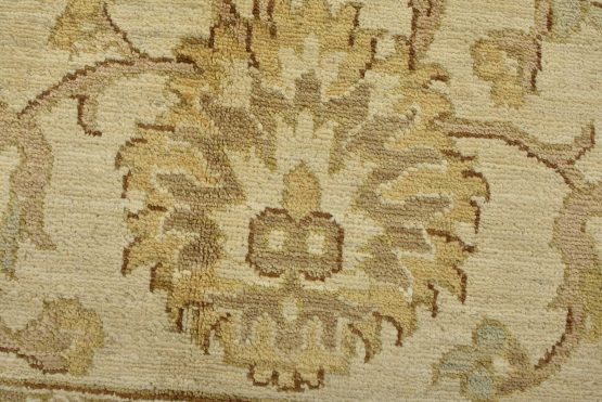 A traditional Ziegler rug hand-knotted with an all-wool pile on a cotton foundation. This oriental rug features curvilinear medallions surrounded by a botanical design set against a beige background. It is new and in excellent condition.