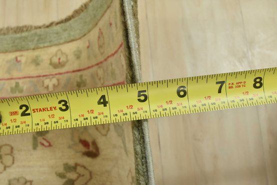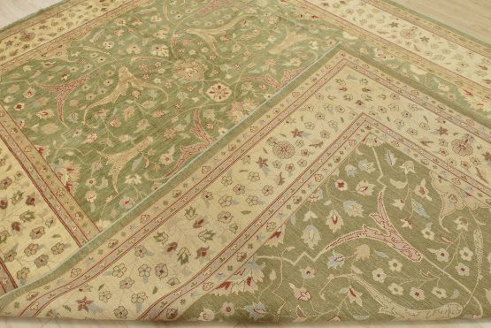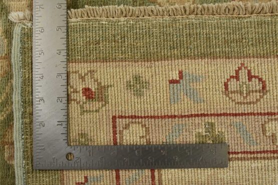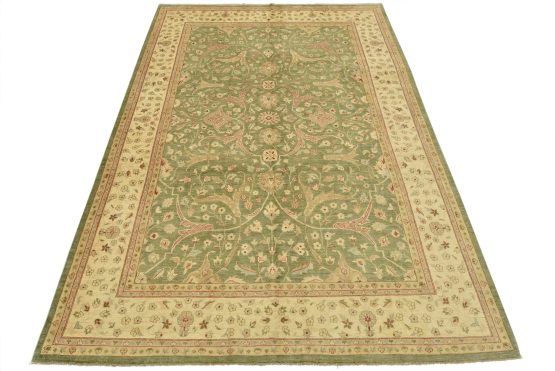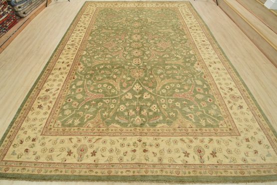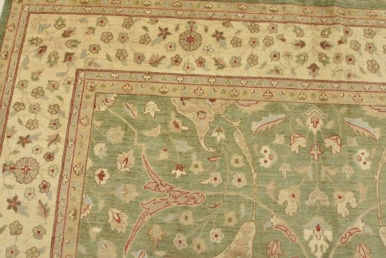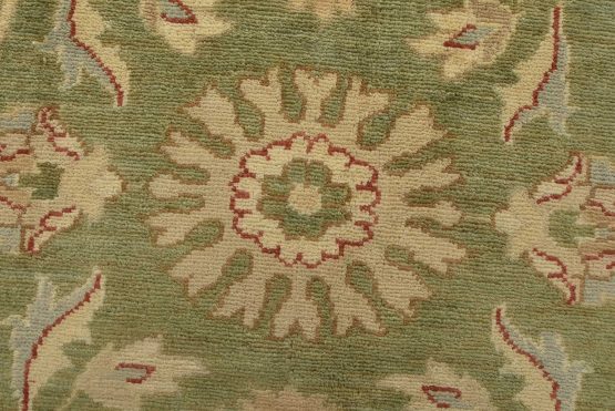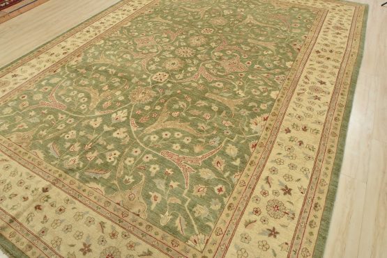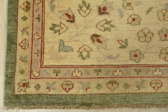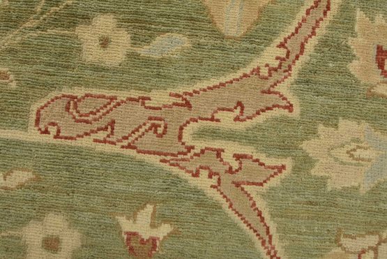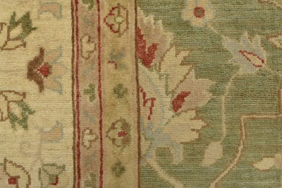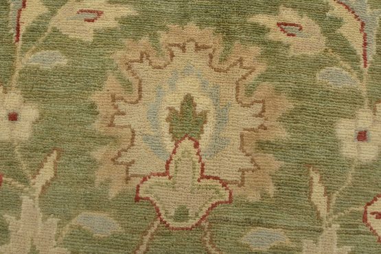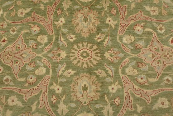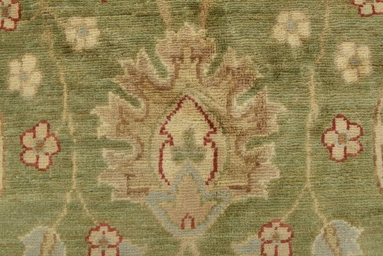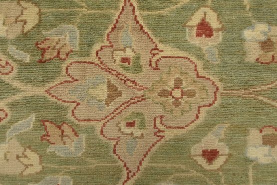 A traditional Ziegler rug hand-knotted with an all-wool pile on a cotton foundation. This oriental rug features an all-over floral design set against a light green background. It is new and in excellent condition.