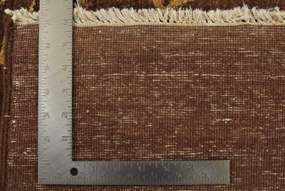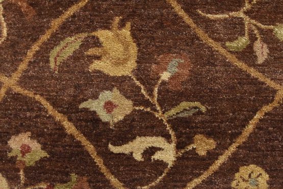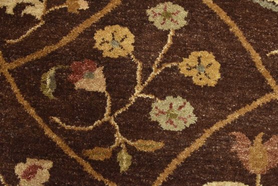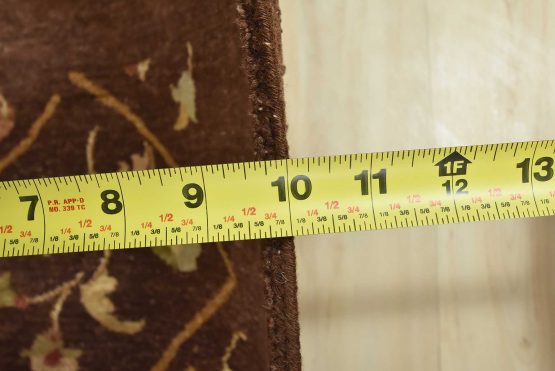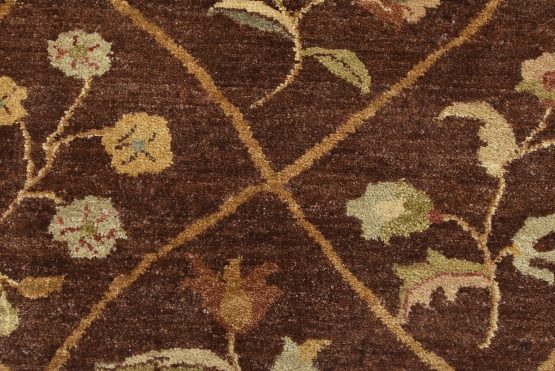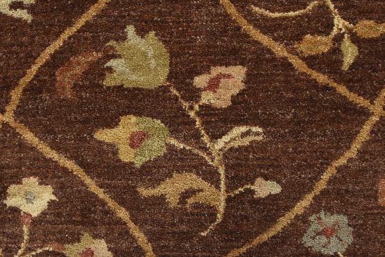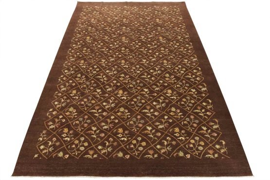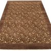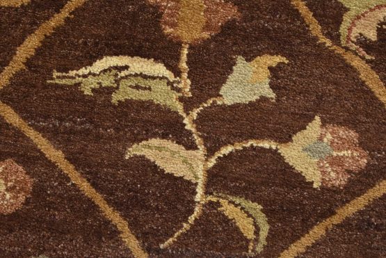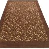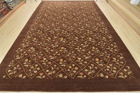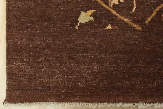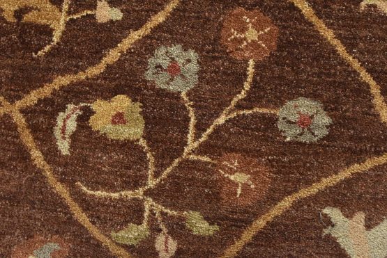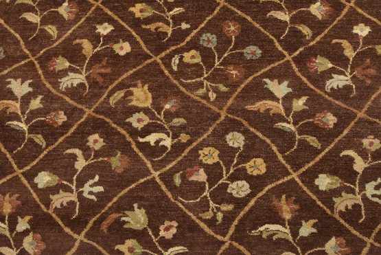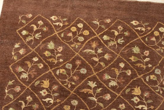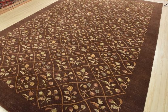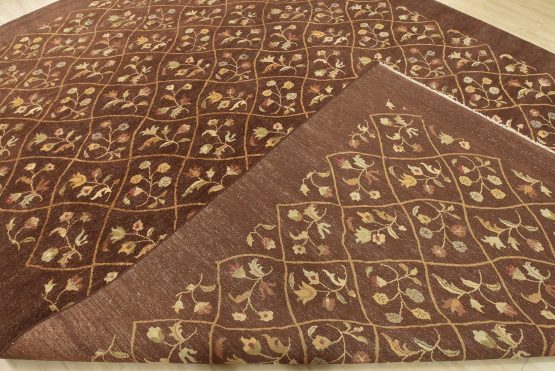 A traditional Aubusson rug hand-knotted with an all-wool pile on a cotton foundation. This finely woven oriental rug features an all-over botanical pattern set against a brown background. It is new and in excellent condition.