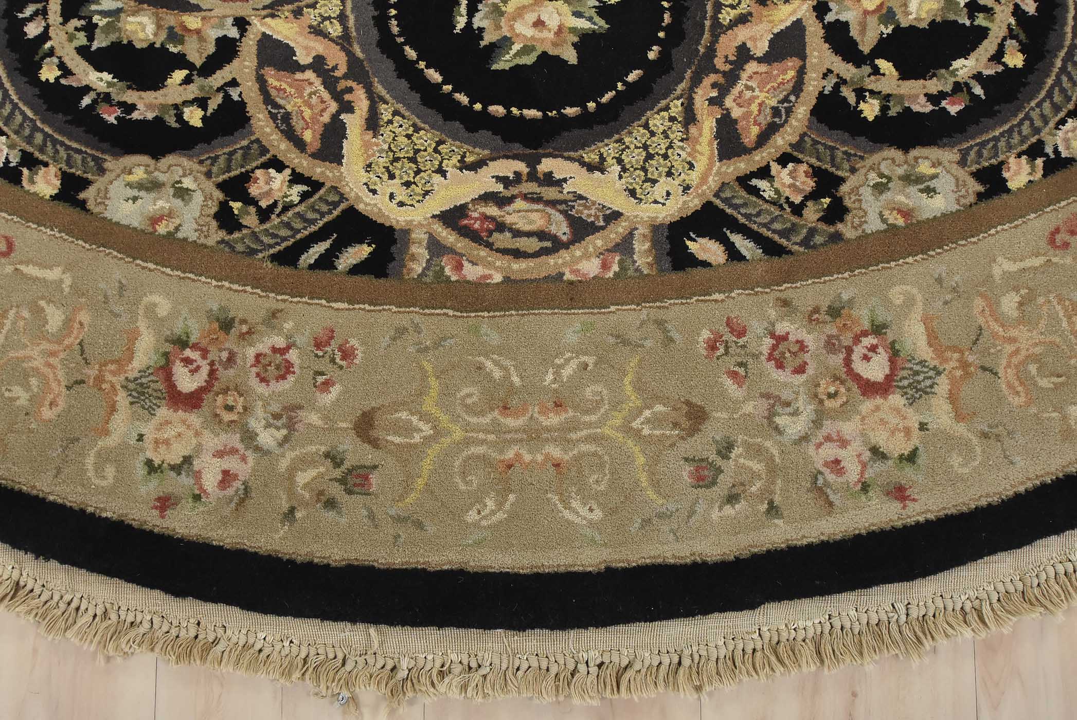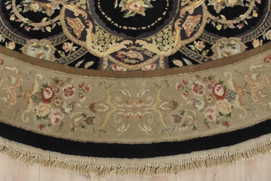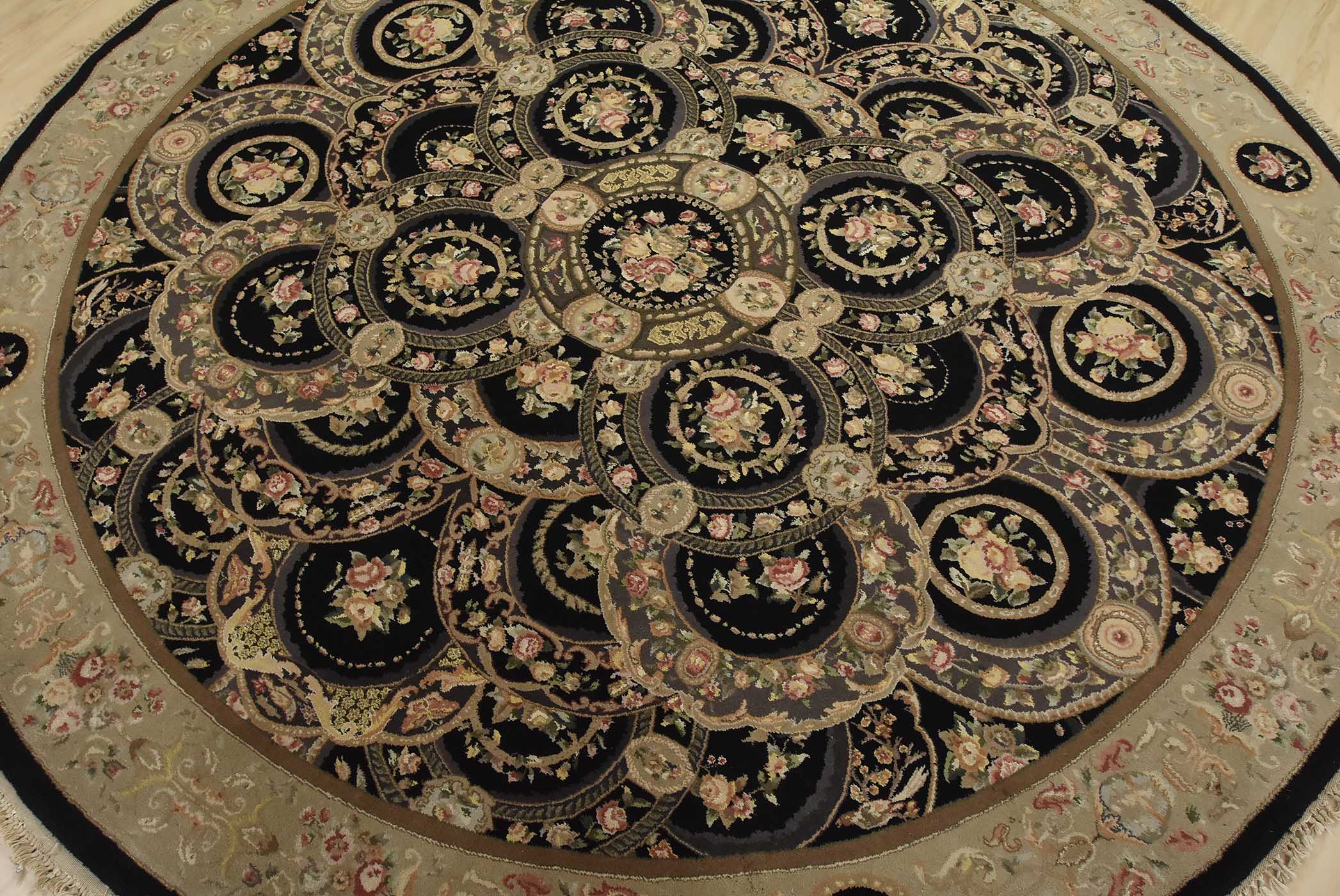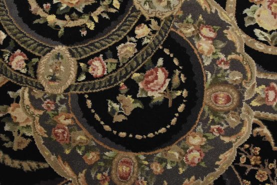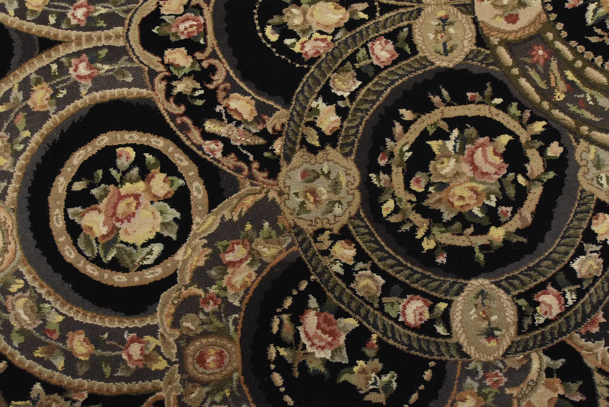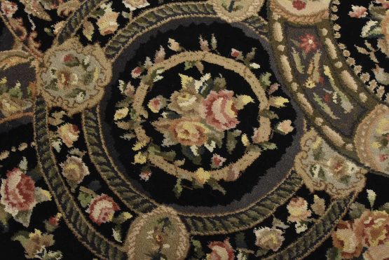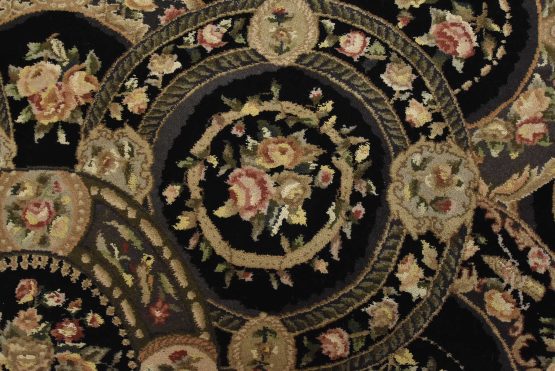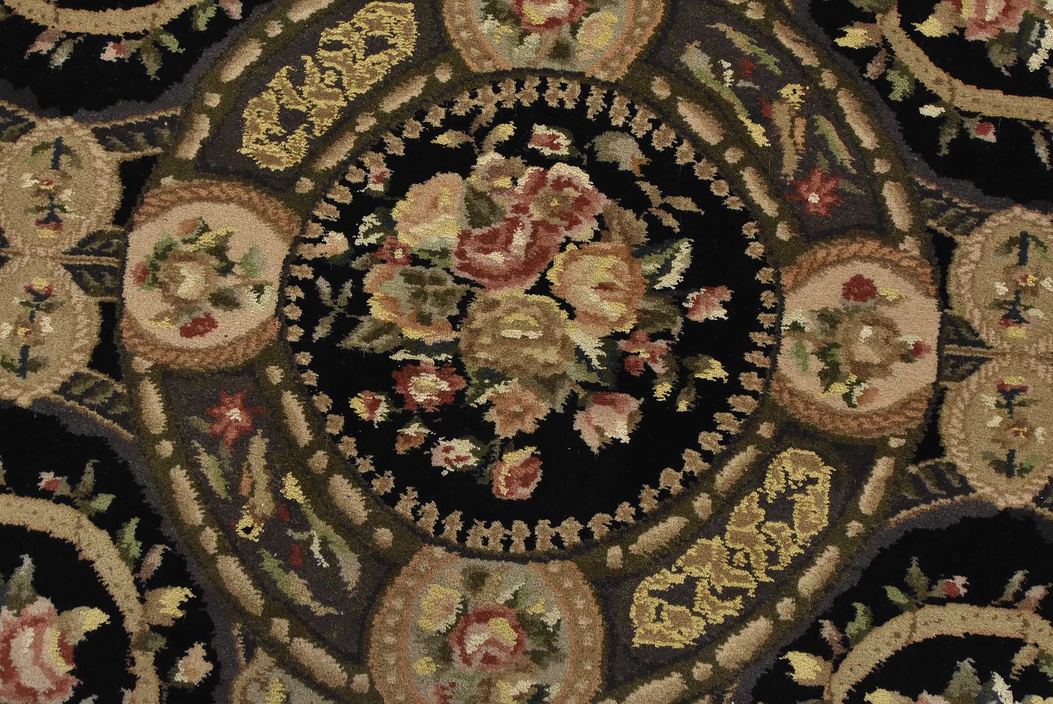 A traditional Aubusson rug hand-knotted with fine wool on a cotton foundation. This intricately woven rug features circular medallions adorned with floral motifs set against a black background. It is new and in excellent condition.
