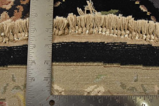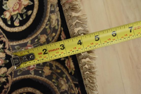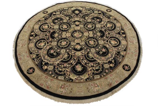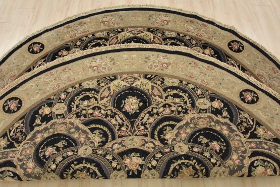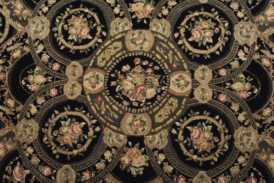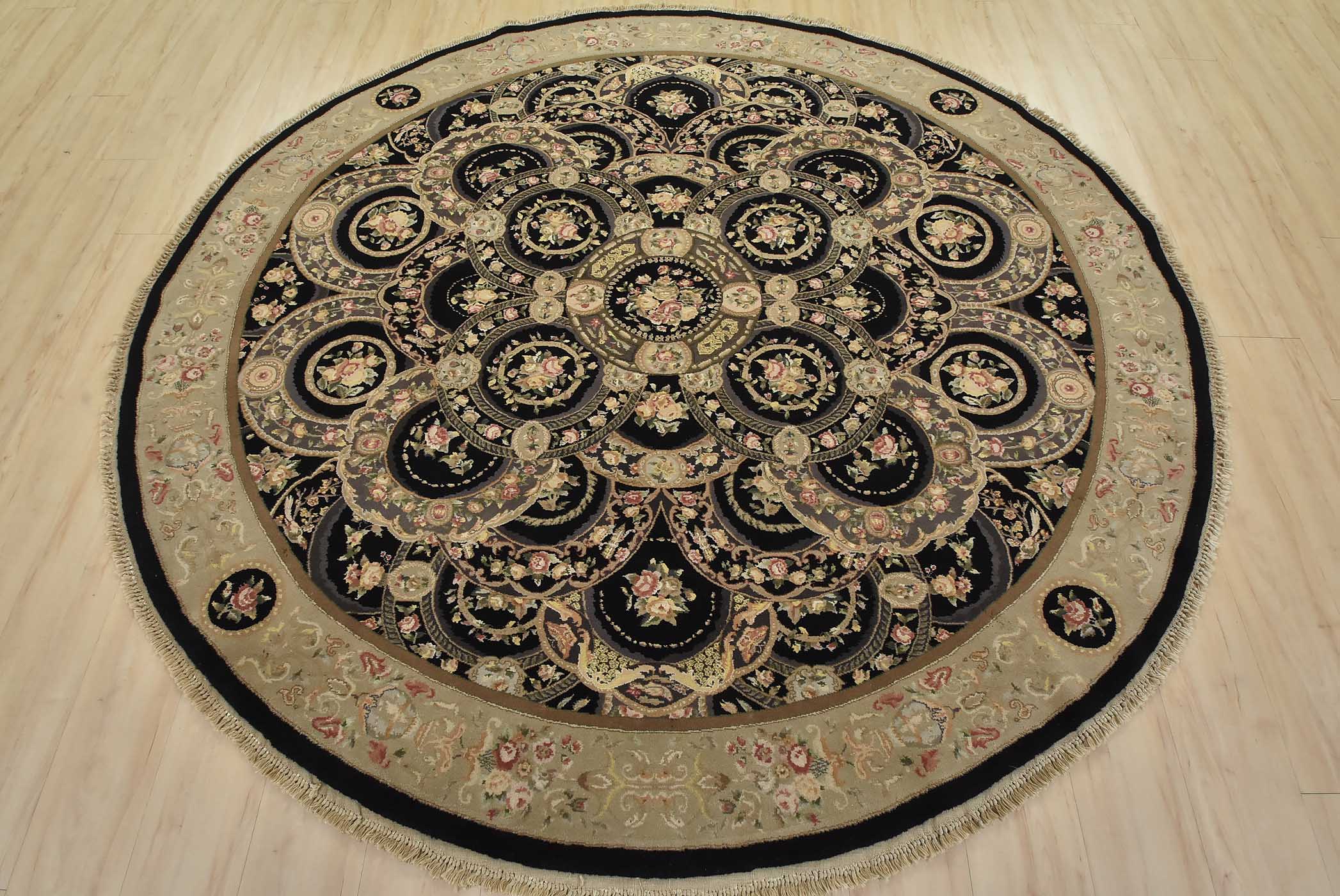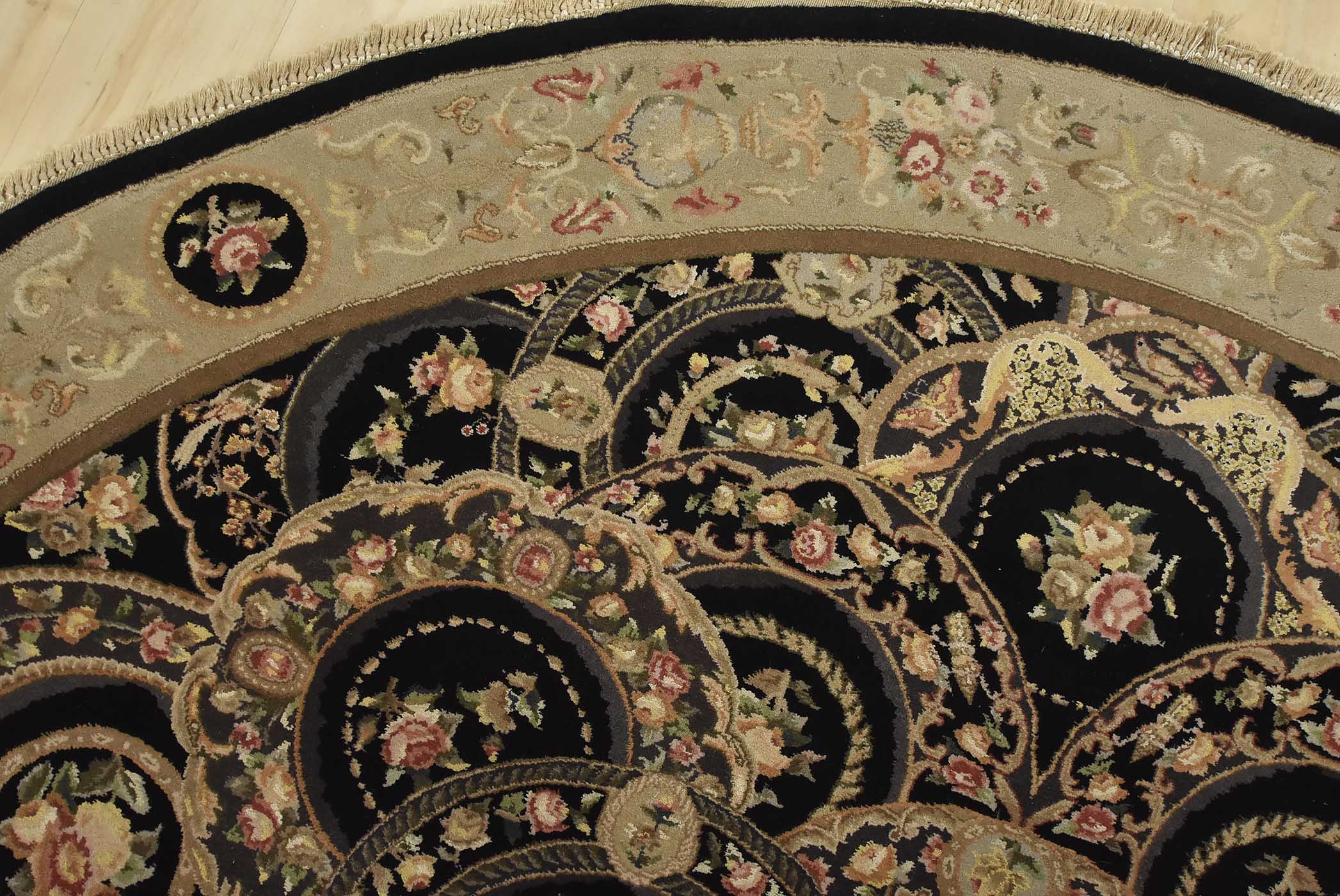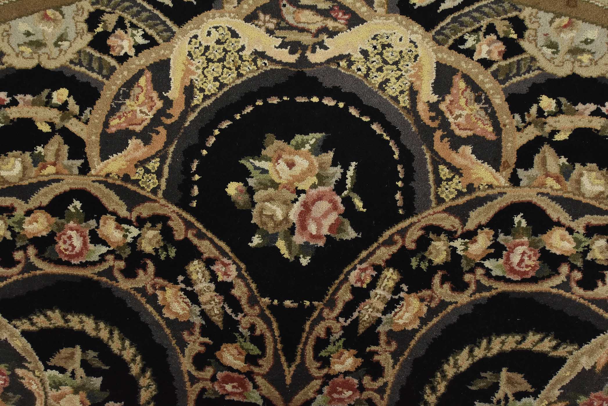 A traditional Aubusson rug hand-knotted with fine wool on a cotton foundation. This intricately woven rug features circular medallions adorned with floral motifs set against a black background. It is new and in excellent condition.