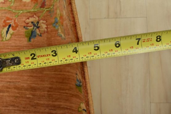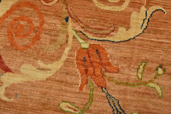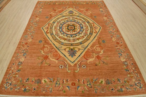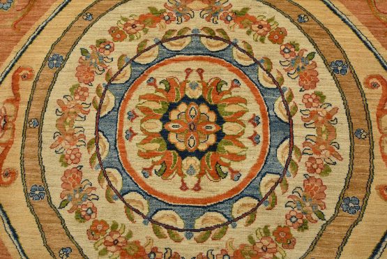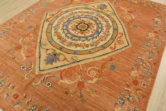 A traditional Aubusson rug hand-knotted with an all-wool pile on a cotton foundation. This finely woven oriental rug features a large central medallion adorned with floral patterns, surrounded by botanical motifs set against an orange background. It is new and in excellent condition.