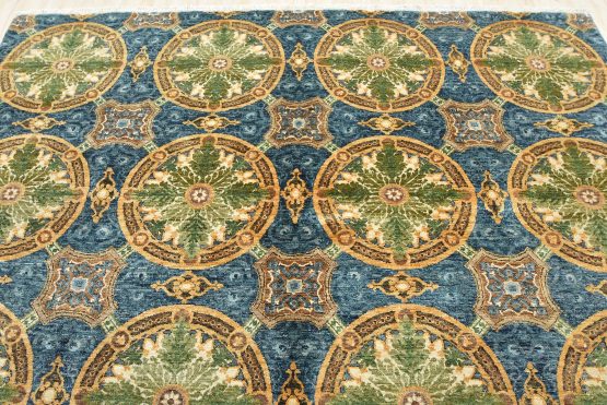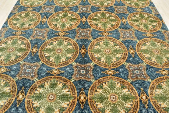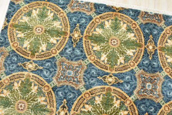 A traditional Aubusson rug hand-knotted with an all-wool pile on a cotton foundation. This finely woven area rug features rows of circular medallions adorned with botanical motifs set against a blue background. It is new and in excellent condition.