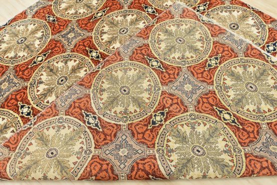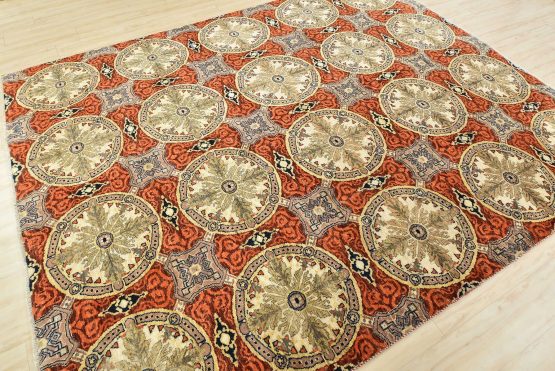 A traditional Aubusson rug hand-knotted with an all-wool pile on a cotton foundation. This finely woven area rug features rows of circular medallions surrounded by botanical motifs set against a red background. It is new and in excellent condition.