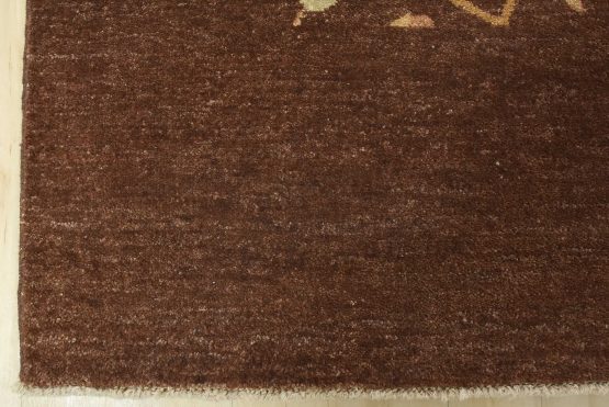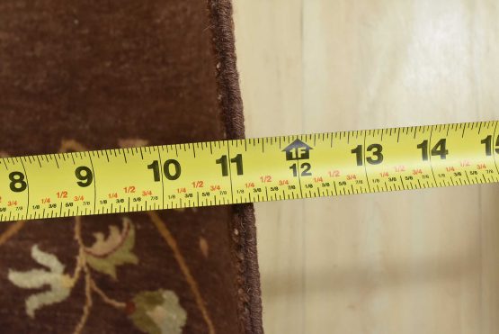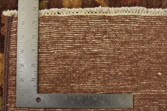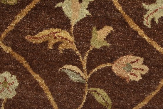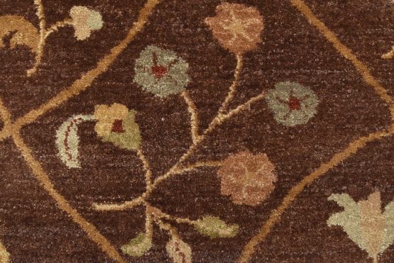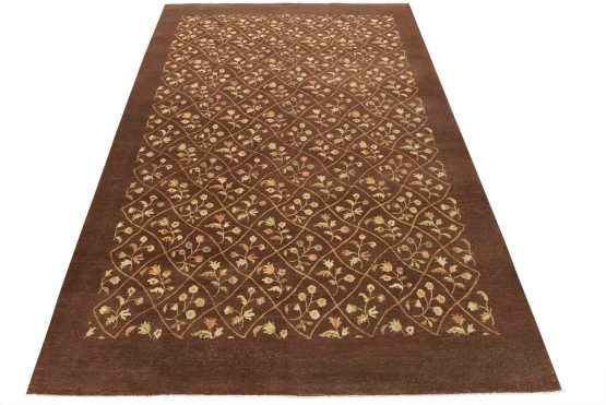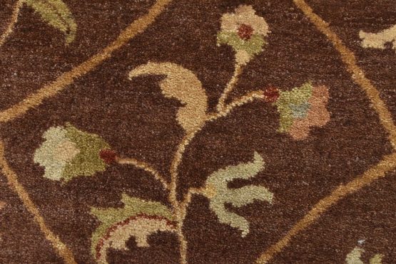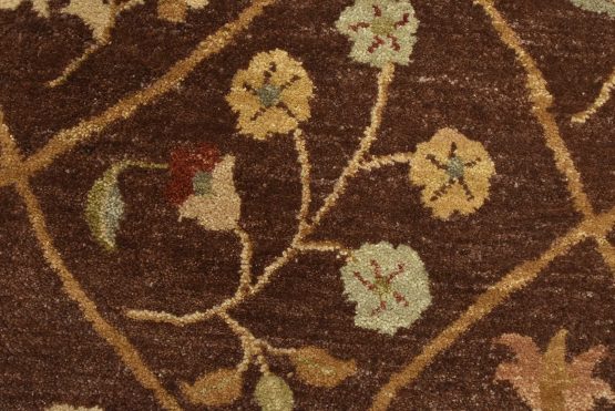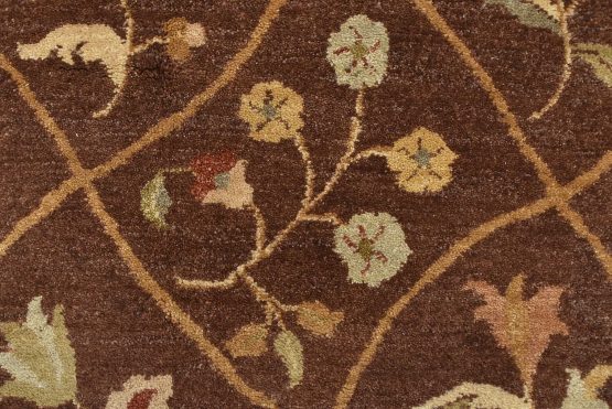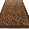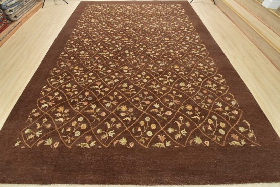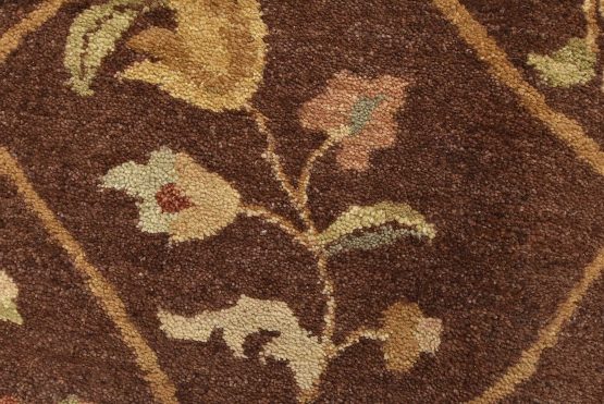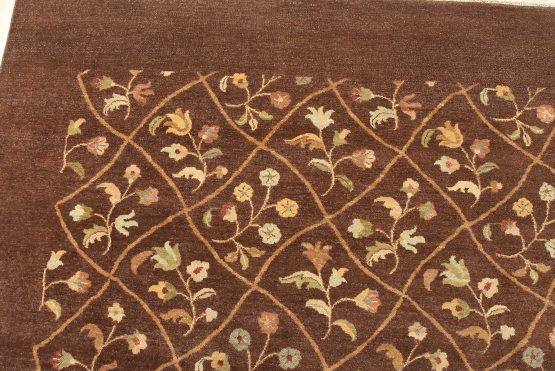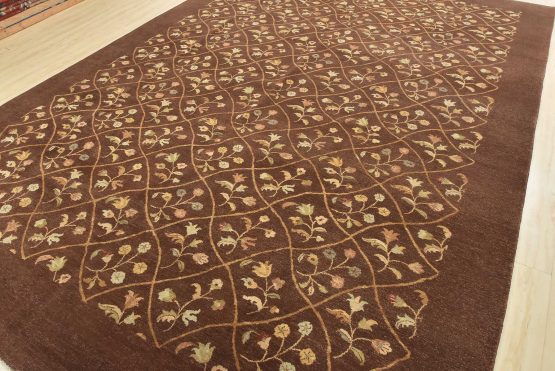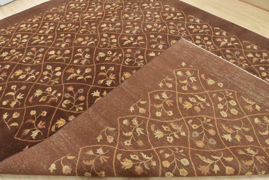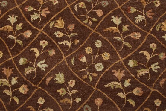 A traditional Aubusson rug hand-knotted with an all-wool pile on a cotton foundation. This finely woven oriental rug features an all-over botanical pattern set against a brown background. It is new and in excellent condition.