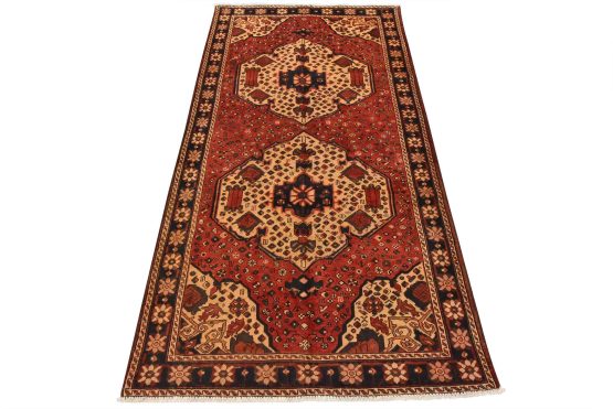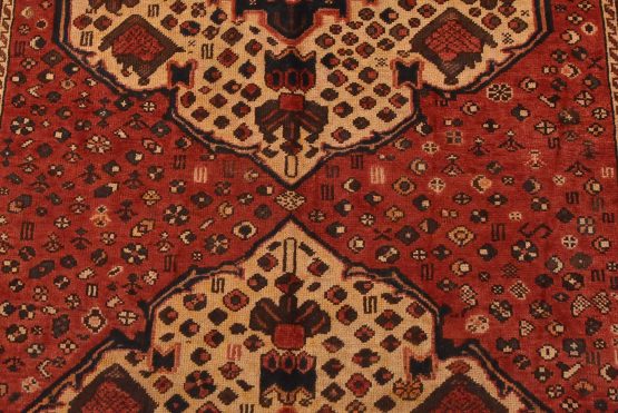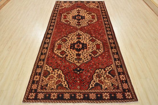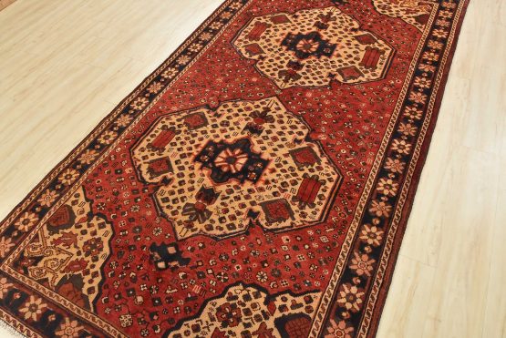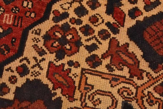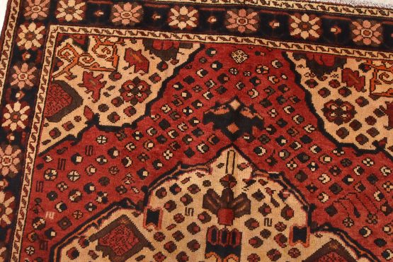 An authentic semi-antique tribal Bakhtiari rug hand-knotted with fine wool and natural dyes. This oriental rug features two large medallions surrounded by small-scale geometric motifs set against a red background. The wool pile shows some minor wear; please refer to the photos. Otherwise, the rug is in very good condition.
