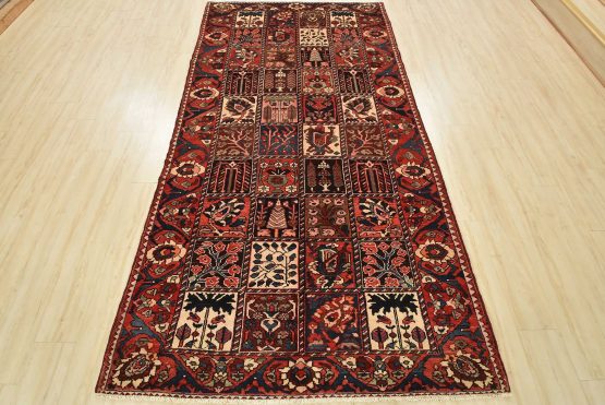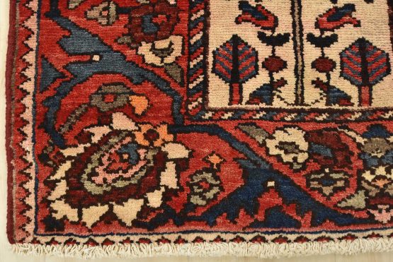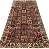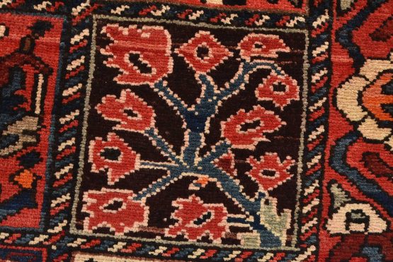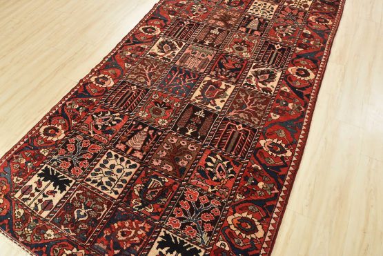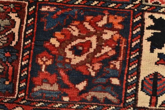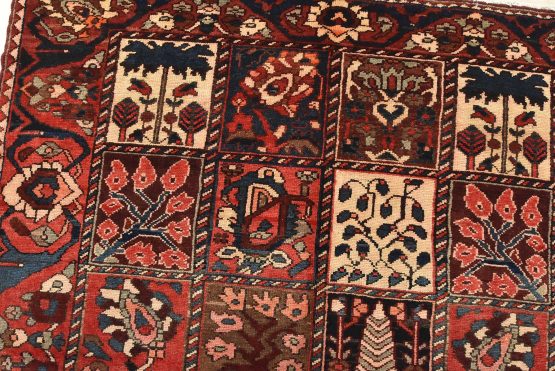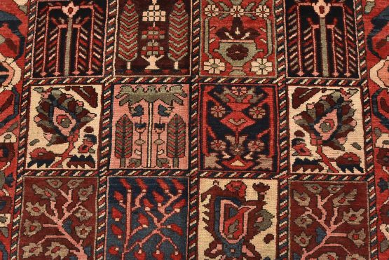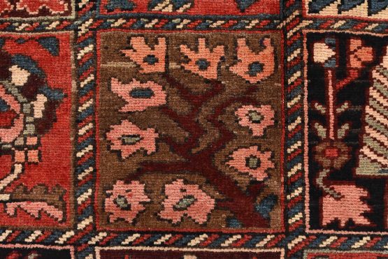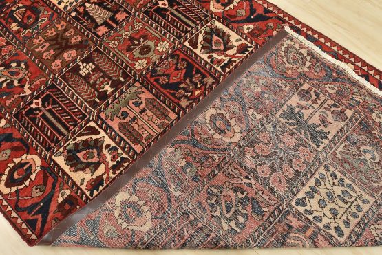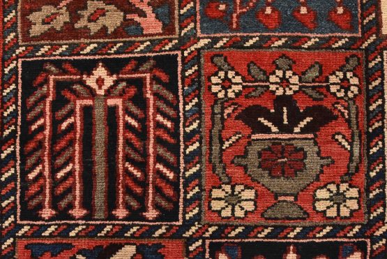 An authentic, semi-antique, traditional tribal Bakhtiari rug, hand-knotted with fine wool and natural dyes. This oriental rug features an all-over panel garden design with geometric and floral motifs. It has a full wool pile with no worn areas and is in very good condition.