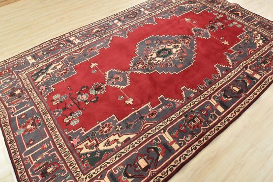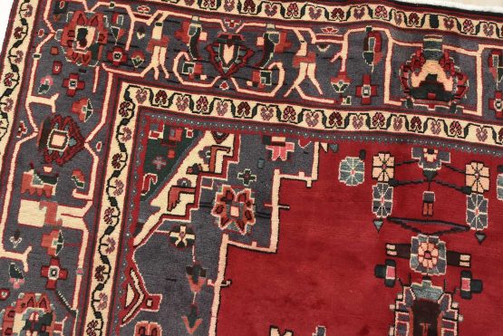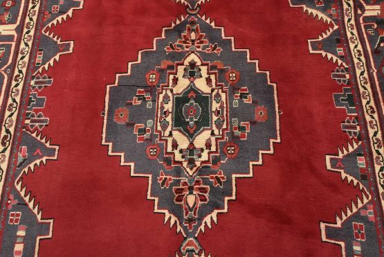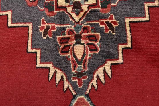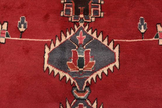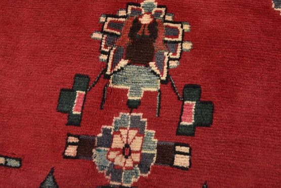 An authentic vintage tribal Bakhtiari rug hand-knotted with fine wool and natural dyes. This oriental rug features a central geometric medallion surrounded by geometric flowers set against a red background. It has a full wool pile with no worn areas and is in very good condition.