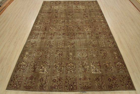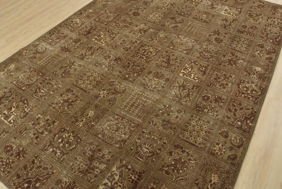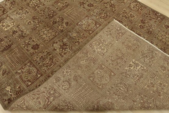 An authentic vintage traditional Bakhtiari rug hand-knotted with an all-wool pile on a cotton foundation. This oriental rug features a panel design of botanical motifs. It has a low wool pile, is worn and distressed, and has minor imperfections (see photos). However, it is in very good condition.