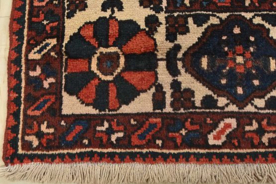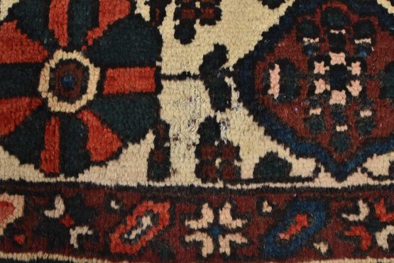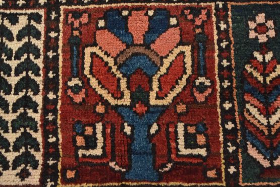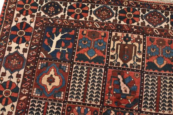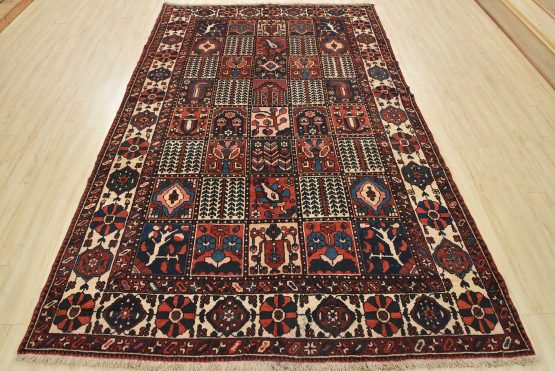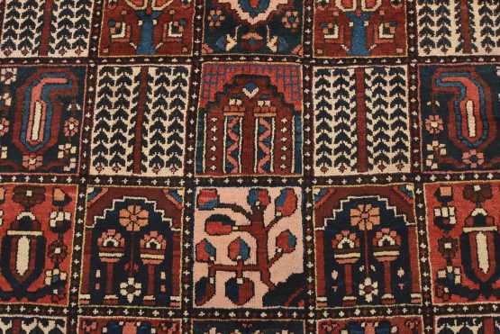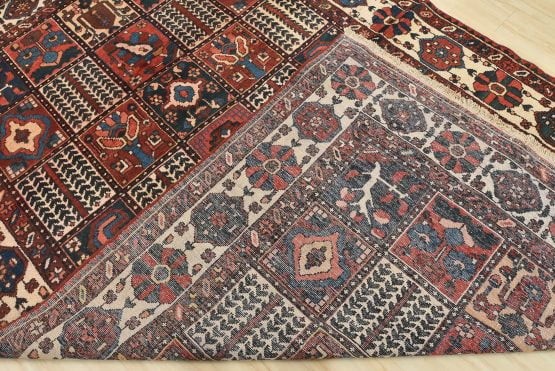 An authentic, semi-antique, traditional, tribal Bakhtiari rug hand-knotted with fine wool and natural dyes. This nomadic oriental rug features an all-over garden panel design of geometric botanical motifs. The wool pile does show some minor wear; please refer to the photos. Otherwise, this rug is in very good condition.