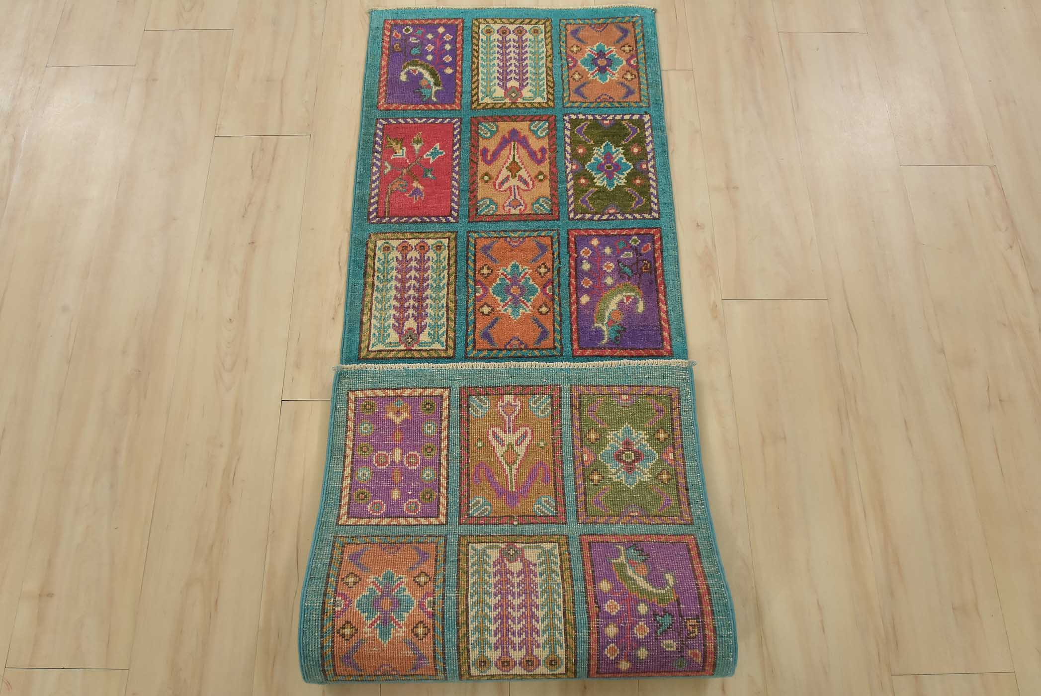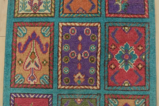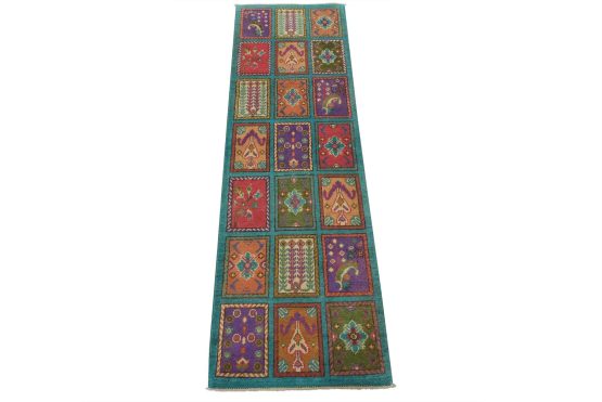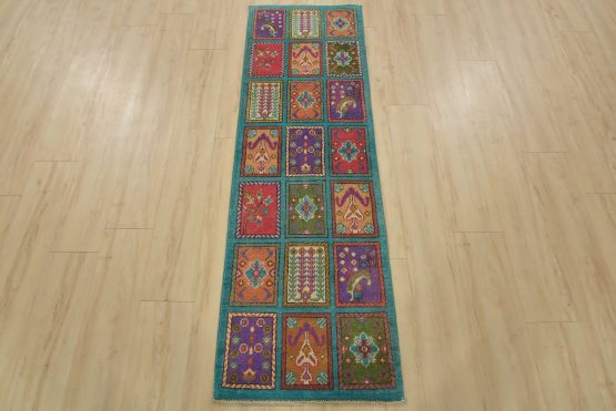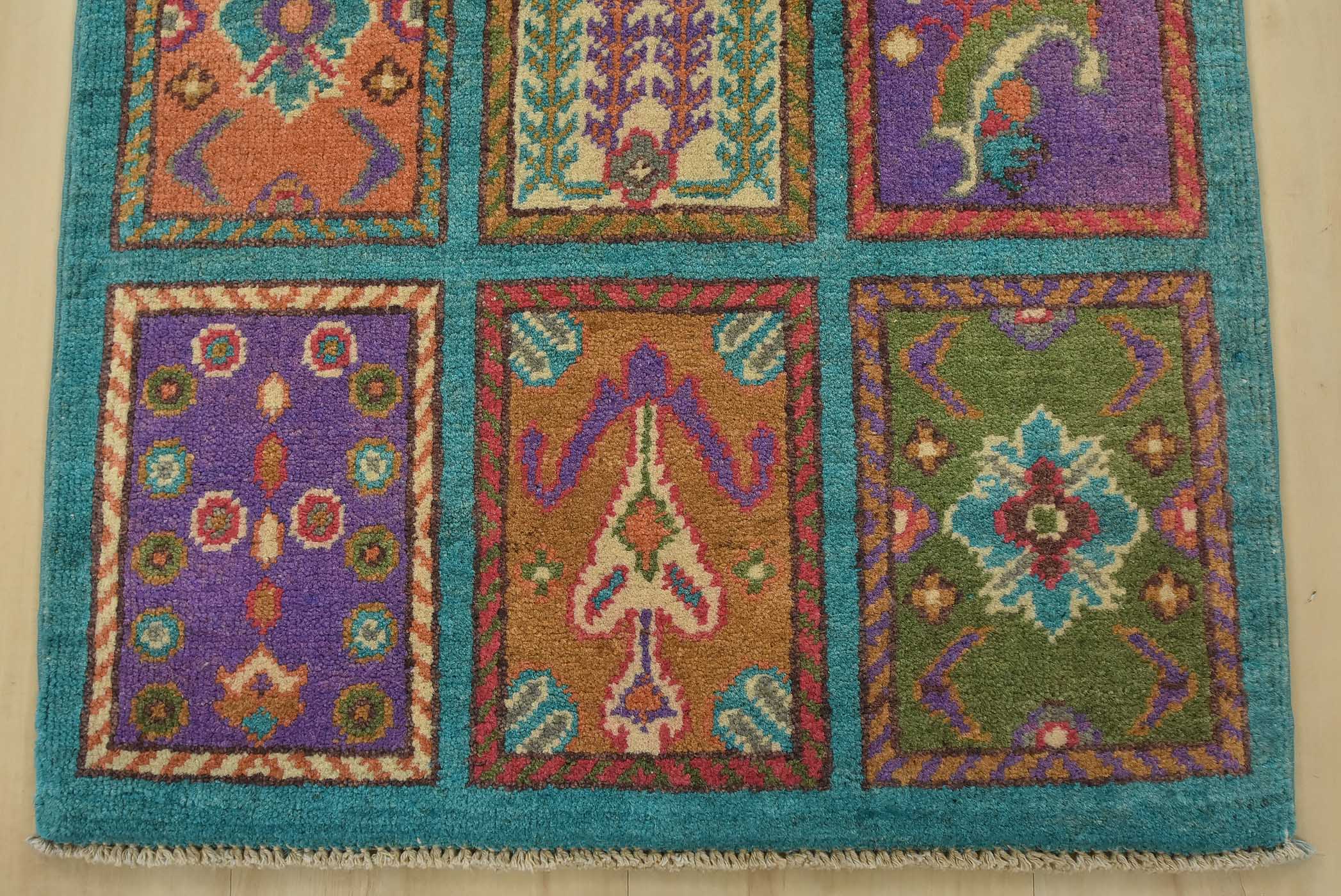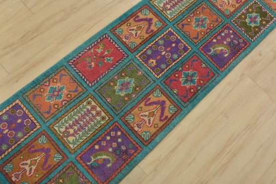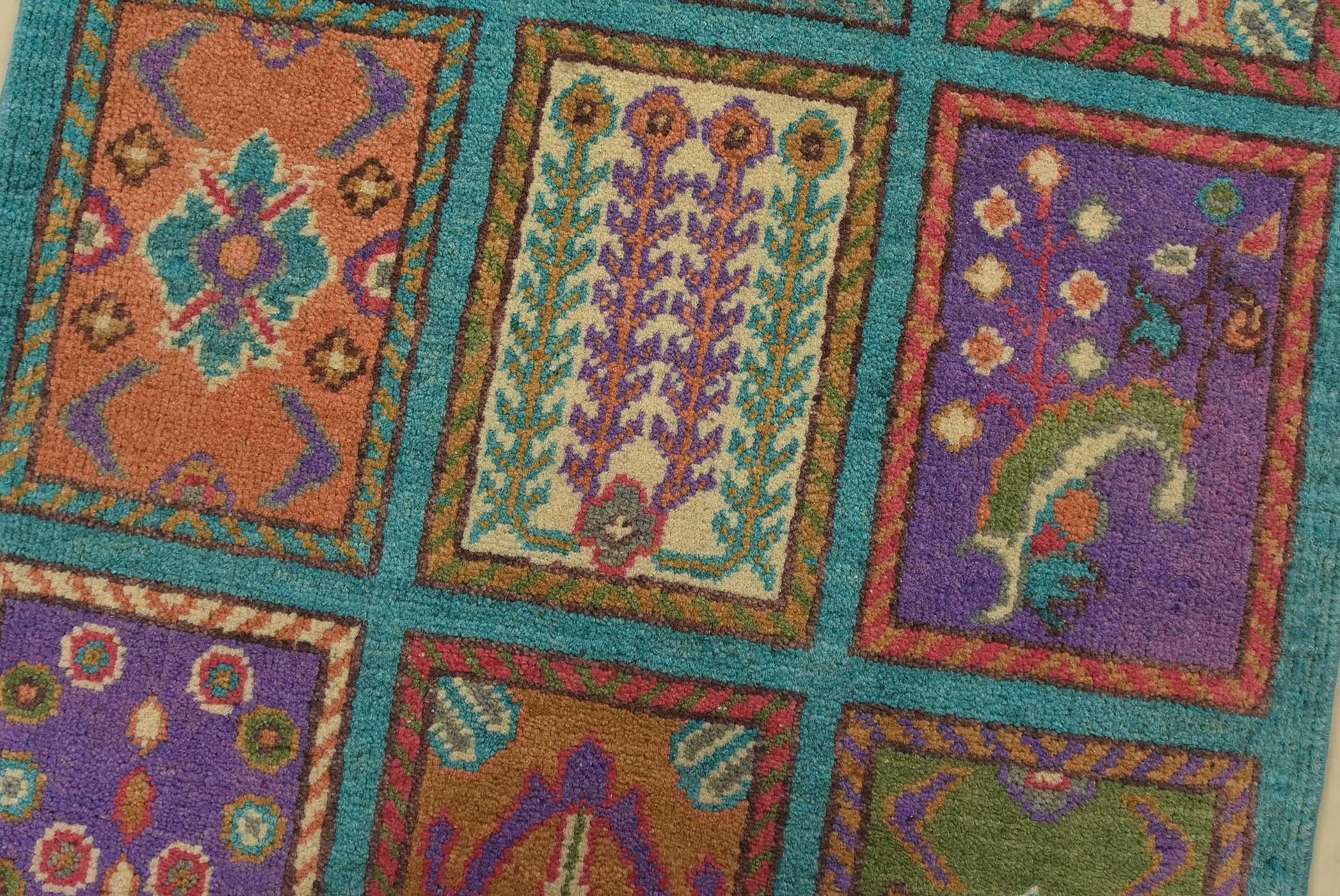 A modern traditional Bakhtiari runner hand-knotted with fine wool on a cotton foundation. This rug features rows of rectangles adorned with botanical motifs set against a blue background. It is new and in excellent condition.