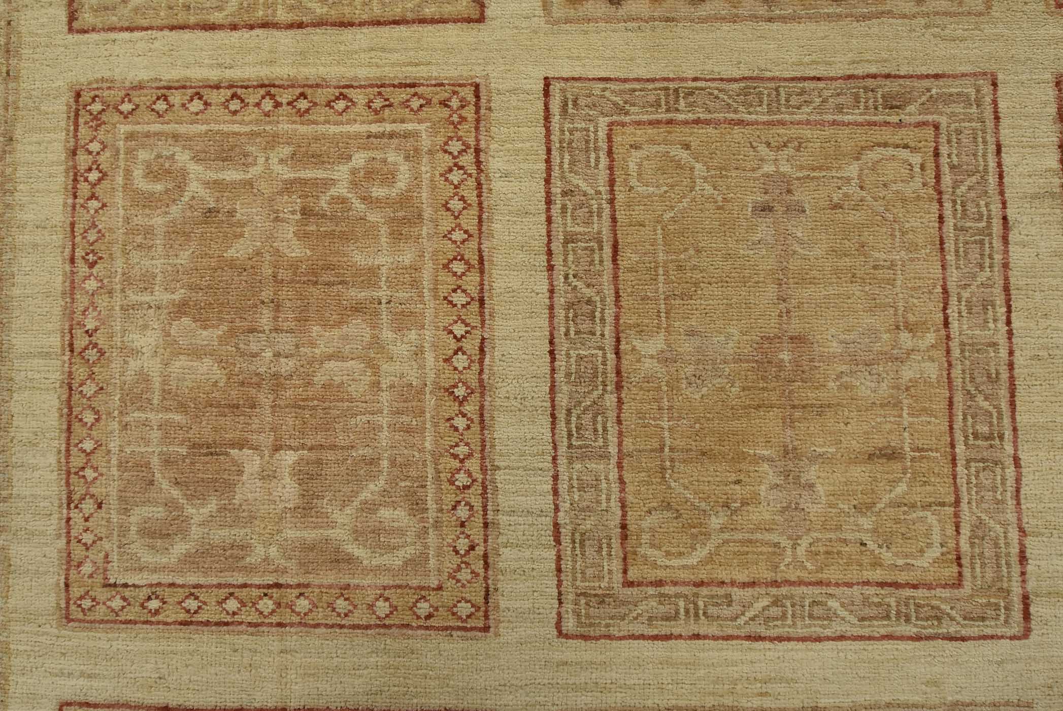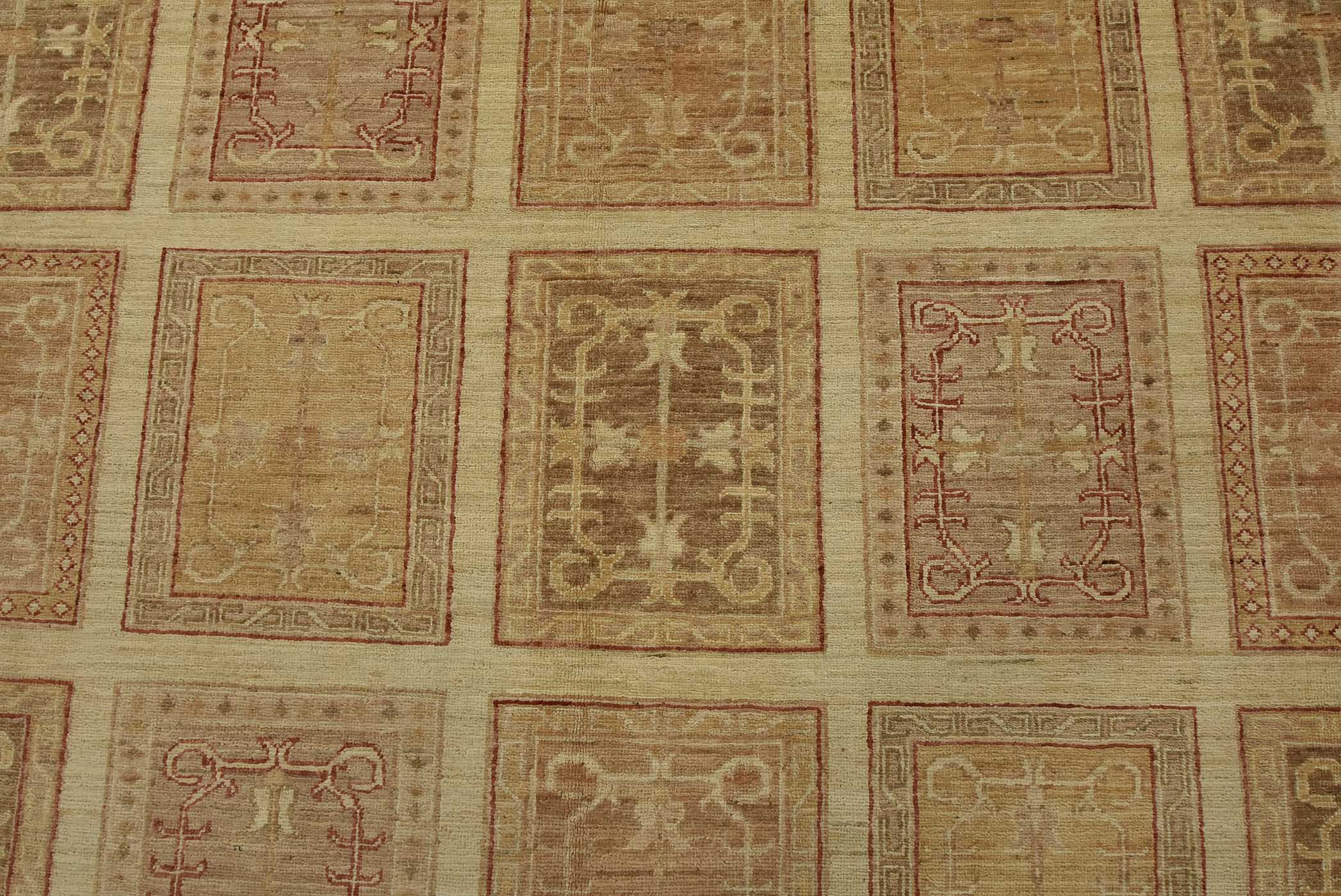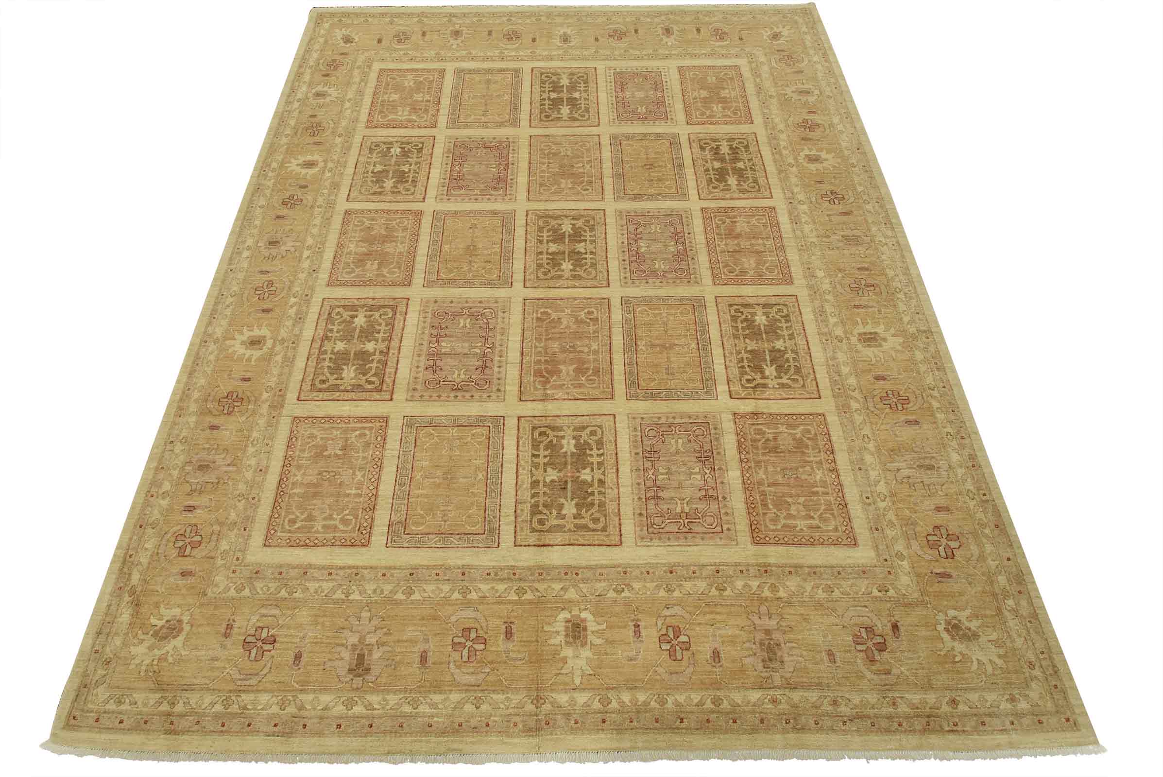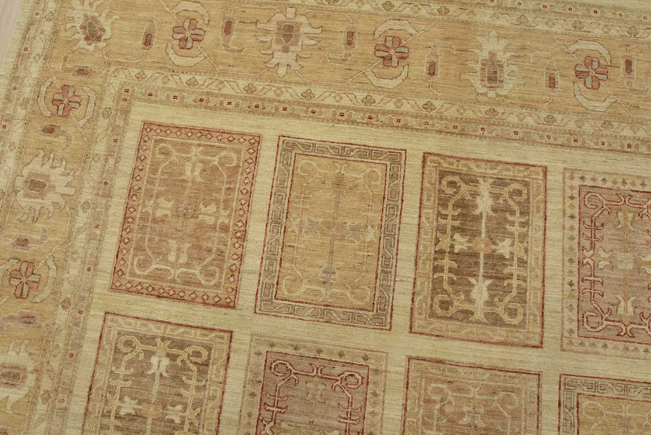 A traditional Bakhtiari rug hand-knotted with an all-wool pile on a cotton foundation. This oriental rug features a muted panel design of botanical motifs set against a beige background. It is new and in excellent condition.