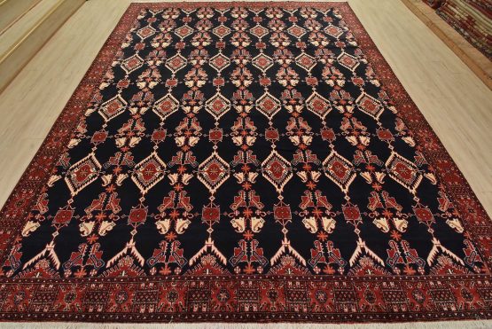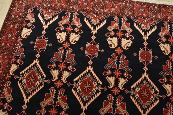 An authentic vintage tribal Baloch rug hand-knotted with fine wool and natural dyes. This nomadic oriental rug features an all-over geometric design set against a dark blue background. It has a full wool pile with no worn areas and is in very good condition.