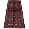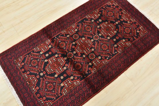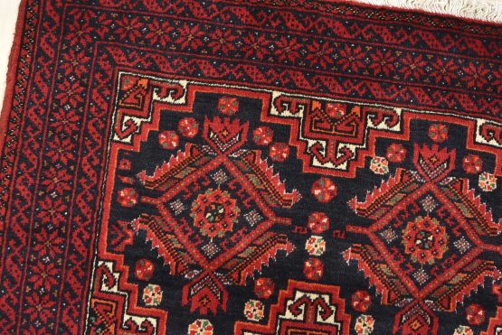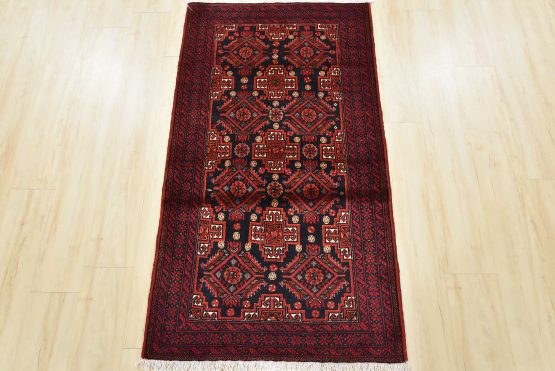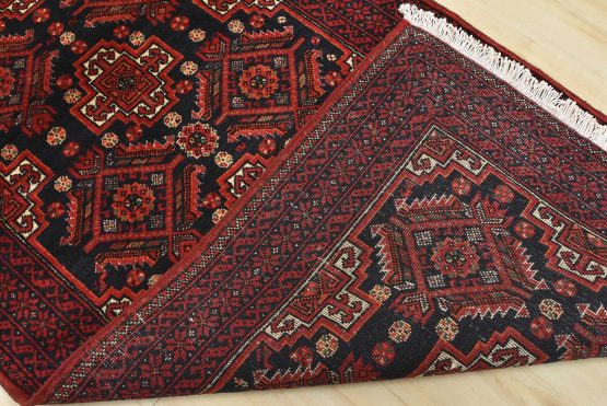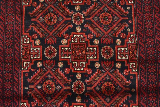 An authentic vintage tribal Baloch rug hand-knotted with fine wool and natural dyes. This nomadic oriental rug features rows of geometric motifs set against a dark blue background. It has a full wool pile with no worn areas and is in very good condition.