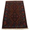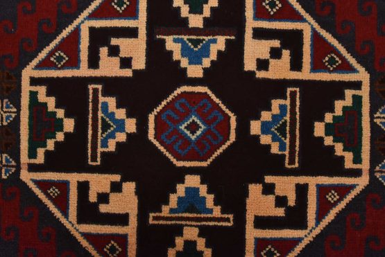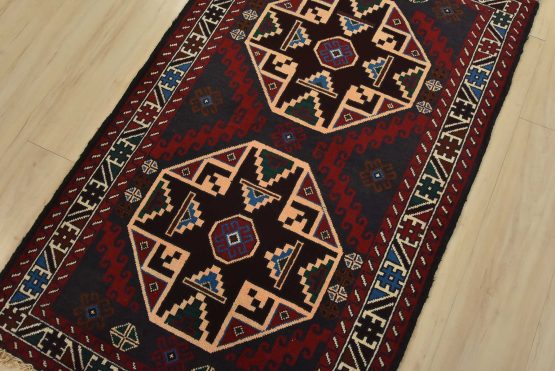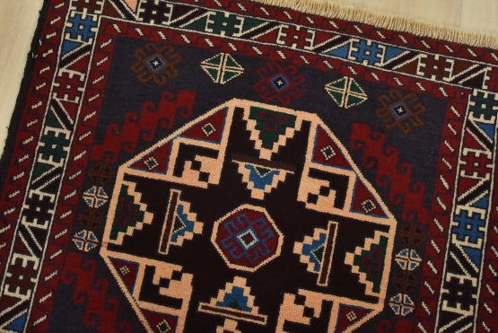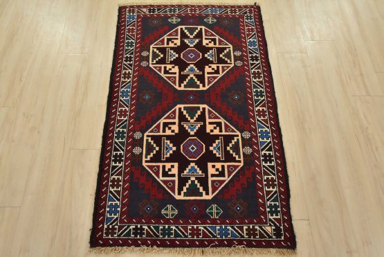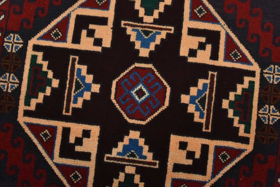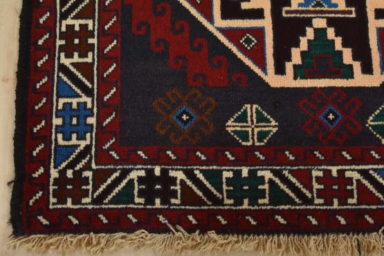 An authentic vintage tribal Baloch rug hand-knotted with fine wool and natural dyes. This nomadic oriental rug features two geometric medallions set against a blue background. It has a full wool pile with no worn areas and is in very good condition.