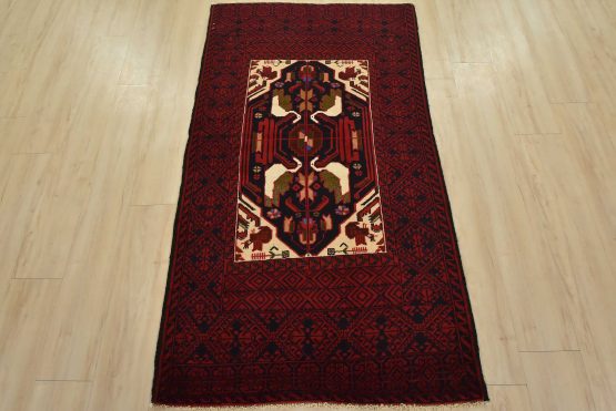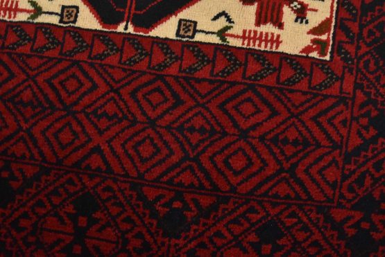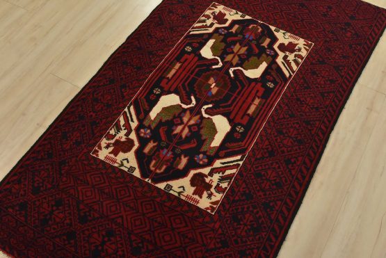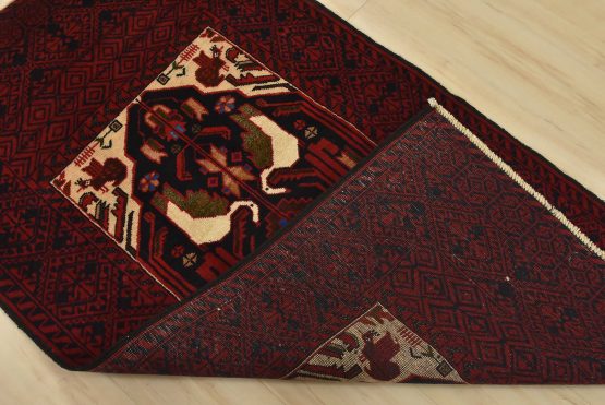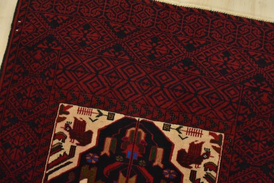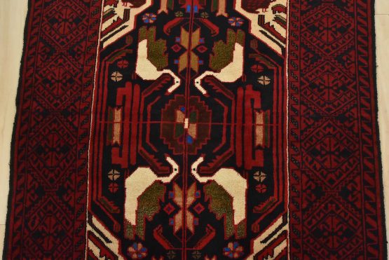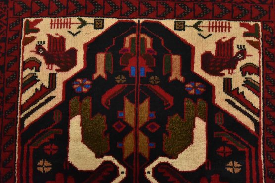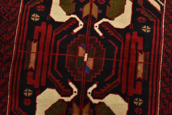 An authentic vintage tribal Baloch rug hand-knotted with fine wool and natural dyes. This nomadic oriental rug features a central geometric medallion surrounded by bird figures set against a dark blue background. It has a full wool pile with no worn areas and is in very good condition.