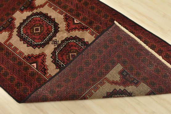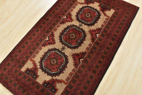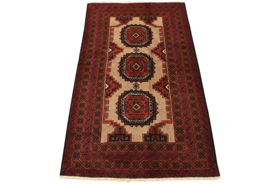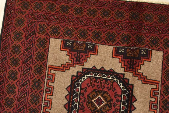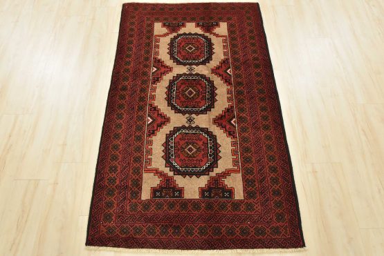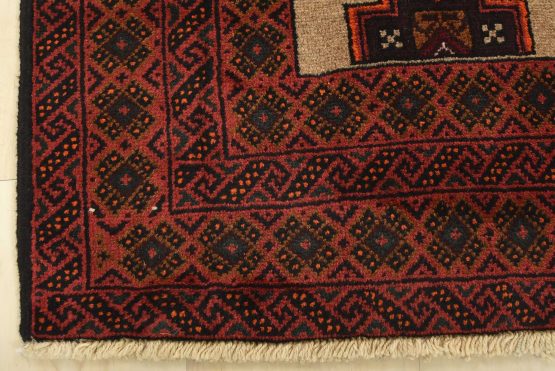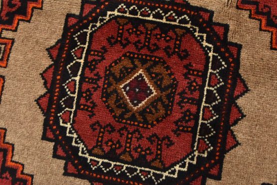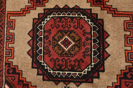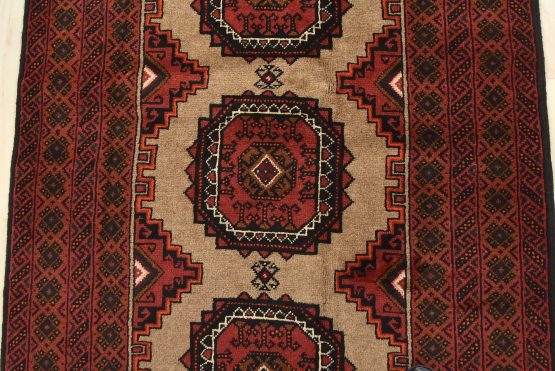 An authentic vintage tribal Baloch rug hand-knotted with fine wool and natural dyes. This nomadic oriental rug features geometric medallions set against a brown background. It has a full wool pile with no worn areas and is in very good condition.