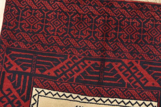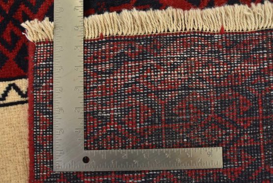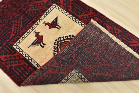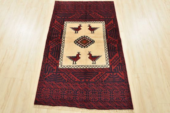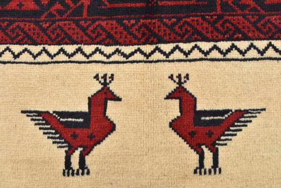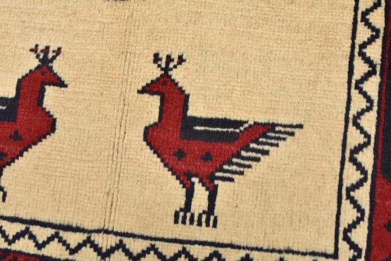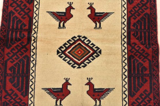 An authentic vintage tribal Baloch rug hand-knotted with fine wool and natural dyes. This nomadic oriental rug features a small central geometric medallion surrounded by geometric bird figures set against an ivory background. It has a full wool pile with no worn areas and is in very good condition.