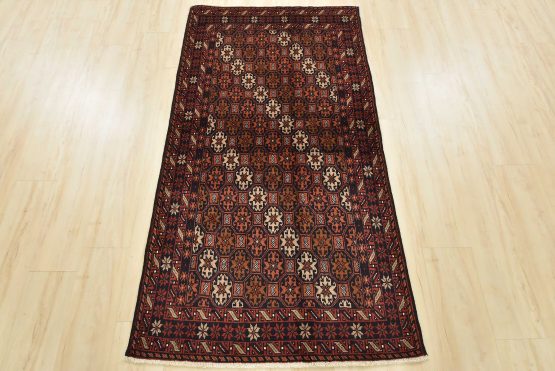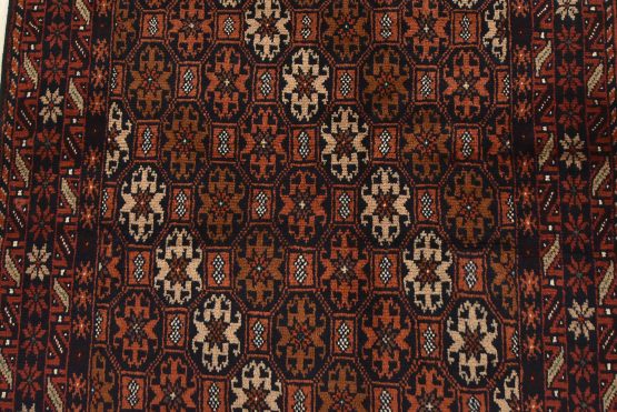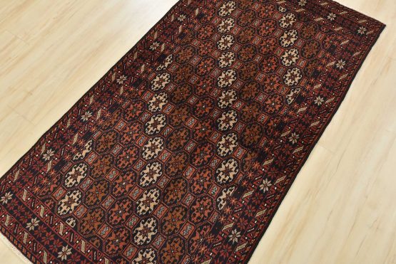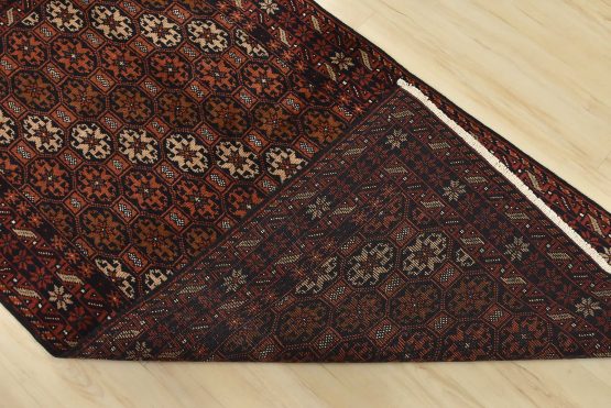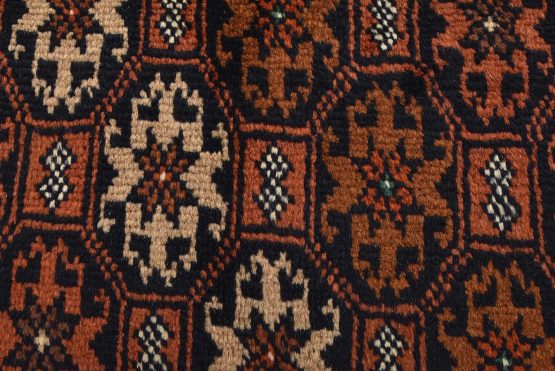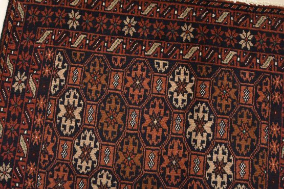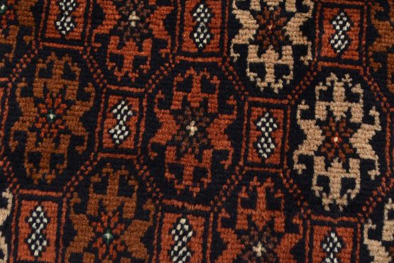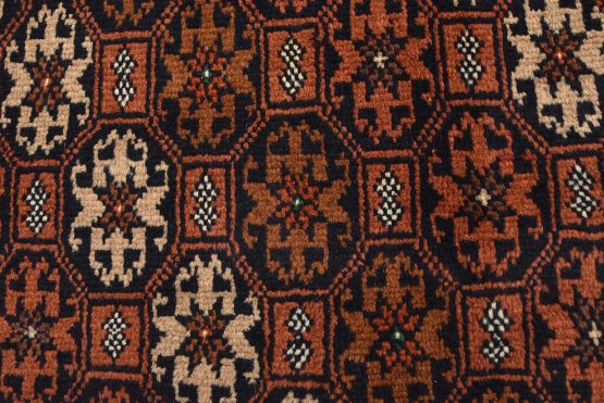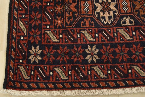 An authentic vintage tribal Baloch rug hand-knotted with fine wool and natural dyes. This nomadic oriental rug features an all-over pattern of geometric flowers set against a dark blue background. It has a full wool pile with no worn areas and is in very good condition.