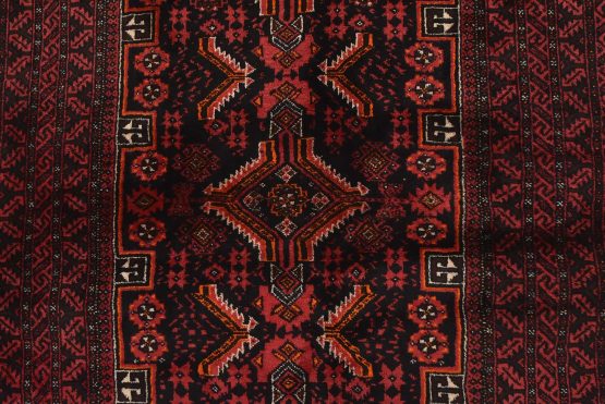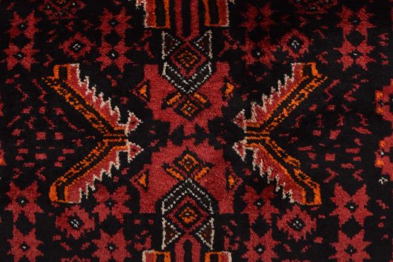 An authentic vintage tribal Baloch rug hand-knotted with fine wool and natural dyes. This nomadic oriental rug features small-scale geometric medallions surrounded by small geometric motifs set against a black background. It has a full wool pile with no worn areas and is in very good condition.