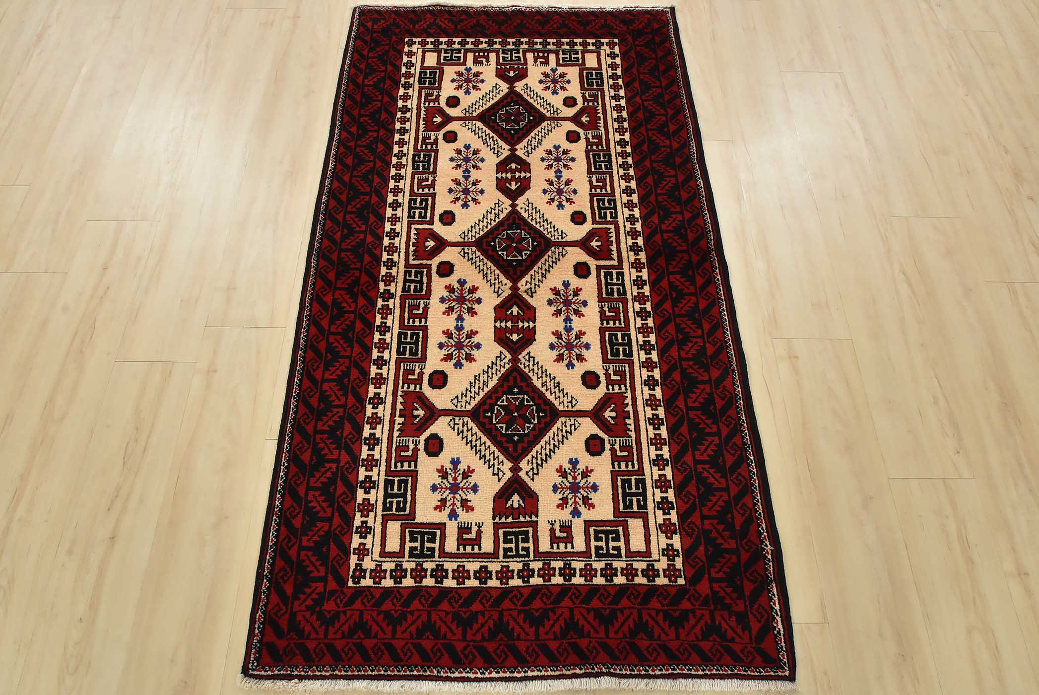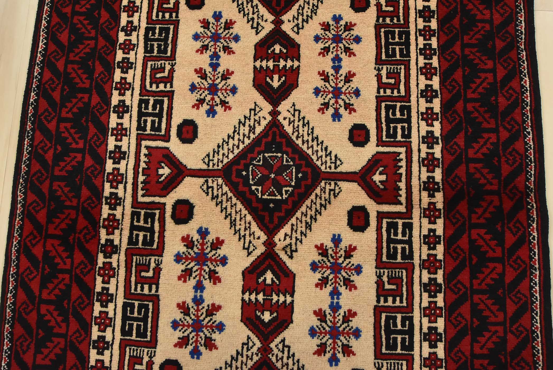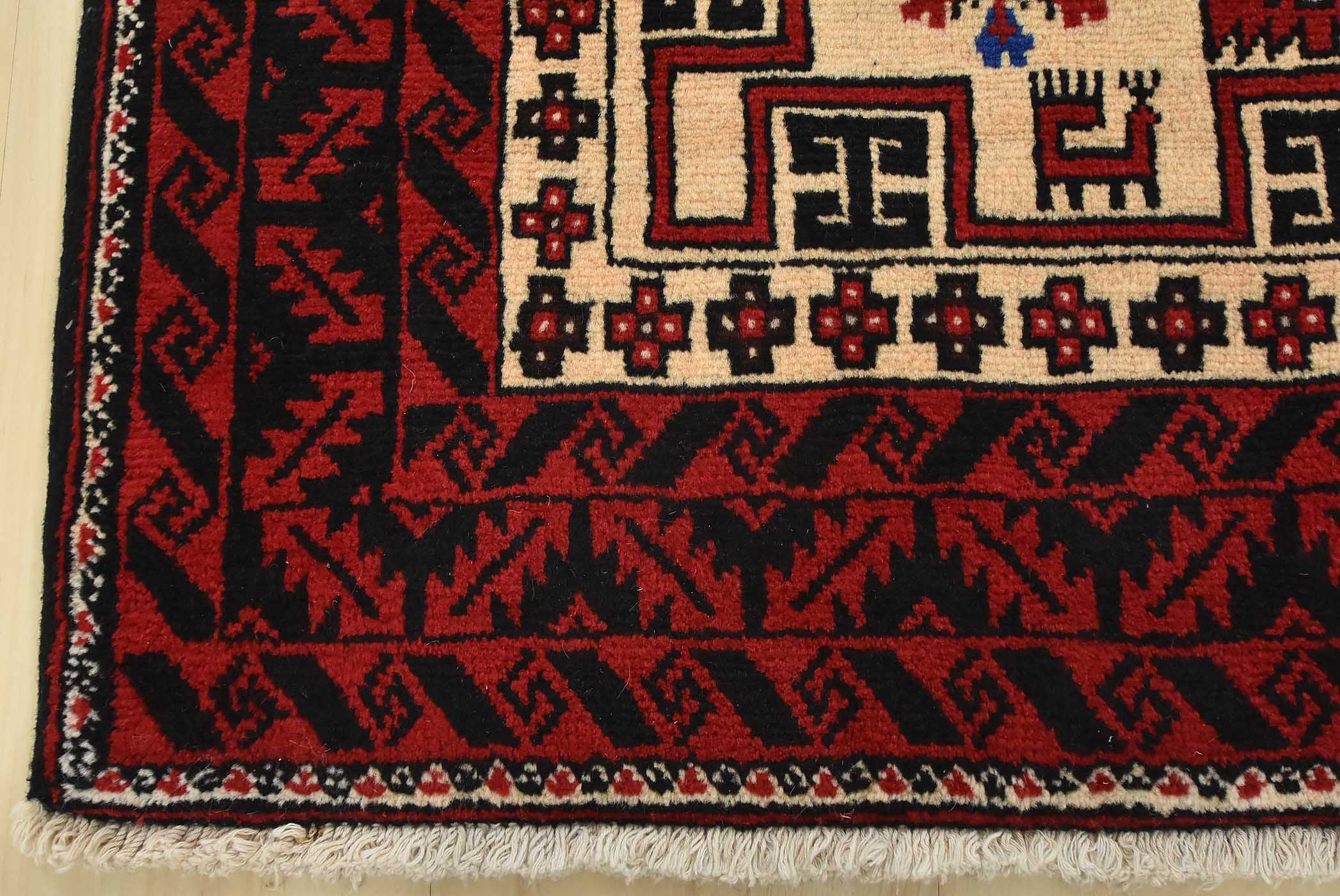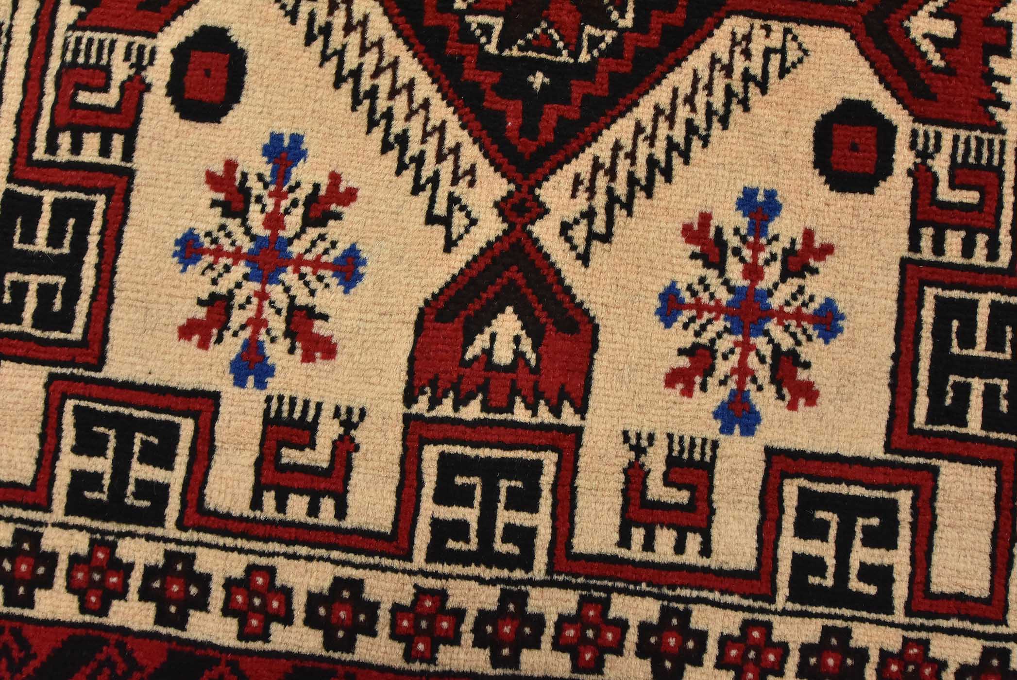 An authentic vintage tribal Baloch rug hand-knotted with fine wool and natural dyes. This nomadic rug features geometric medallions surrounded by animal figures and geometric motifs set against an ivory background. It has a full wool pile with no worn areas and is in very good condition.