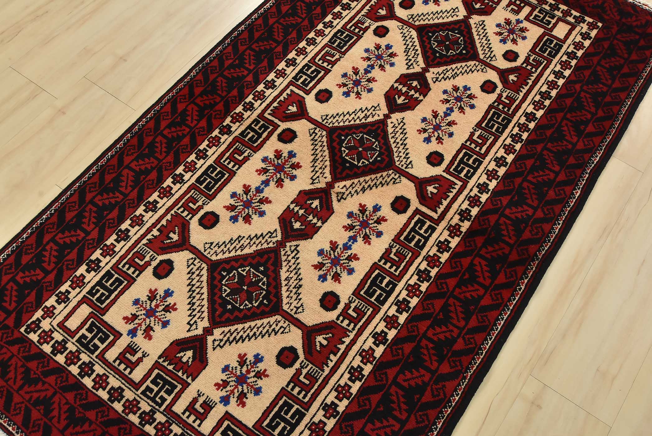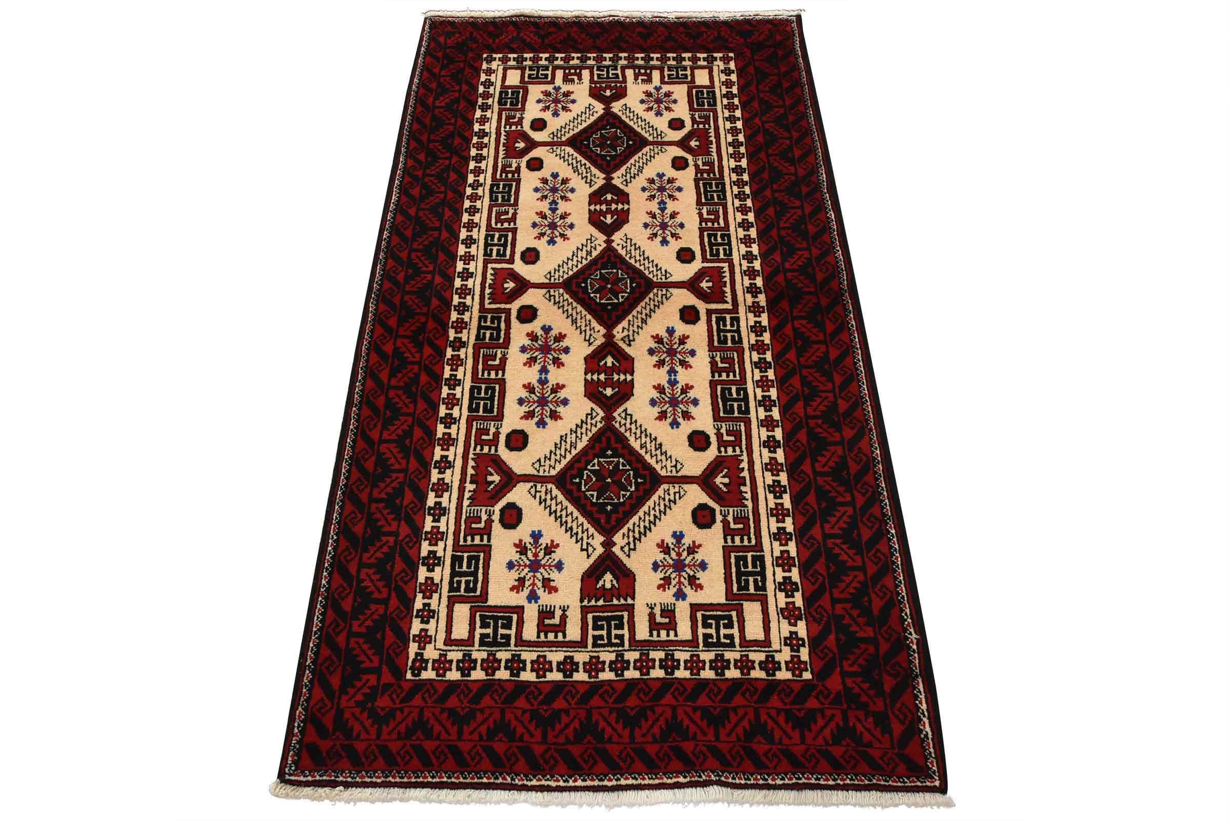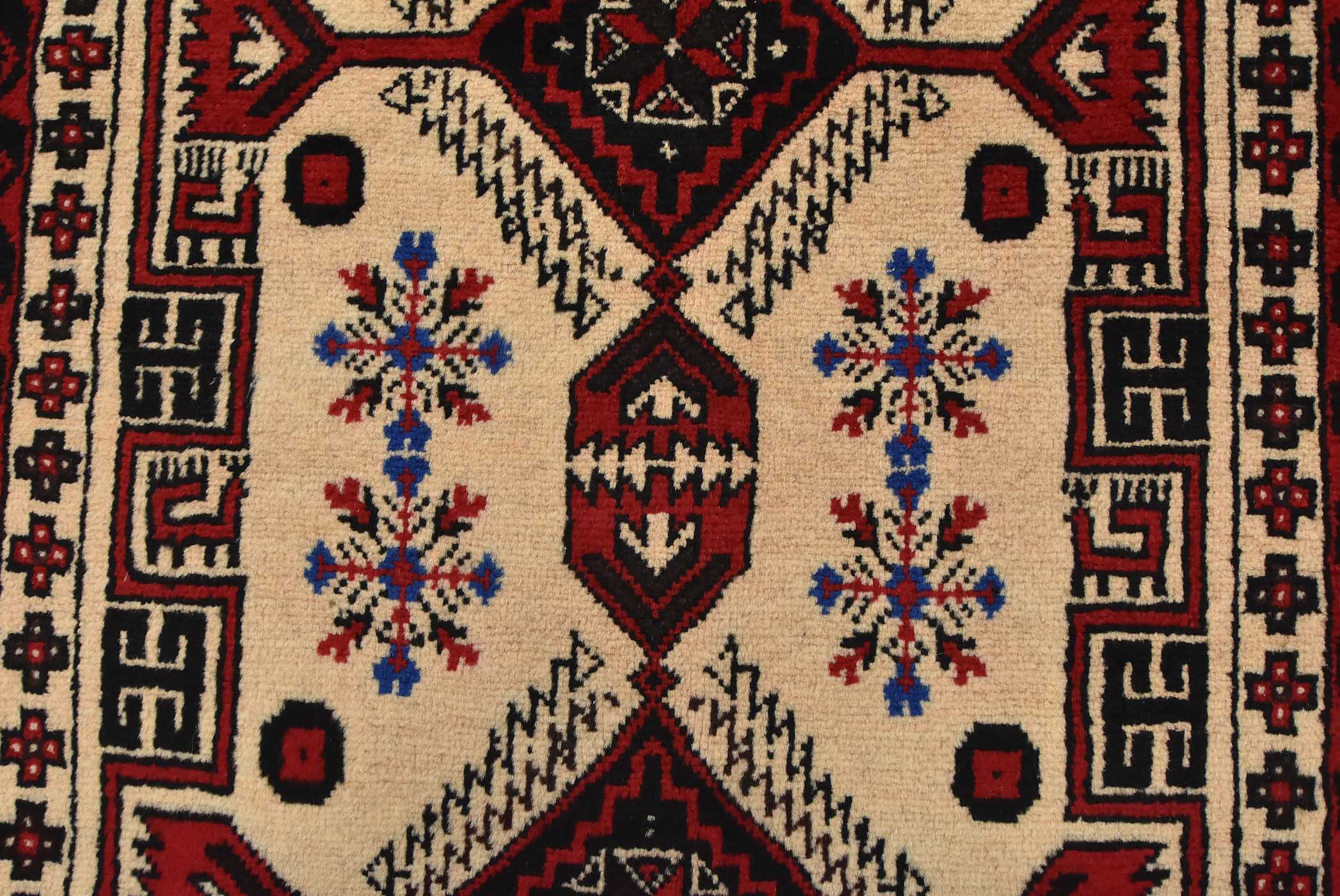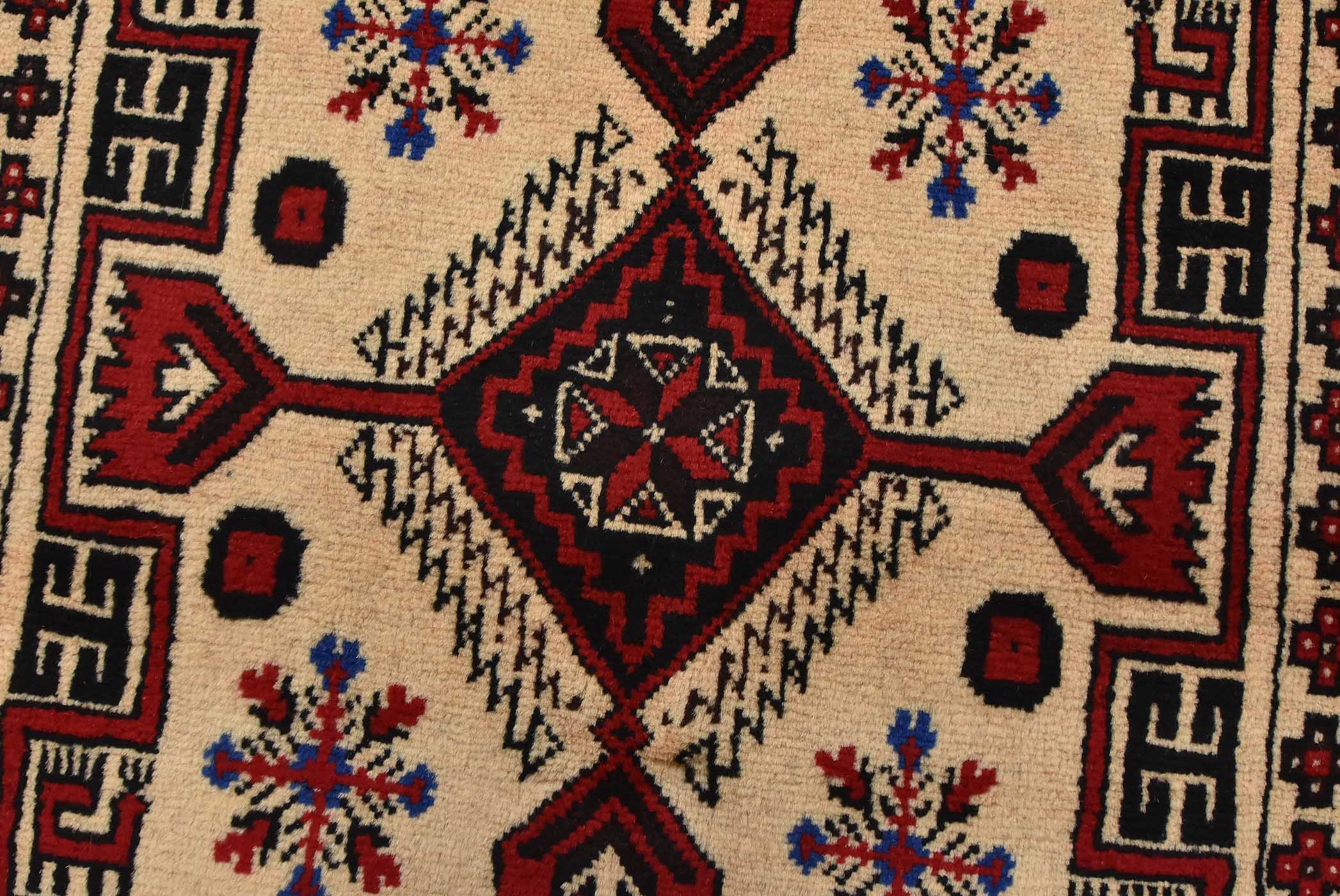 An authentic vintage tribal Baloch rug hand-knotted with fine wool and natural dyes. This nomadic rug features geometric medallions surrounded by animal figures and geometric motifs set against an ivory background. It has a full wool pile with no worn areas and is in very good condition.