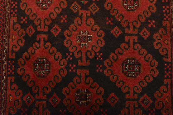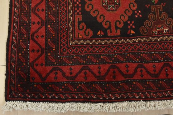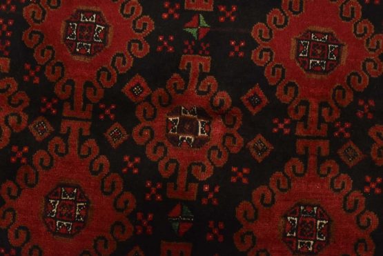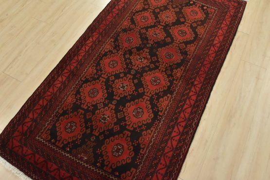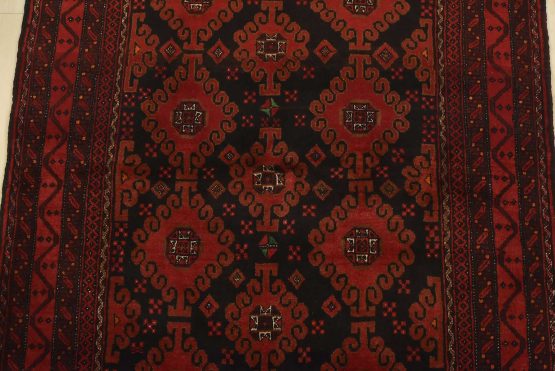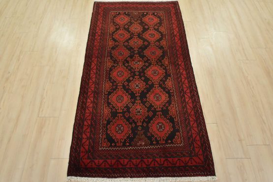 An authentic vintage tribal Baloch rug hand-knotted with fine wool and natural dyes. This nomadic oriental rug features rows of geometric medallions set against a black background. It has a full wool pile with no worn areas and is in very good condition.