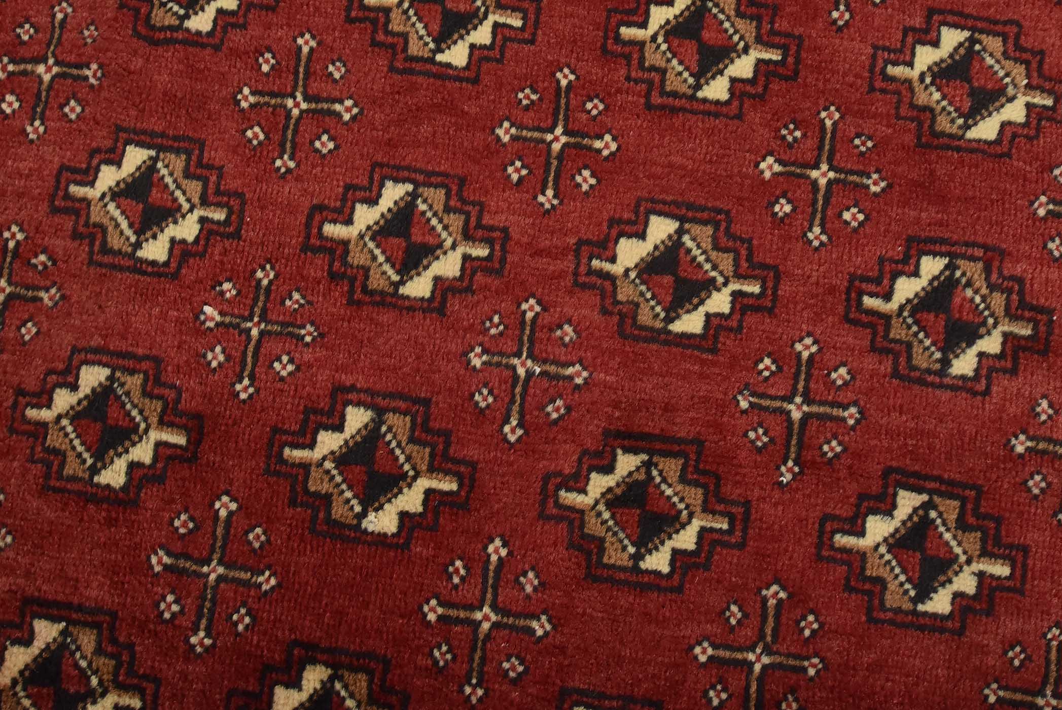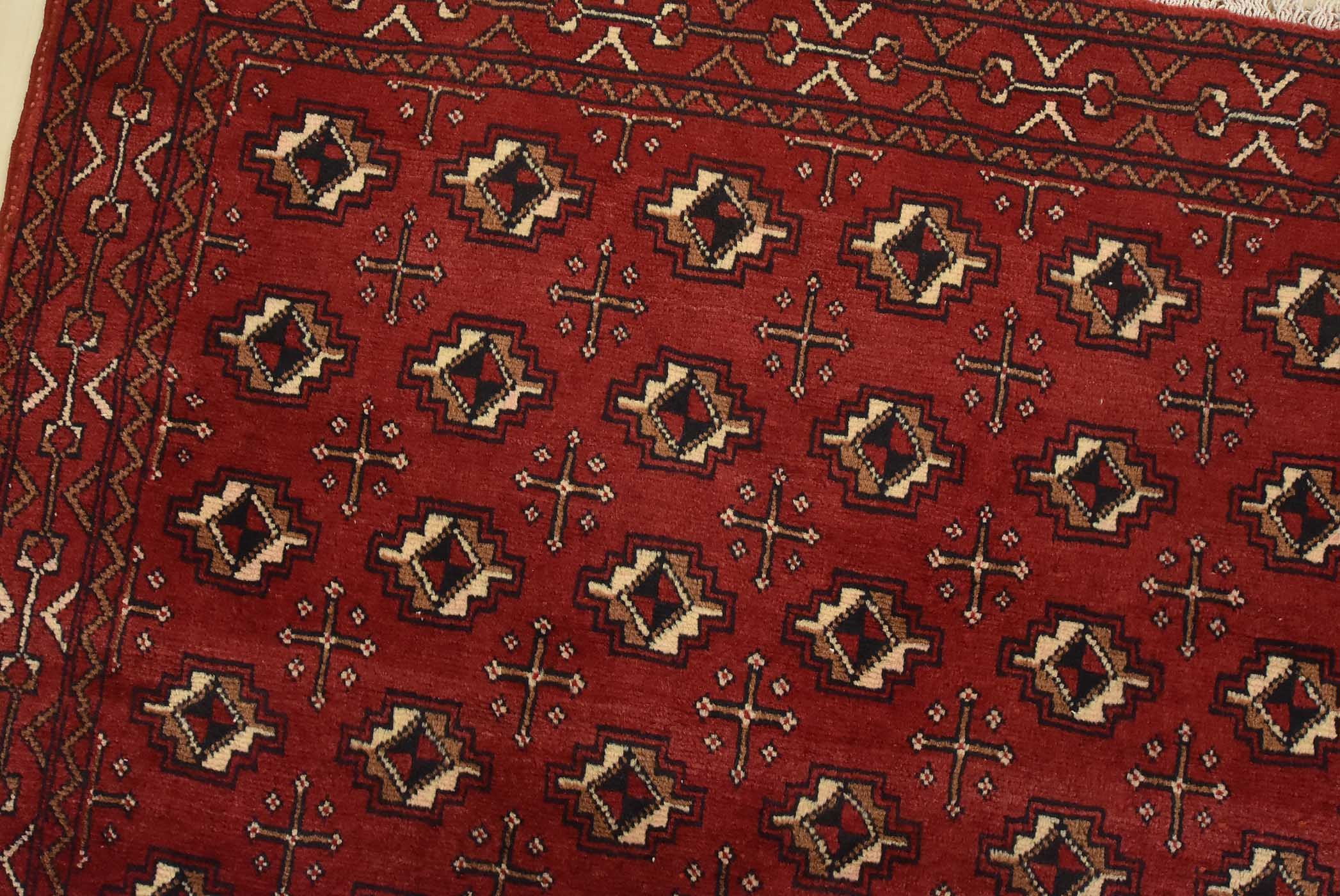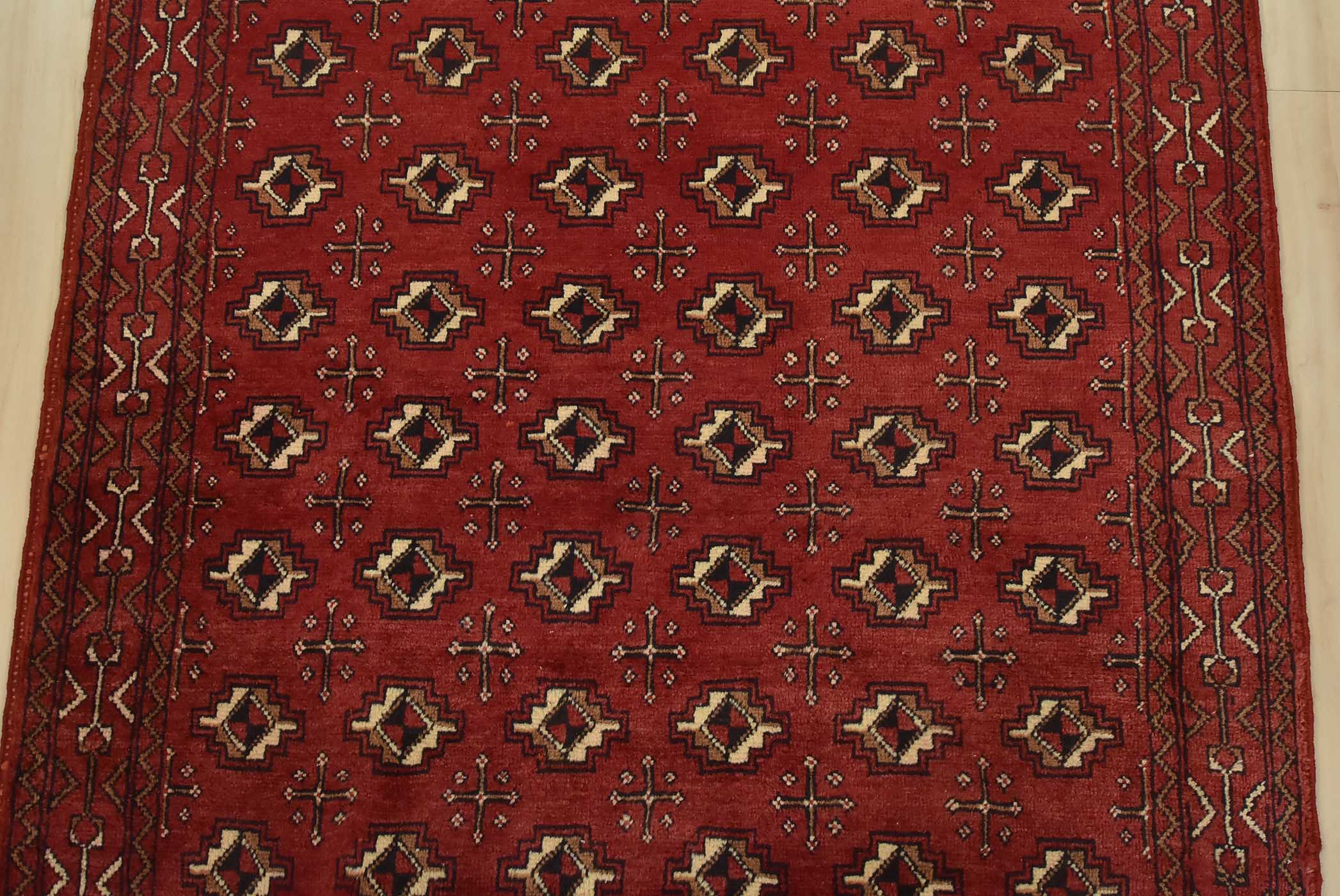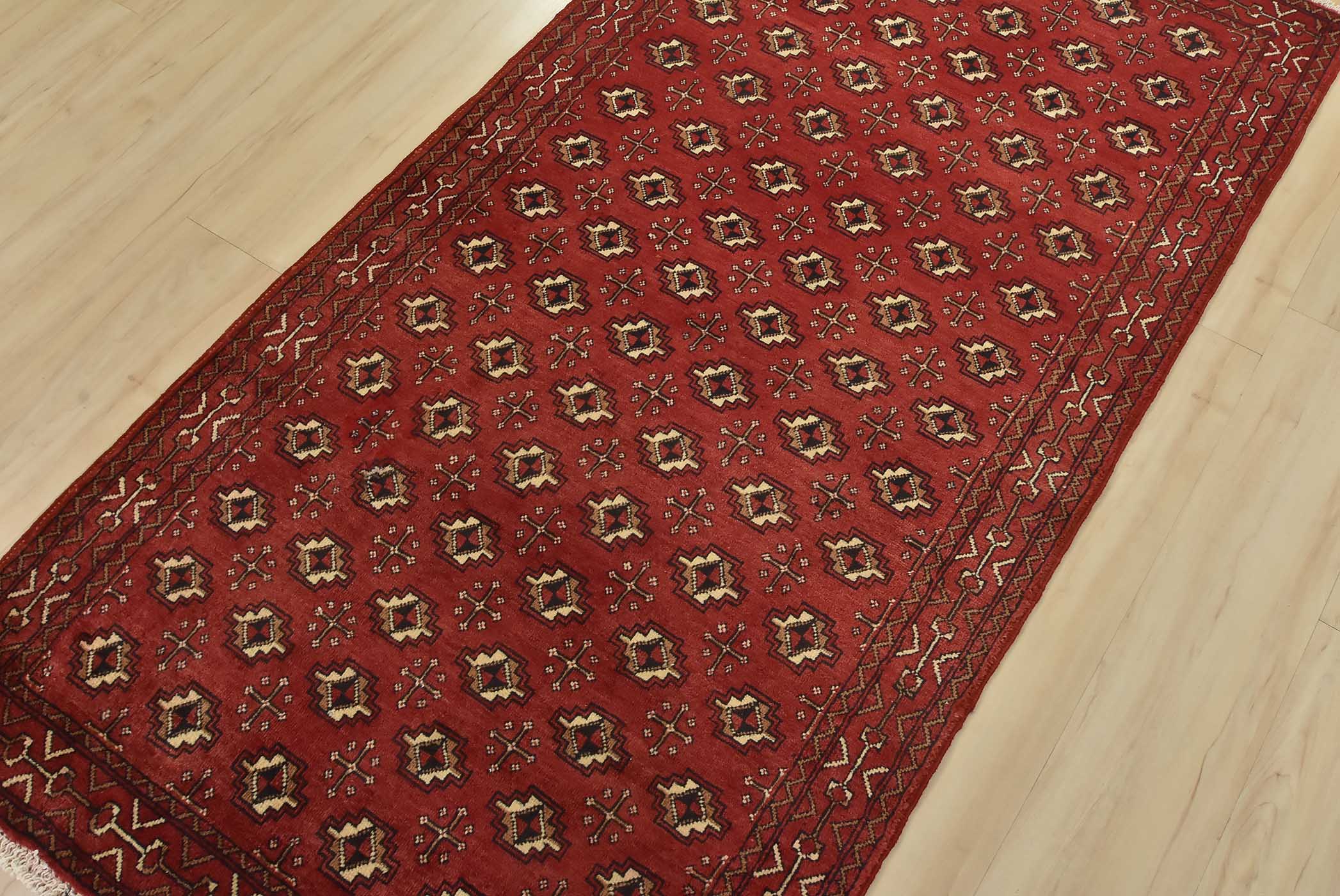 An authentic vintage tribal Baloch rug hand-knotted with fine wool and natural dyes. This nomadic rug features an all-over geometric pattern set against a red background. It has a full wool pile with no worn areas and is in very good condition.