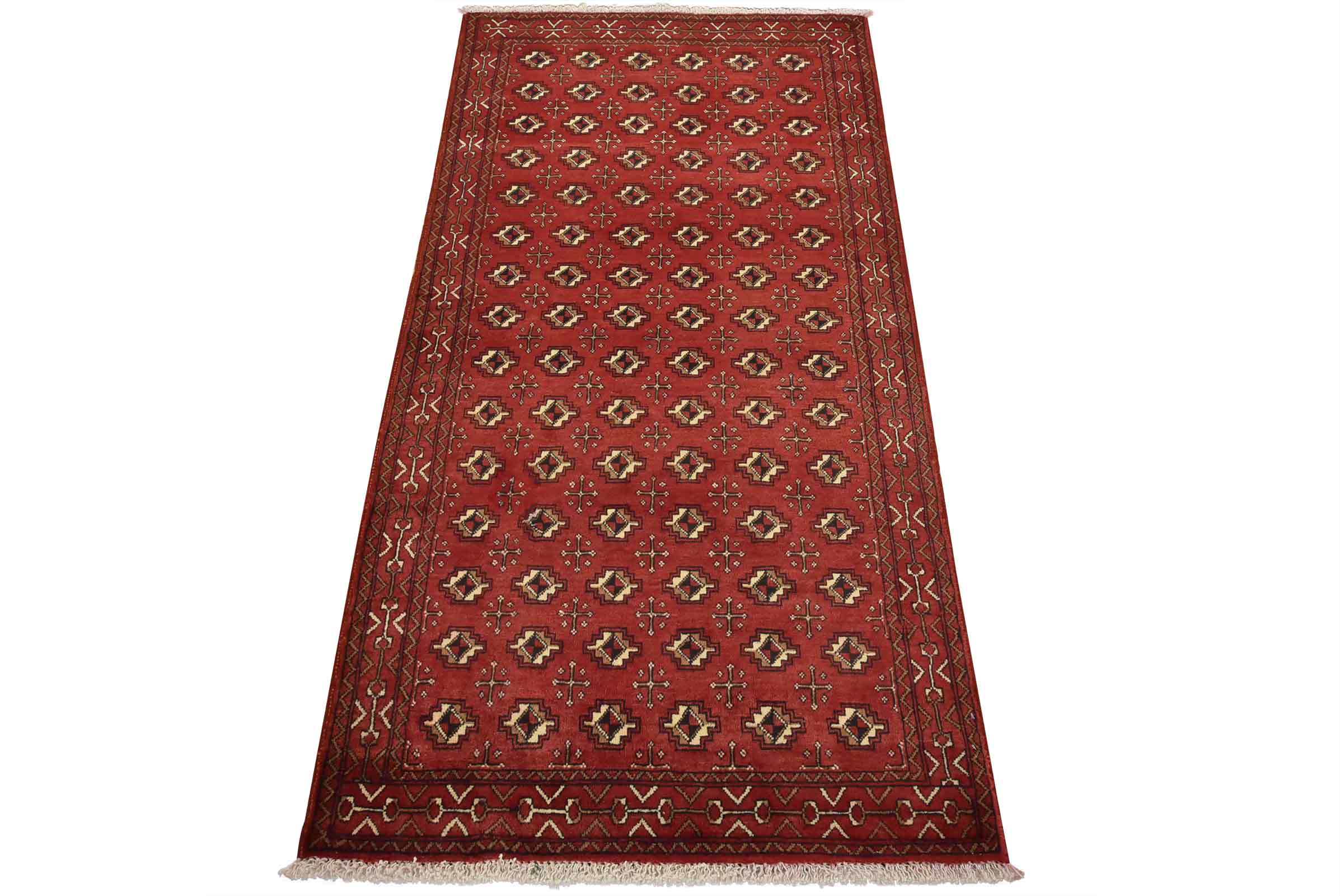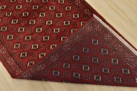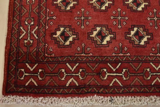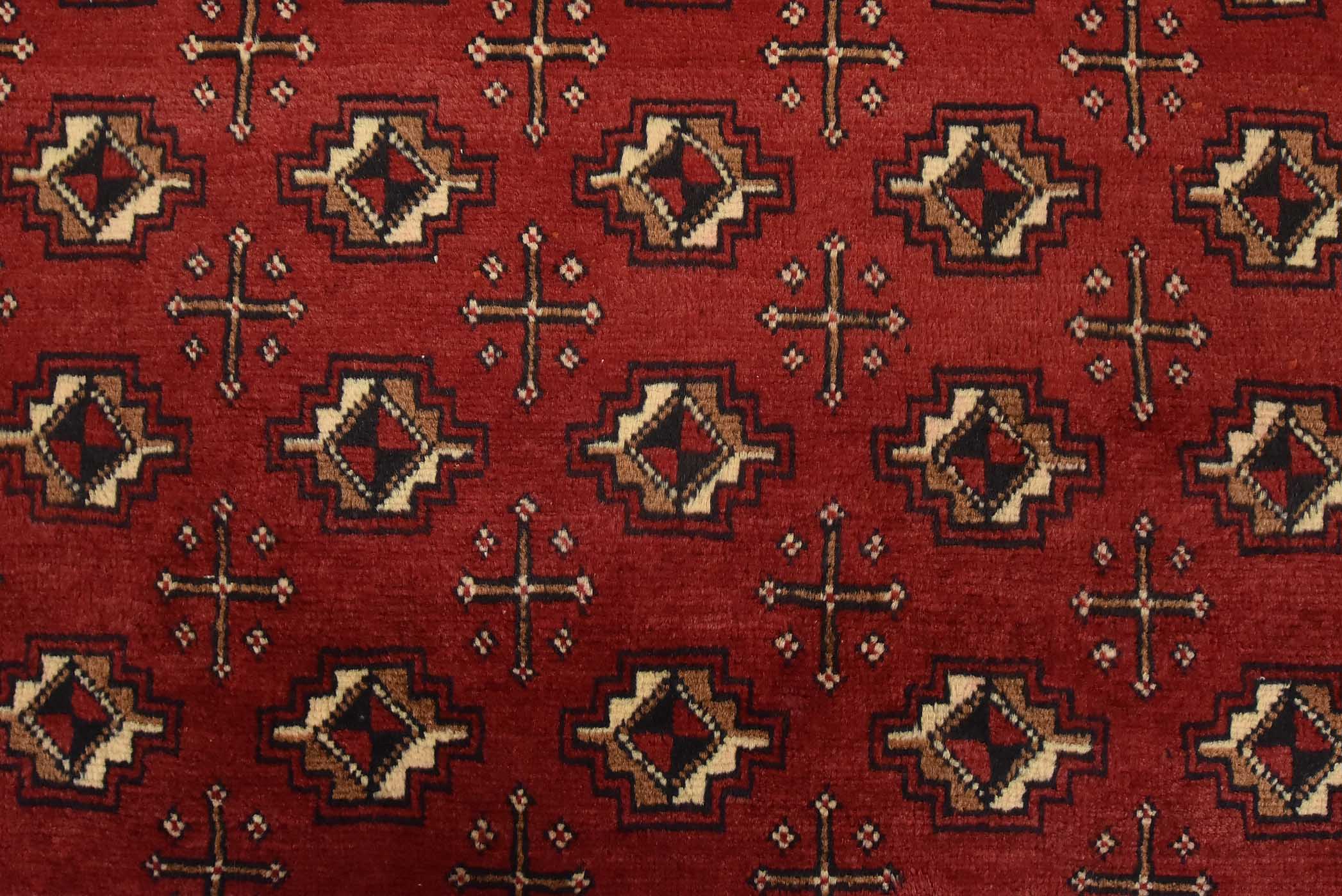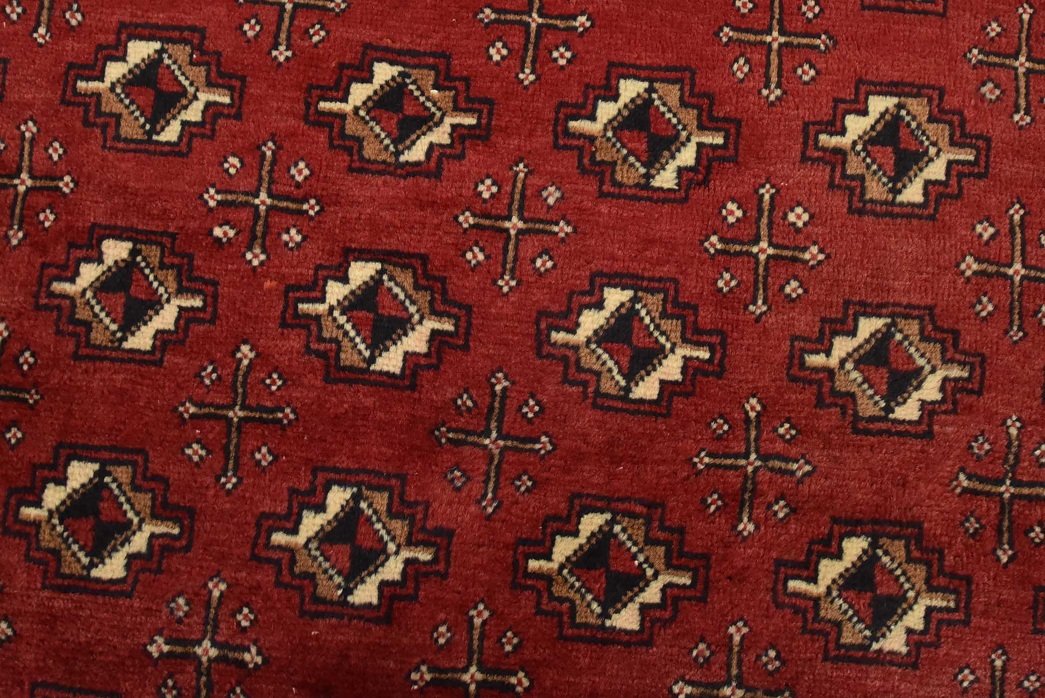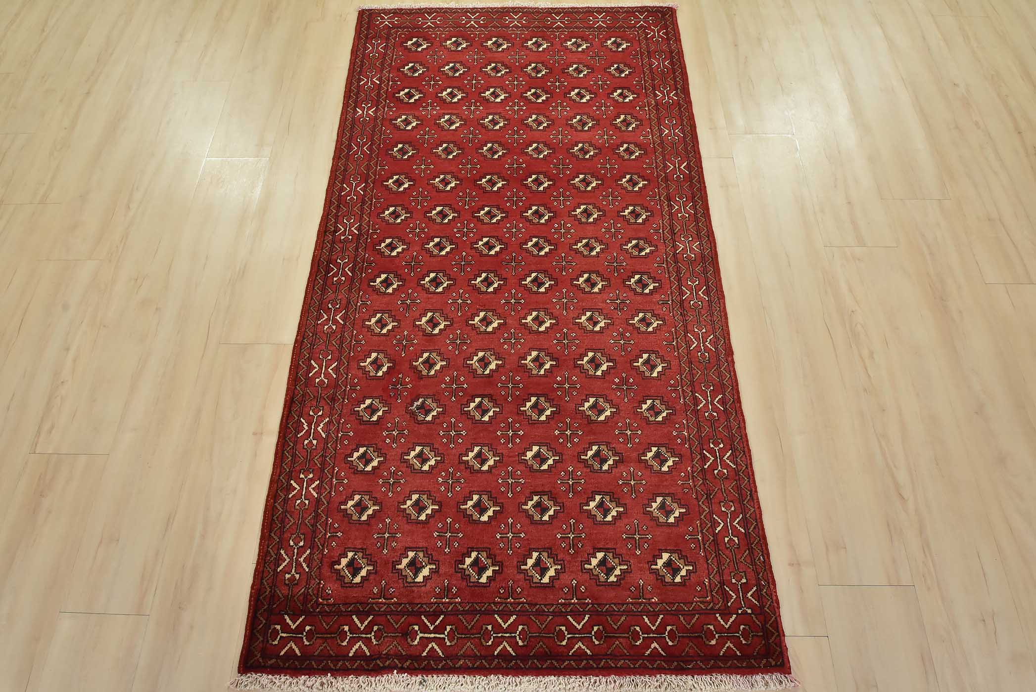 An authentic vintage tribal Baloch rug hand-knotted with fine wool and natural dyes. This nomadic rug features an all-over geometric pattern set against a red background. It has a full wool pile with no worn areas and is in very good condition.