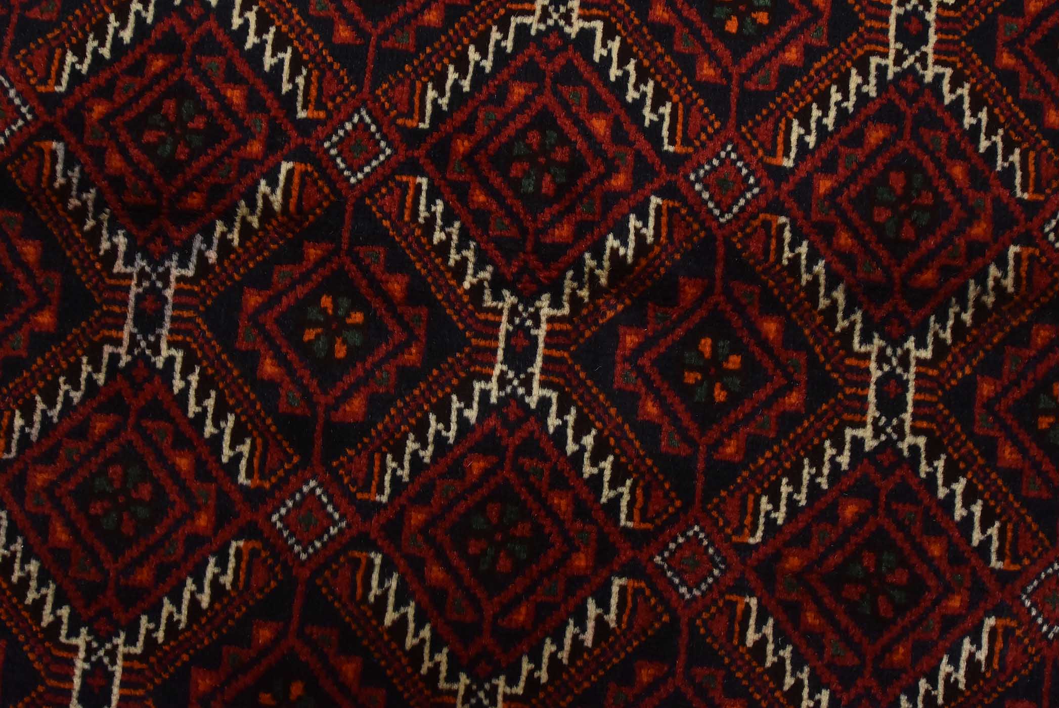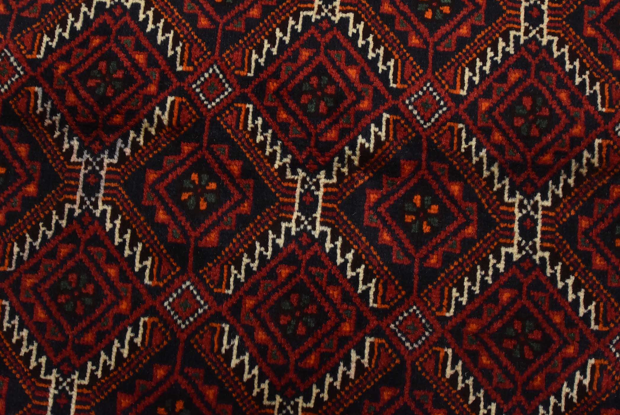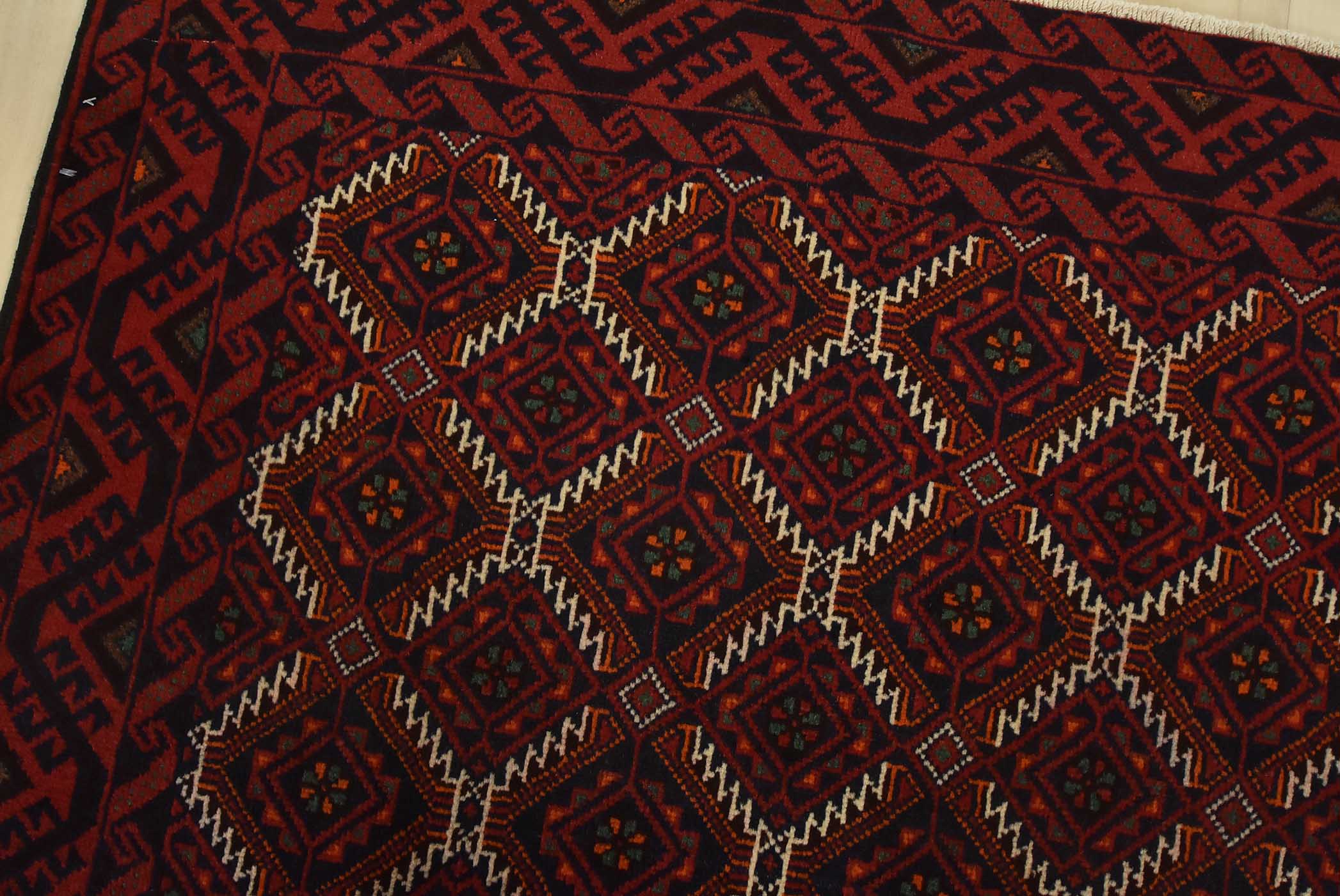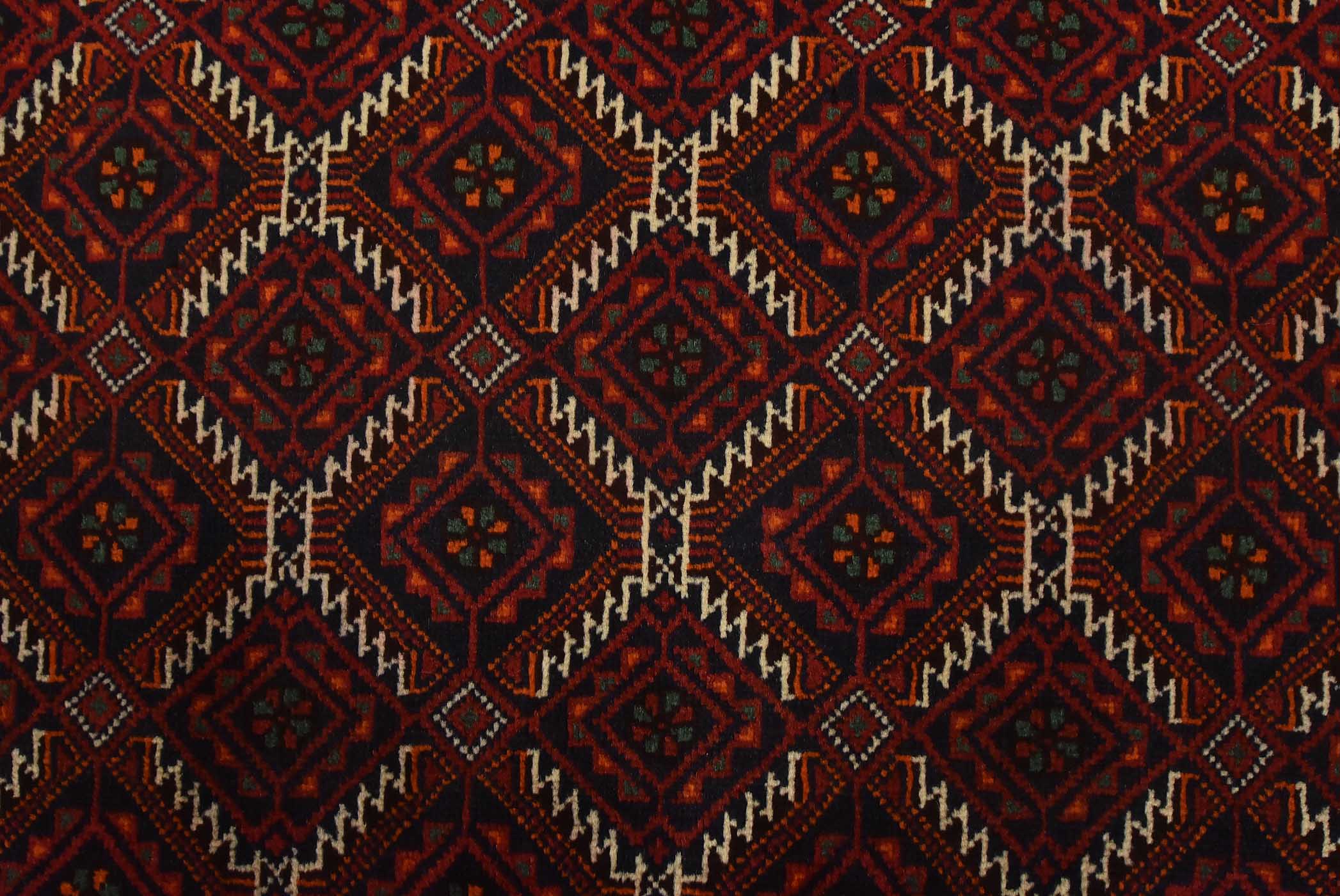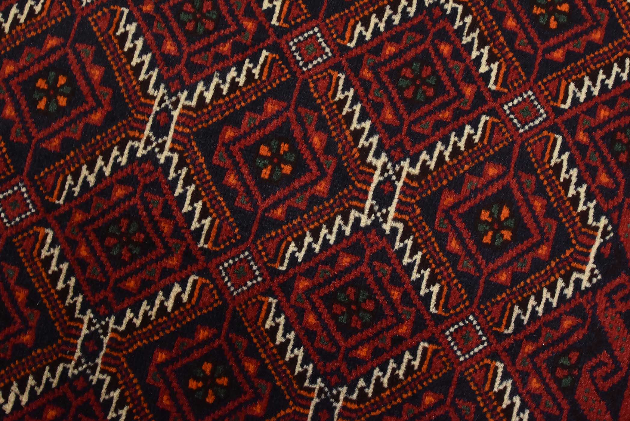 An authentic vintage tribal Baloch rug hand-knotted with fine wool and natural dyes. This nomadic carpet features an all-over geometric pattern set against a dark blue background. It has a full wool pile with no worn areas and is in very good condition.