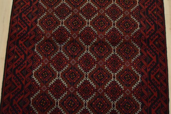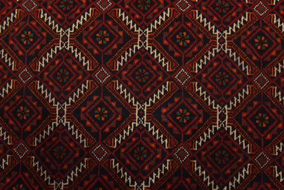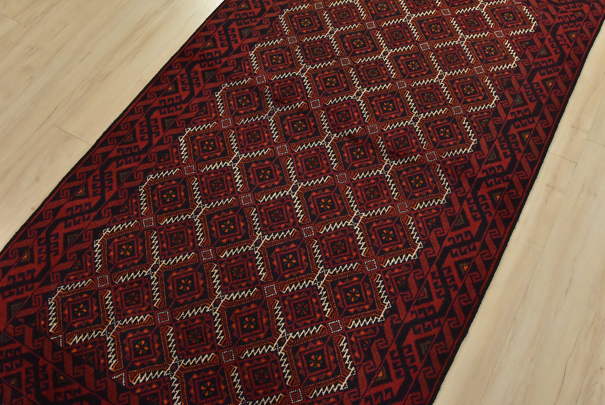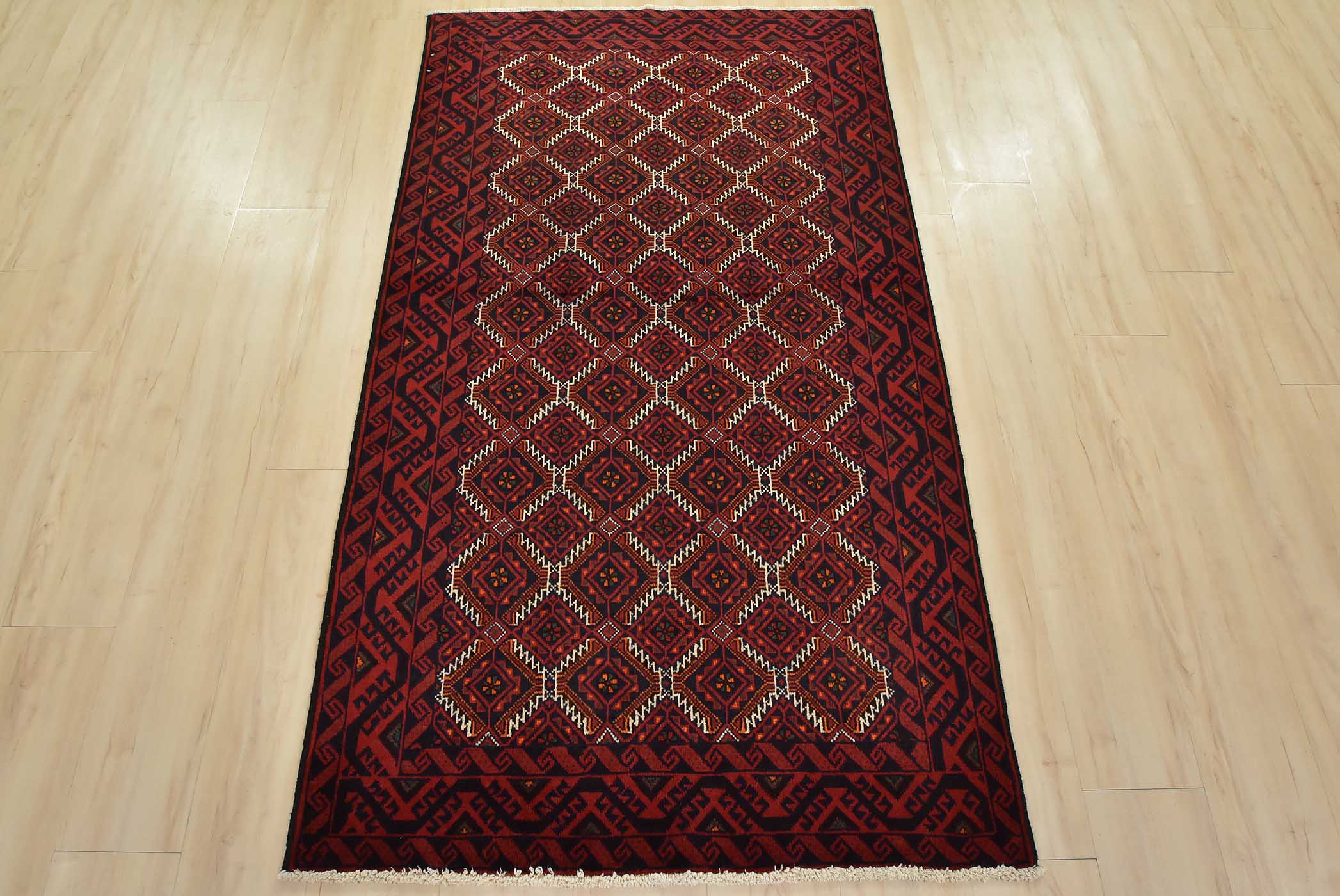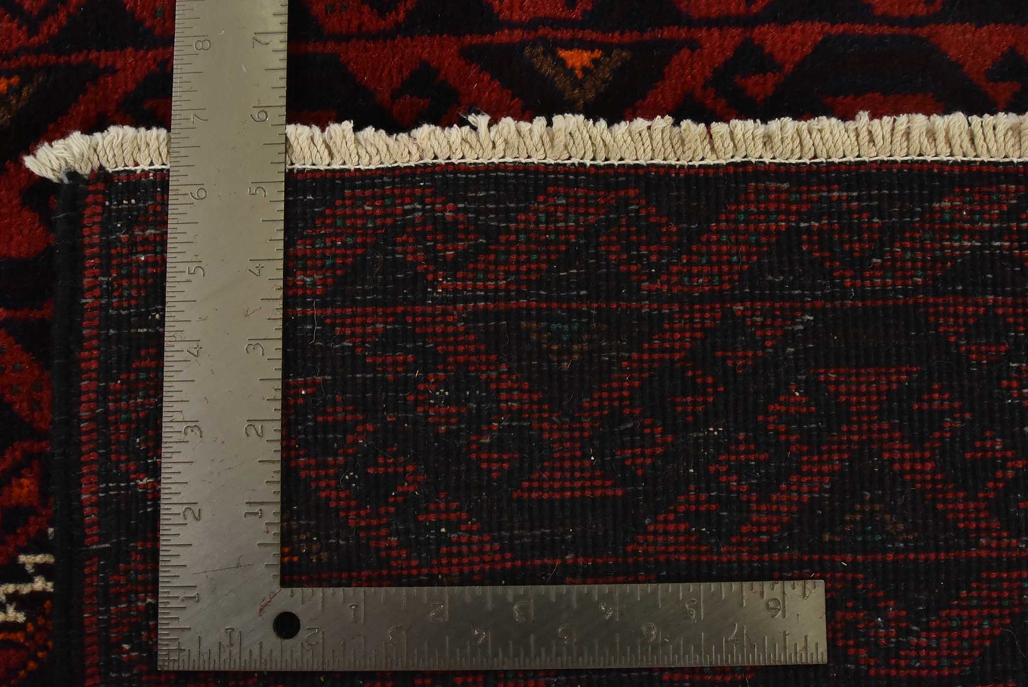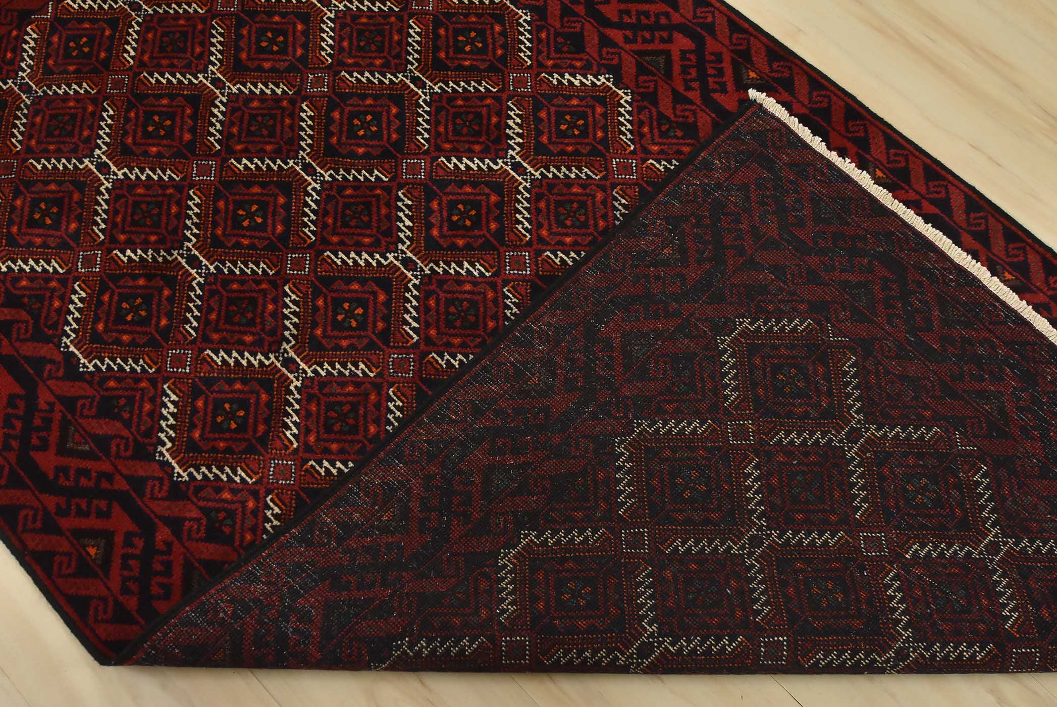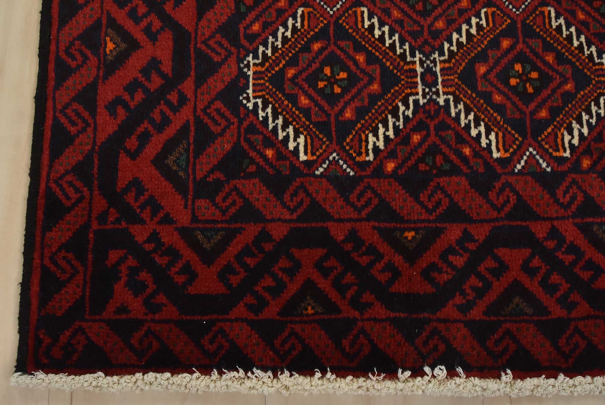 An authentic vintage tribal Baloch rug hand-knotted with fine wool and natural dyes. This nomadic carpet features an all-over geometric pattern set against a dark blue background. It has a full wool pile with no worn areas and is in very good condition.
