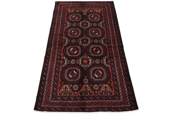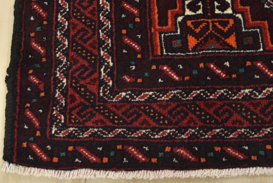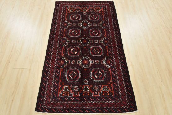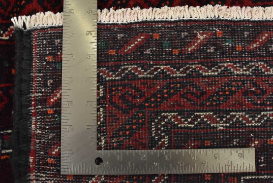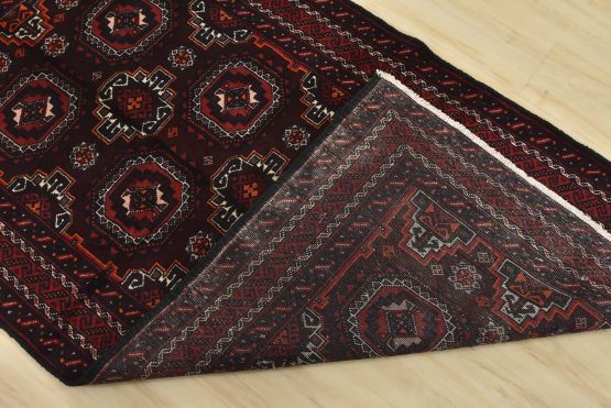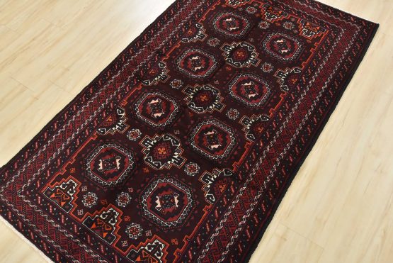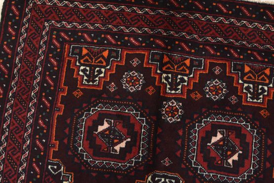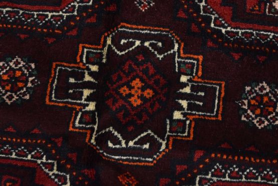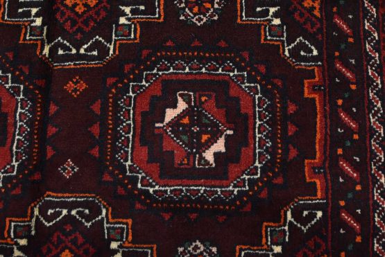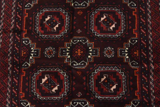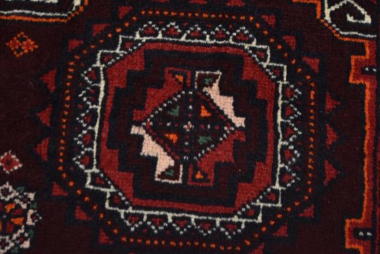 An authentic vintage tribal Baloch rug hand-knotted with fine wool and natural dyes. This oriental rug features rows of repeating geometric medallions set against a dark red background. It has a full wool pile with no worn areas and is in very good condition.