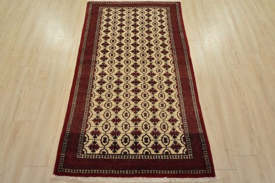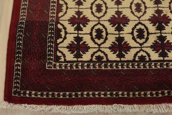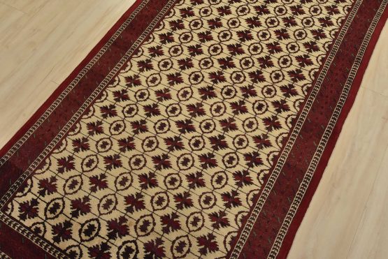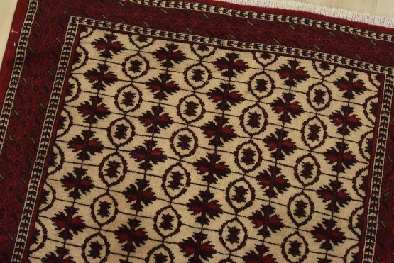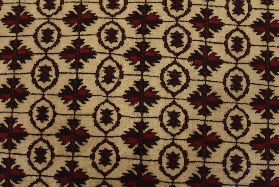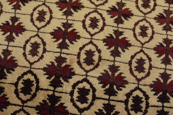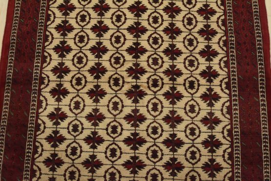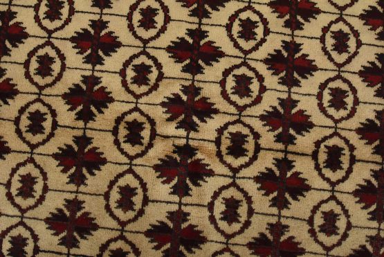 An authentic vintage tribal Baloch rug hand-knotted with fine wool and natural dyes. This nomadic oriental rug features rows of repeating oval and geometric motifs set against a beige background. The wool pile shows some minor wear; please refer to the photos. Otherwise, the rug is in very good condition.