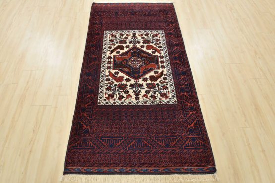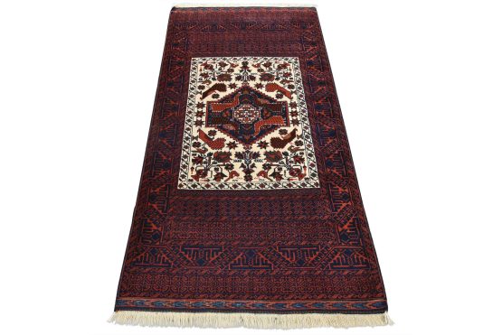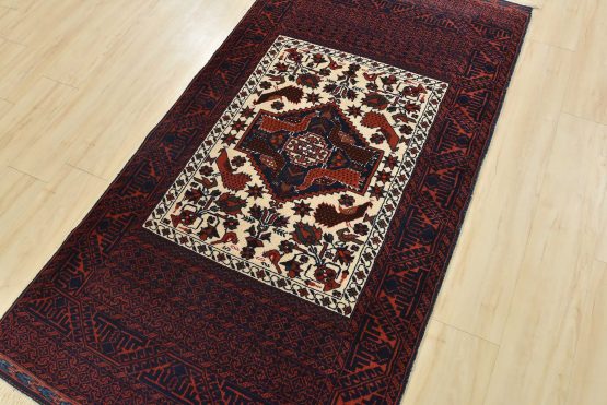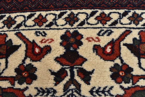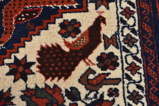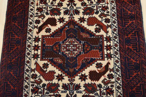 An authentic vintage tribal Baloch rug hand-knotted with fine wool and natural dyes. This nomadic oriental rug features a central geometric medallion surrounded by geometric floral motifs and bird figures set against an ivory background. It has a full wool pile with no worn areas and is in very good condition.