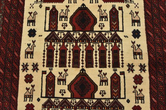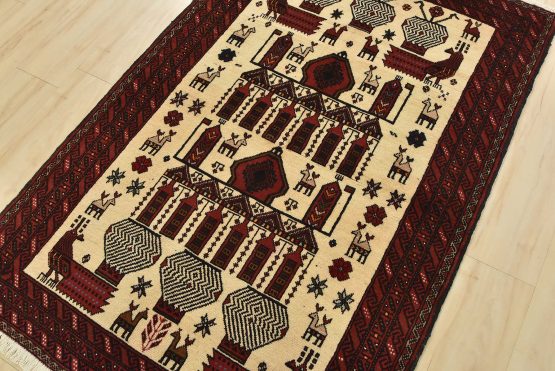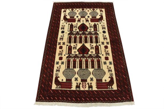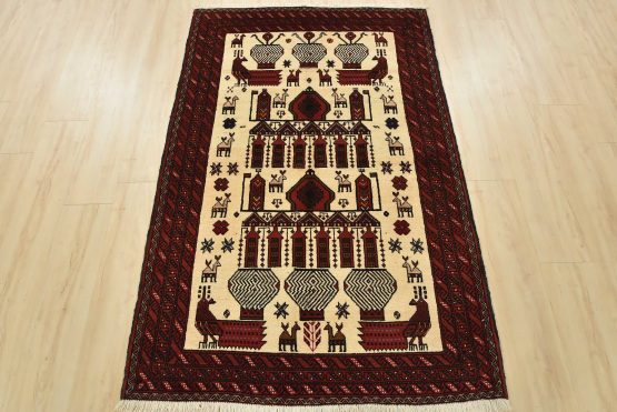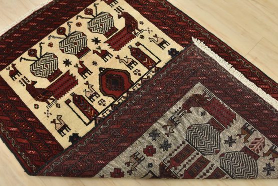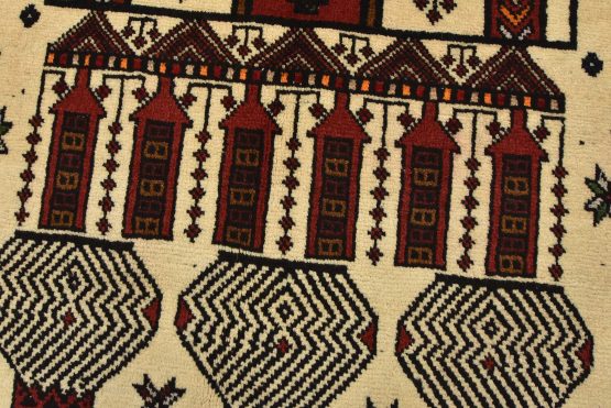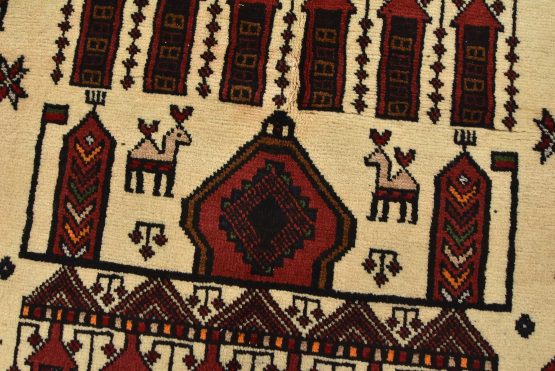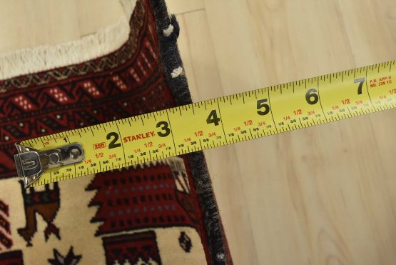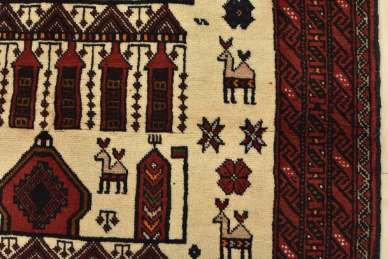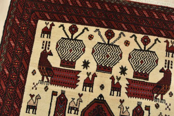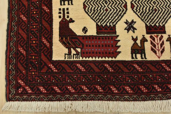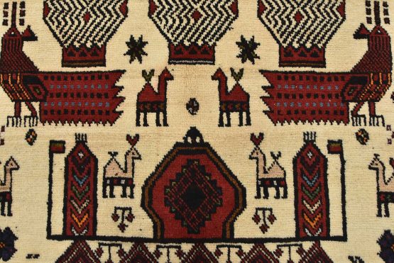 An authentic vintage tribal Baloch rug hand-knotted with fine wool and natural dyes. This nomadic oriental rug features a geometric design surrounded by geometric bird and animal figures. It has a full wool pile with no worn areas and is in very good condition.